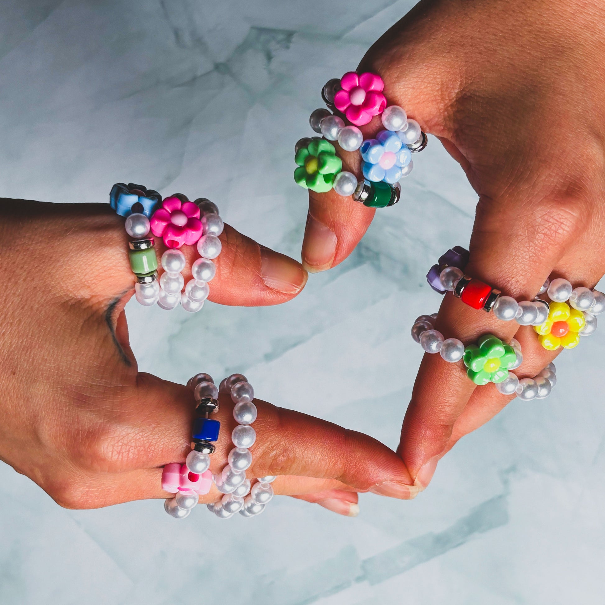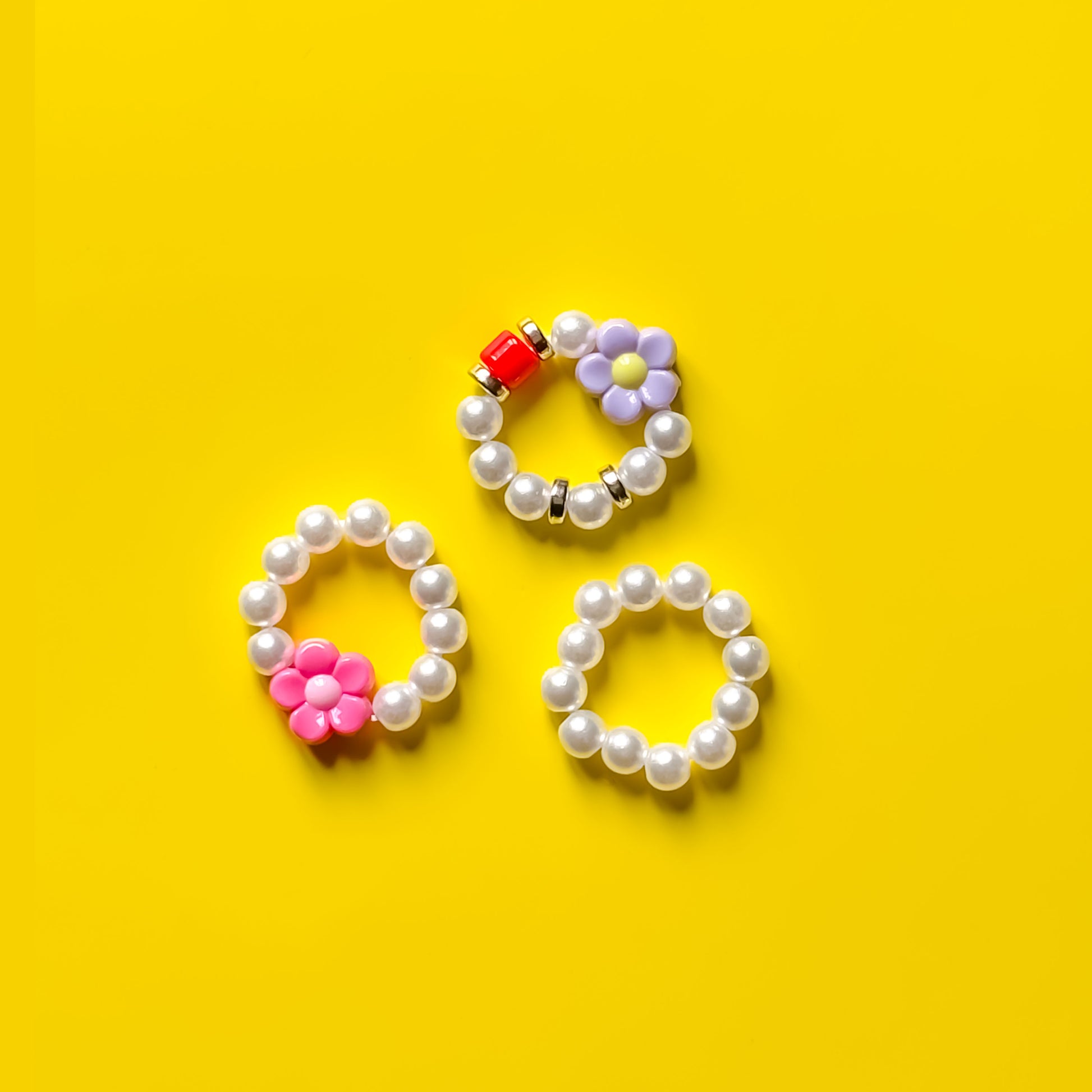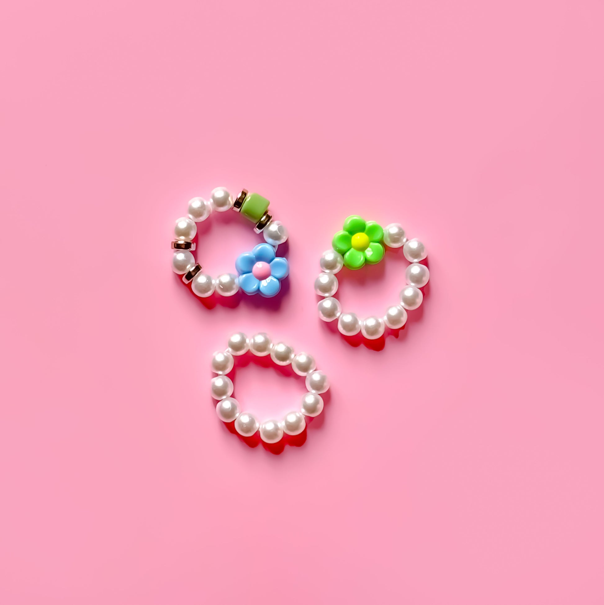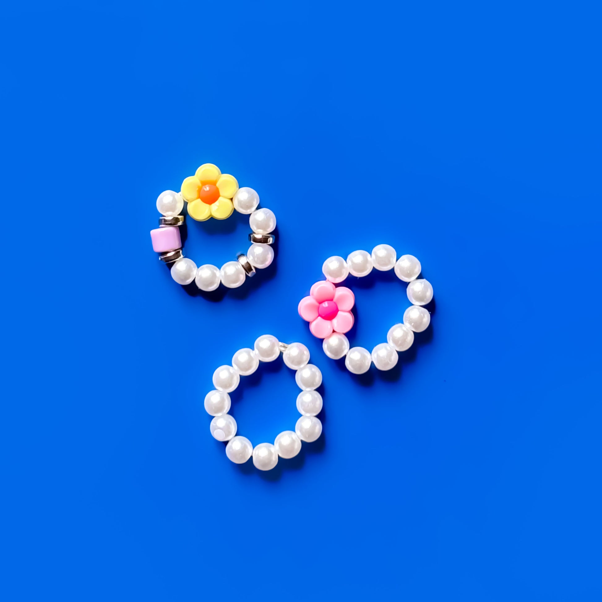 These floral pearl rings are the perfect way to add a little play to your summer fit. The Flower·ring Set comes with three elastic rings featuring small, round faux pearls with acrylic and brass accents. Each ring in the set of three is different. Available in five colorways: pink, blue, green, purple and yellow. Made with lightweight pearl, brass, ceramic and acrylic beads.