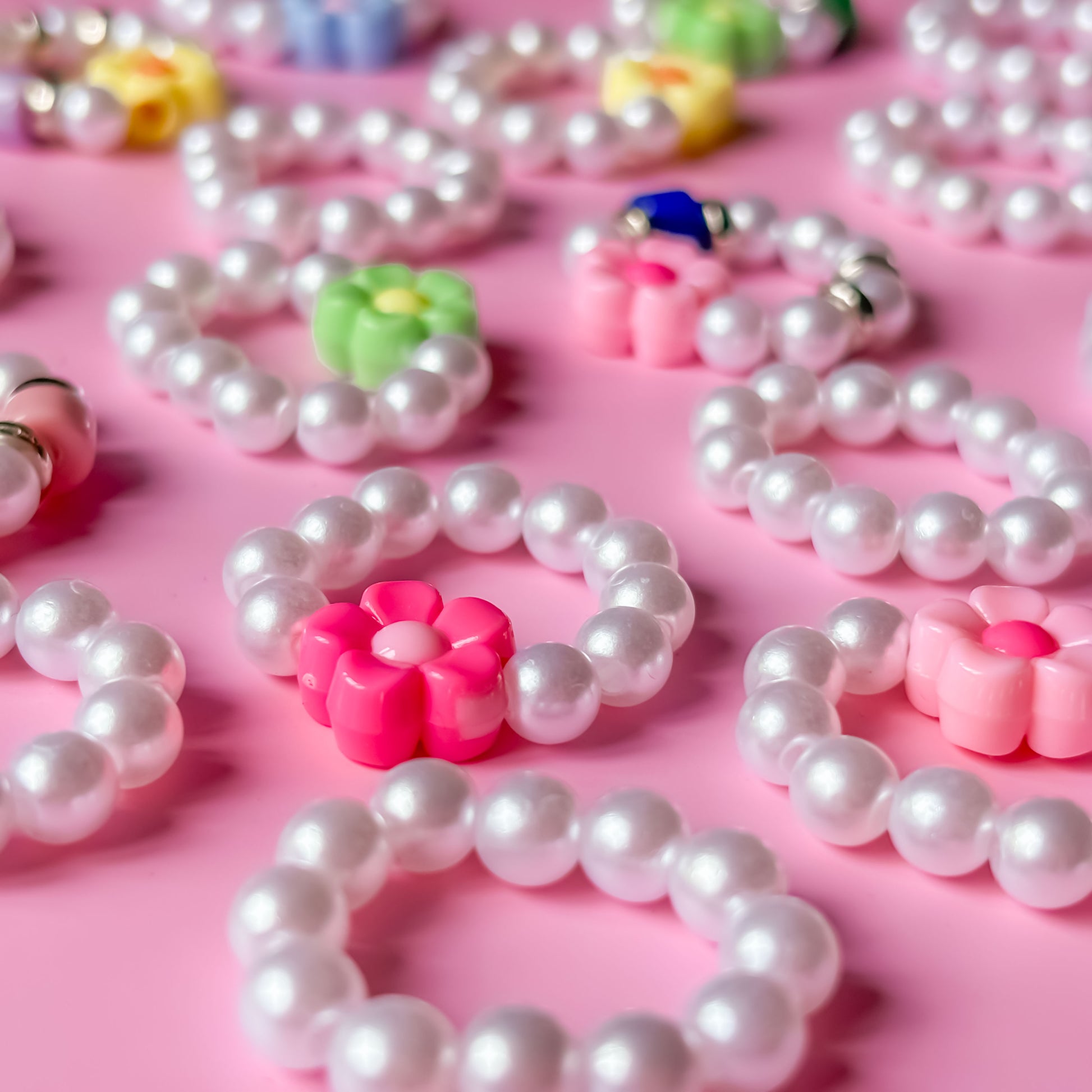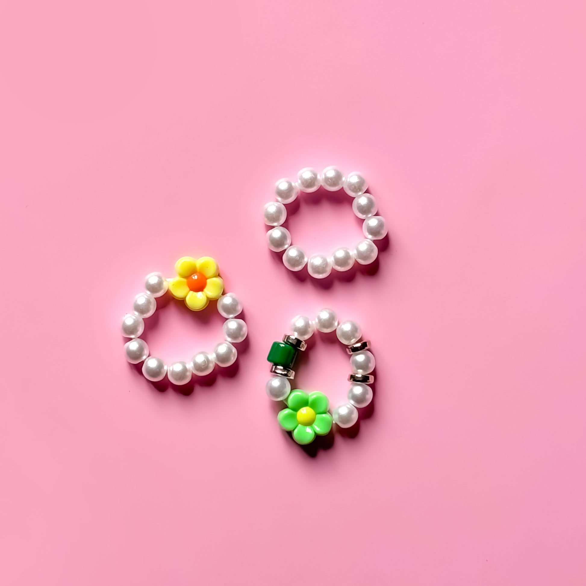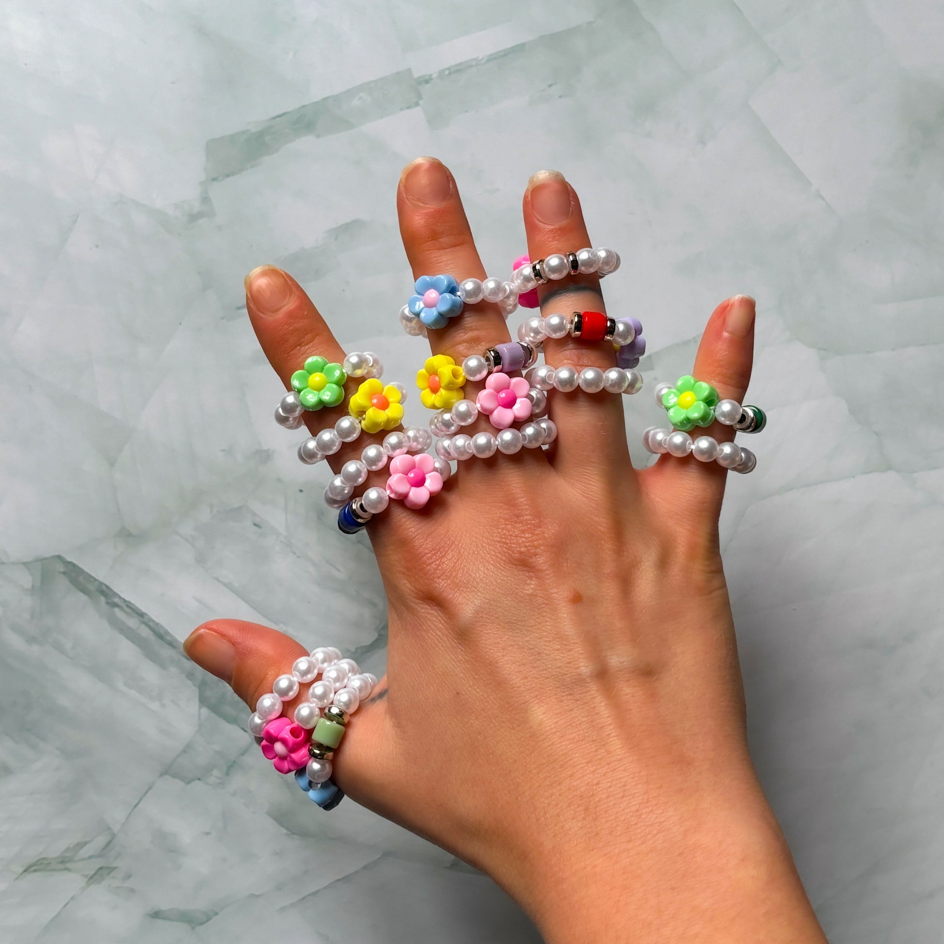 These floral pearl rings are the perfect way to add a little play to your summer fit. The Flower·ring Set comes with three elastic rings featuring small, round faux pearls with acrylic and brass accents. Each ring in the set of three is different. Available in five colorways: pink, blue, green, purple and yellow. Made with lightweight pearl, brass, ceramic and acrylic beads.