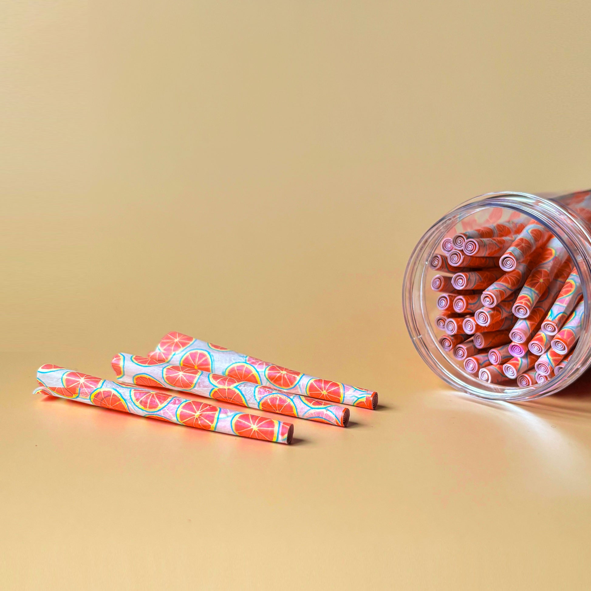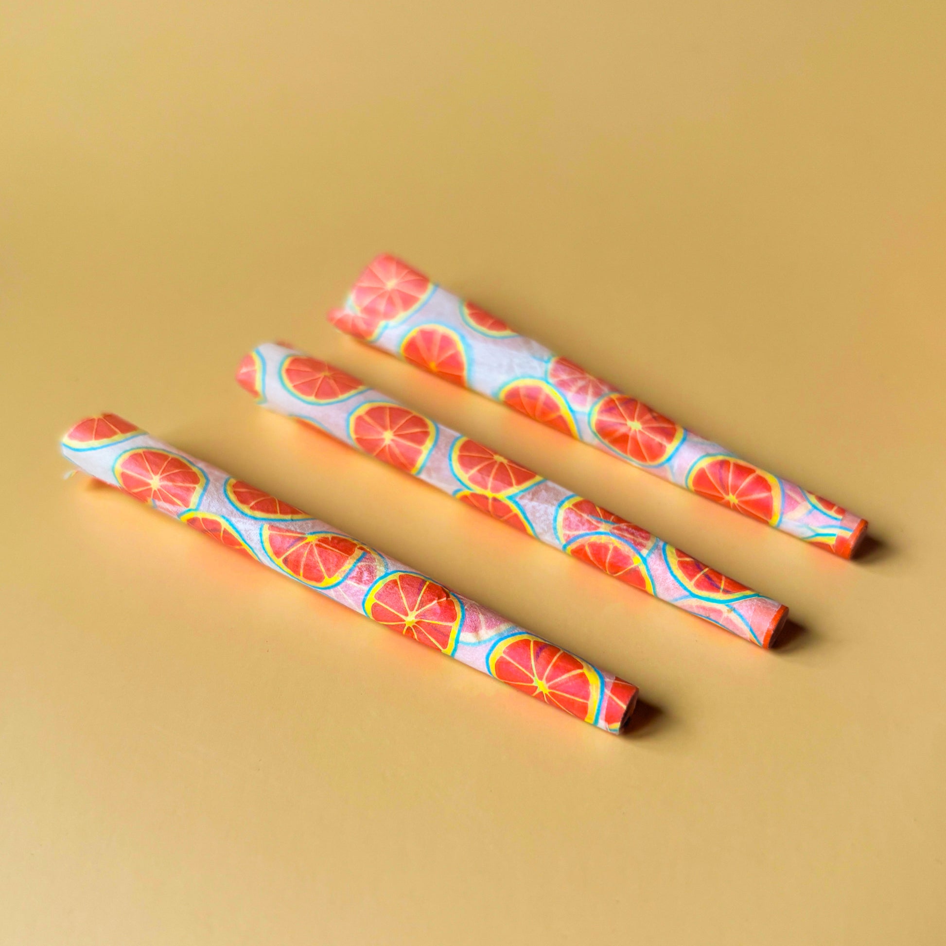 Set of 35 cones. All of our cones are hand rolled and printed with vegan, food-grade inks. Each pack consists of 35 citrus-patterned cones with color-coordinated filters.
