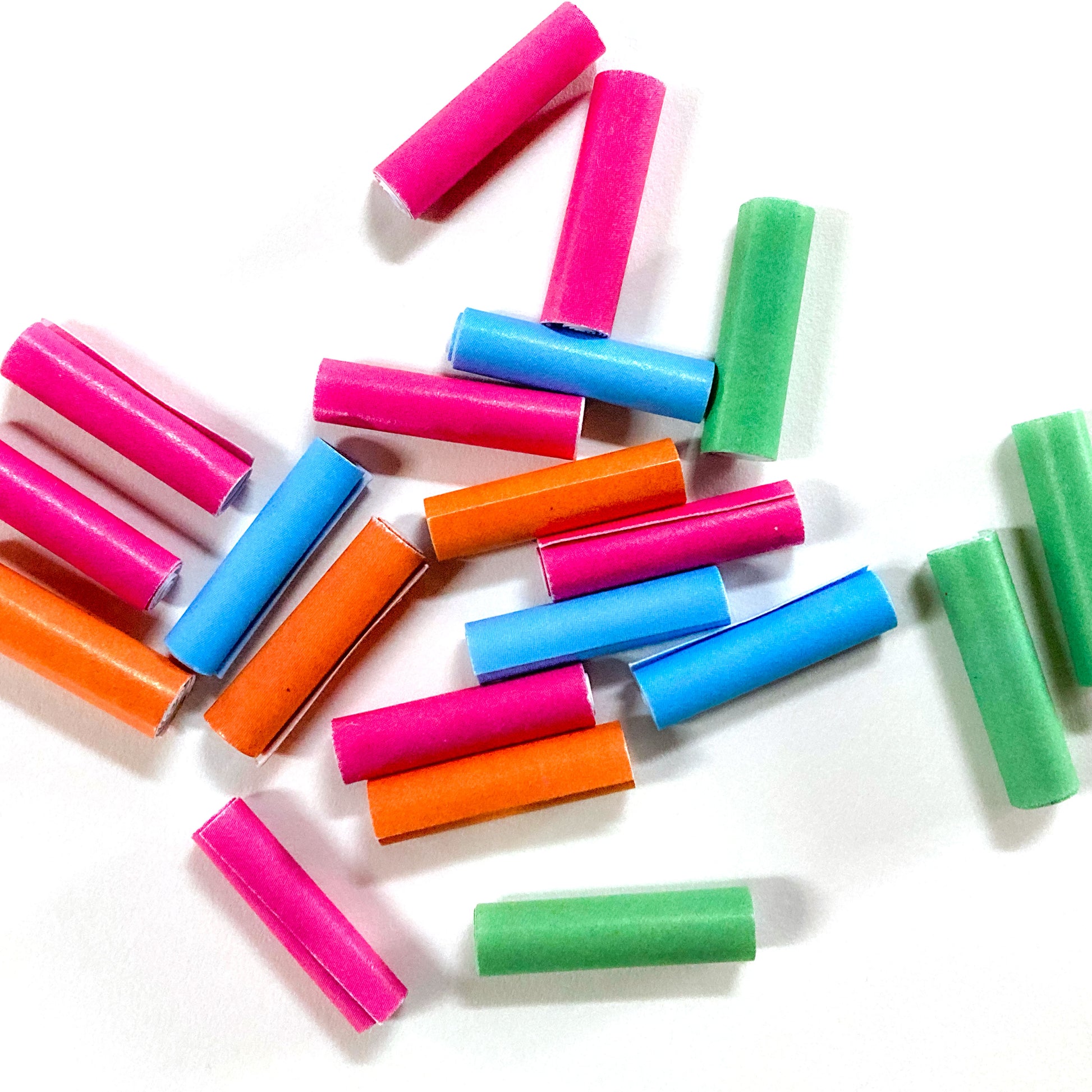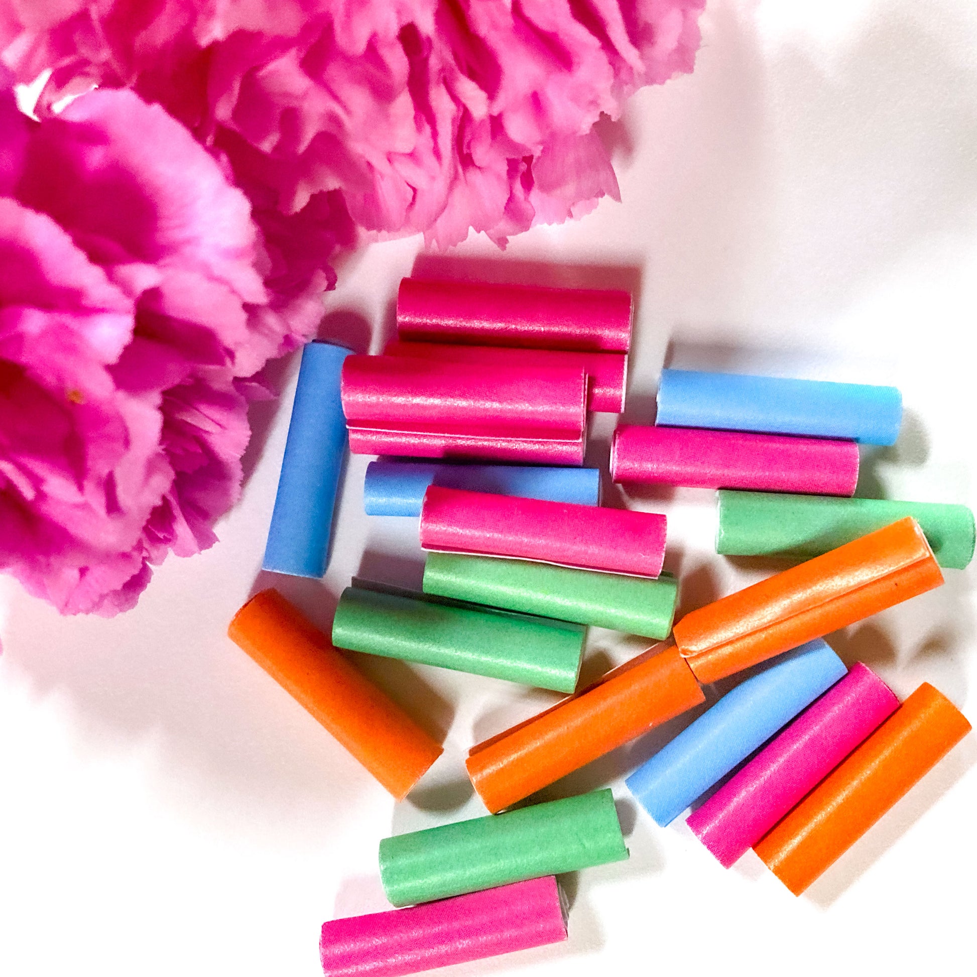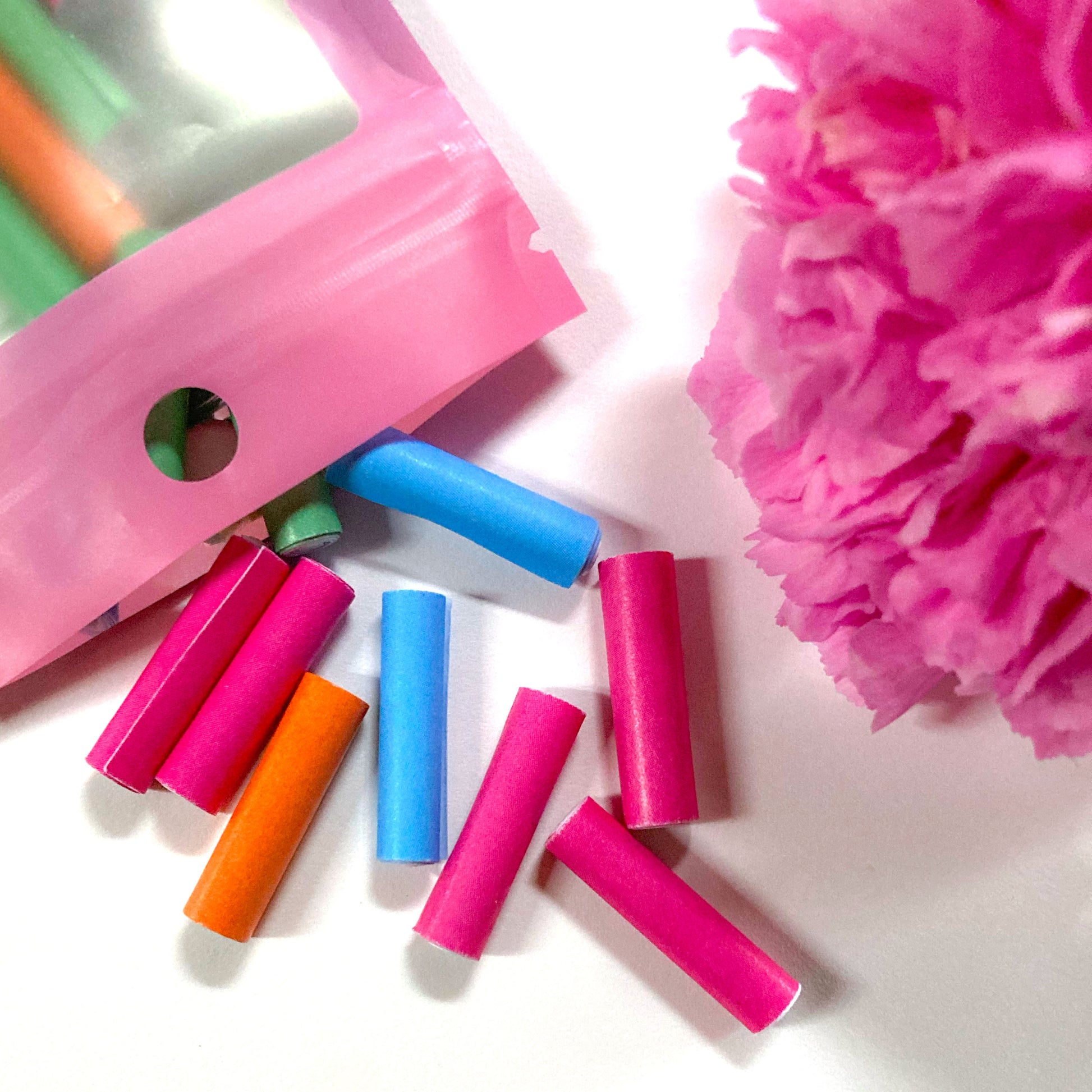 The Confetti Filters come in a set of 20 colorful crutches. Each pack of 20 has a mix of pink, blue, green and orange filters. They are the perfect complement to our designer papers--and they are the best way to add some style to ordinary papers. Hand-rolled in NYC, these filters are made from recycled paper.