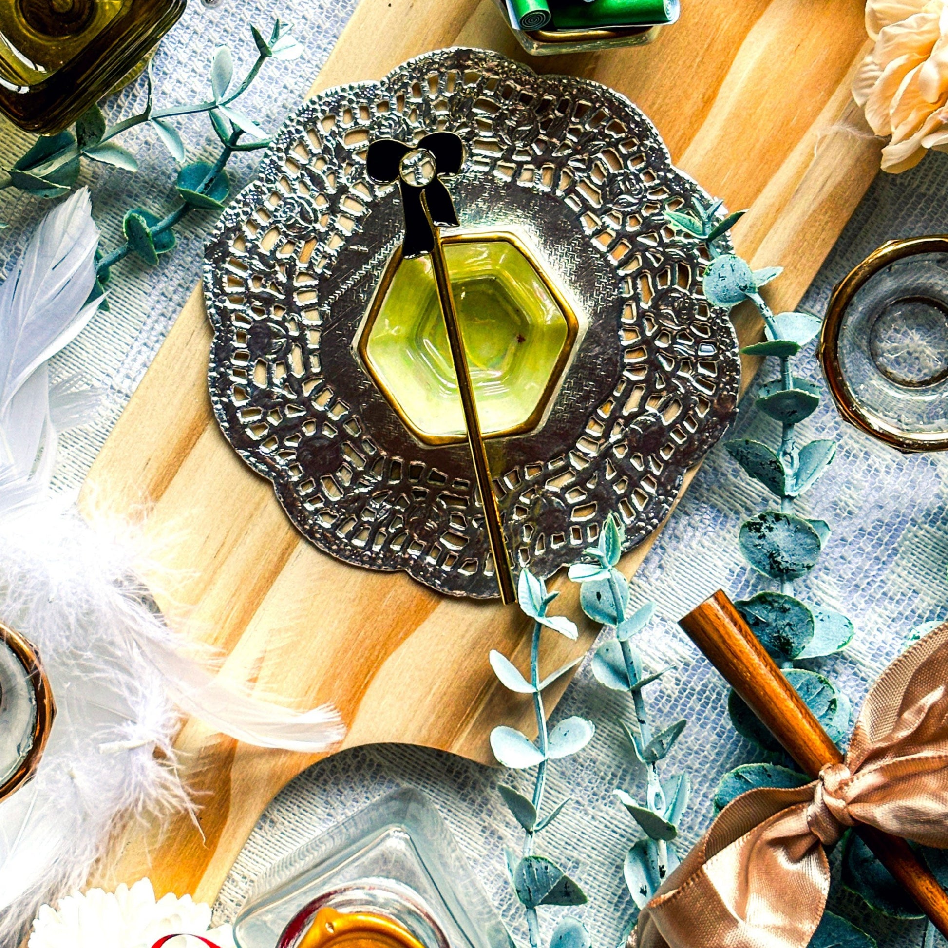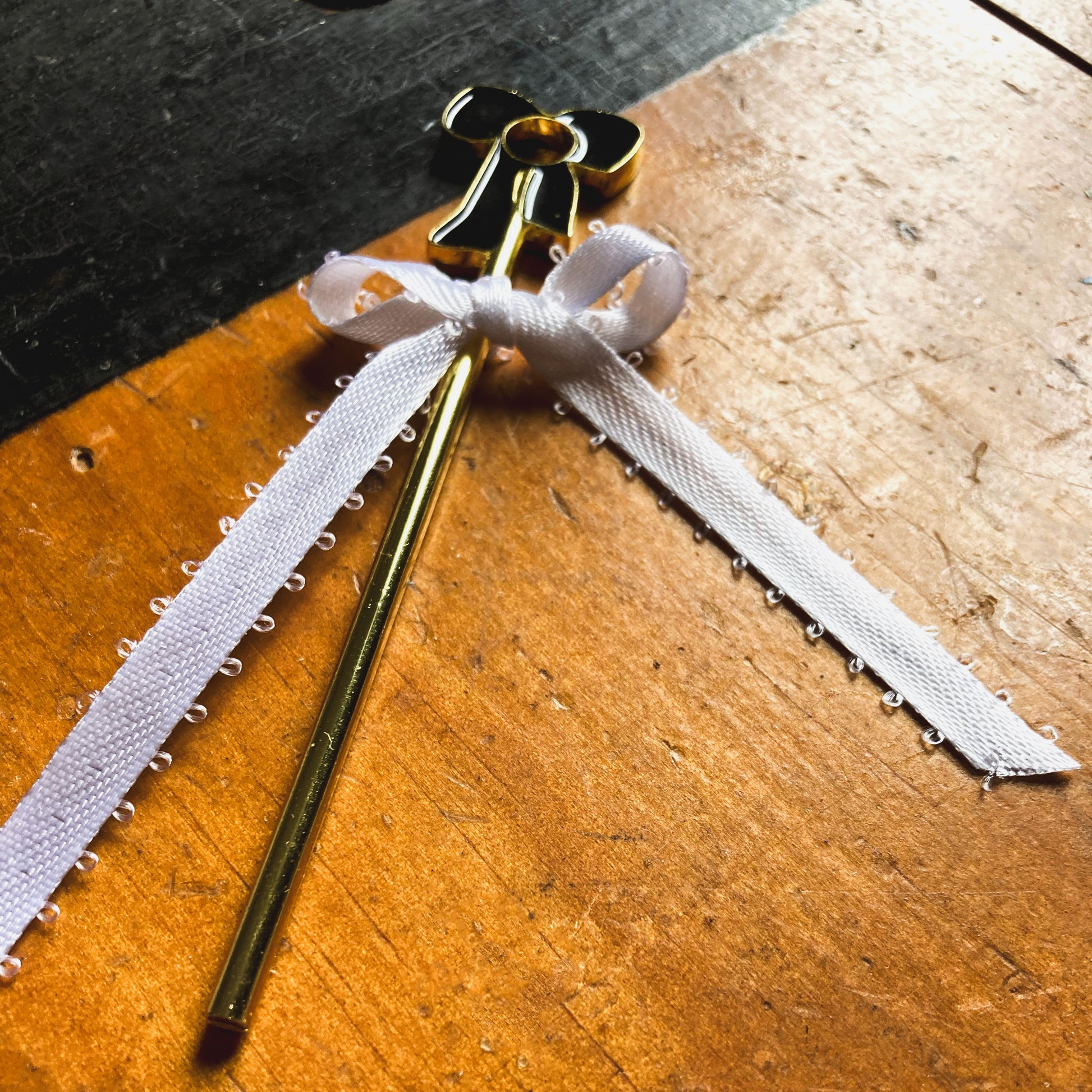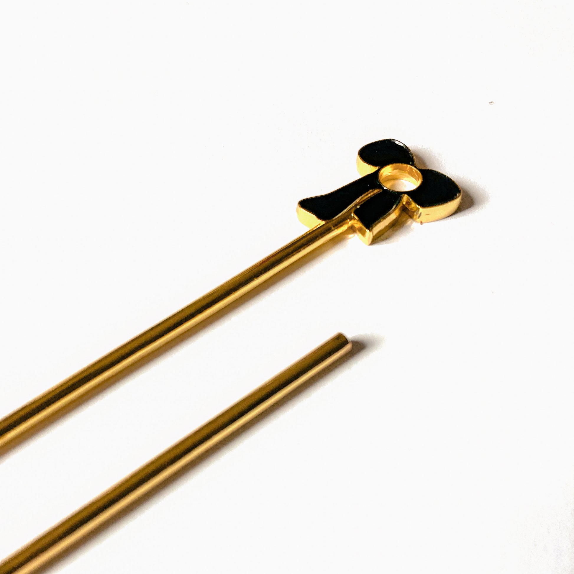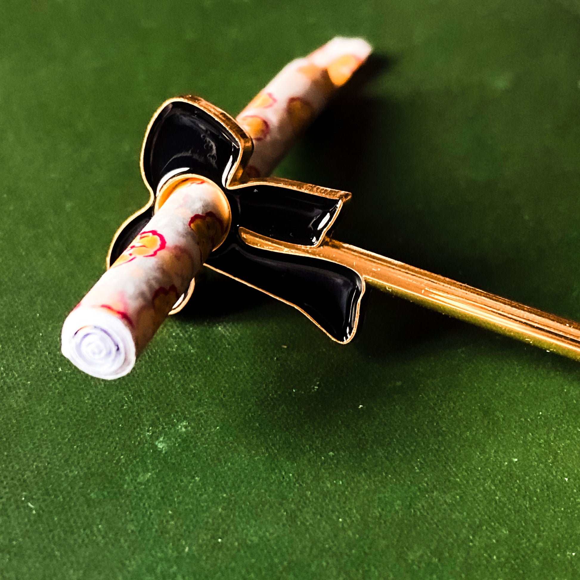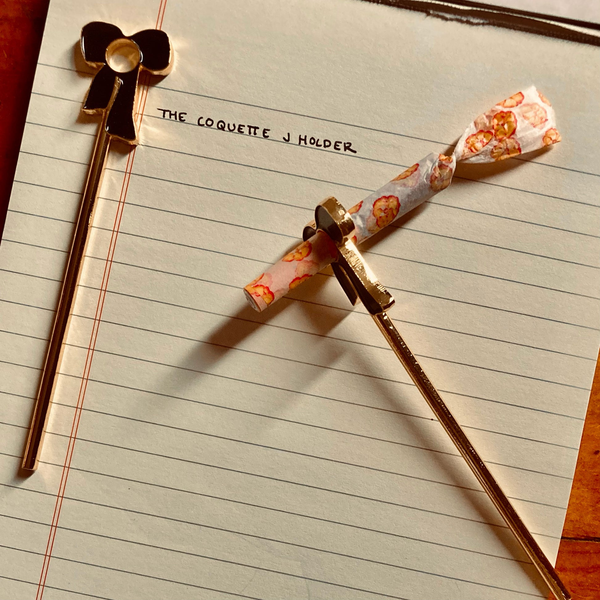 Smoking just got a whole lot cuter. Slide your J into the opening, light up and enjoy! Our J holders are the prettiest way to avoid burning your fingers š¤ The Coquette J Holder features a gold edged bow atop a gold tone wand. The bow is polished with black enamel on both sides.
