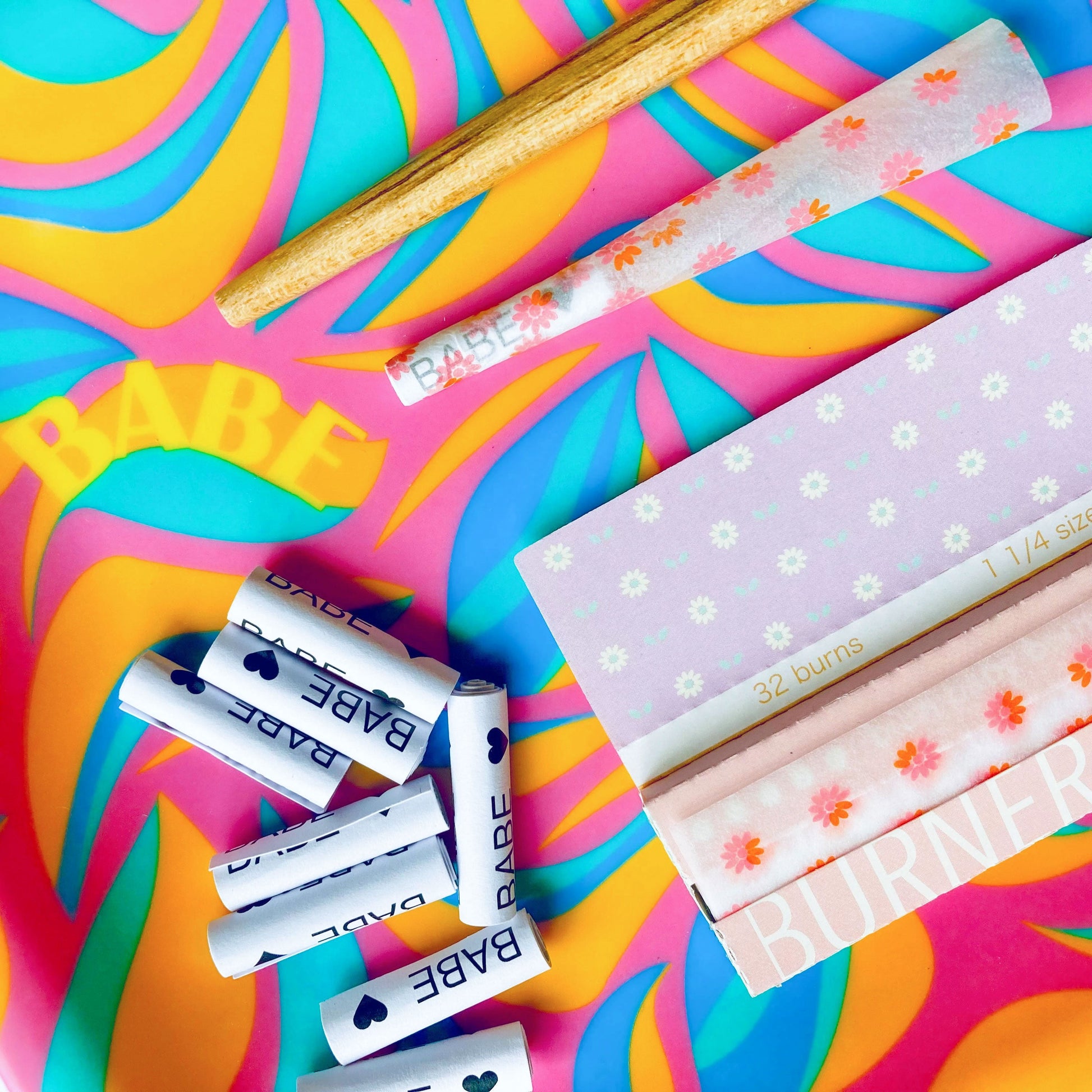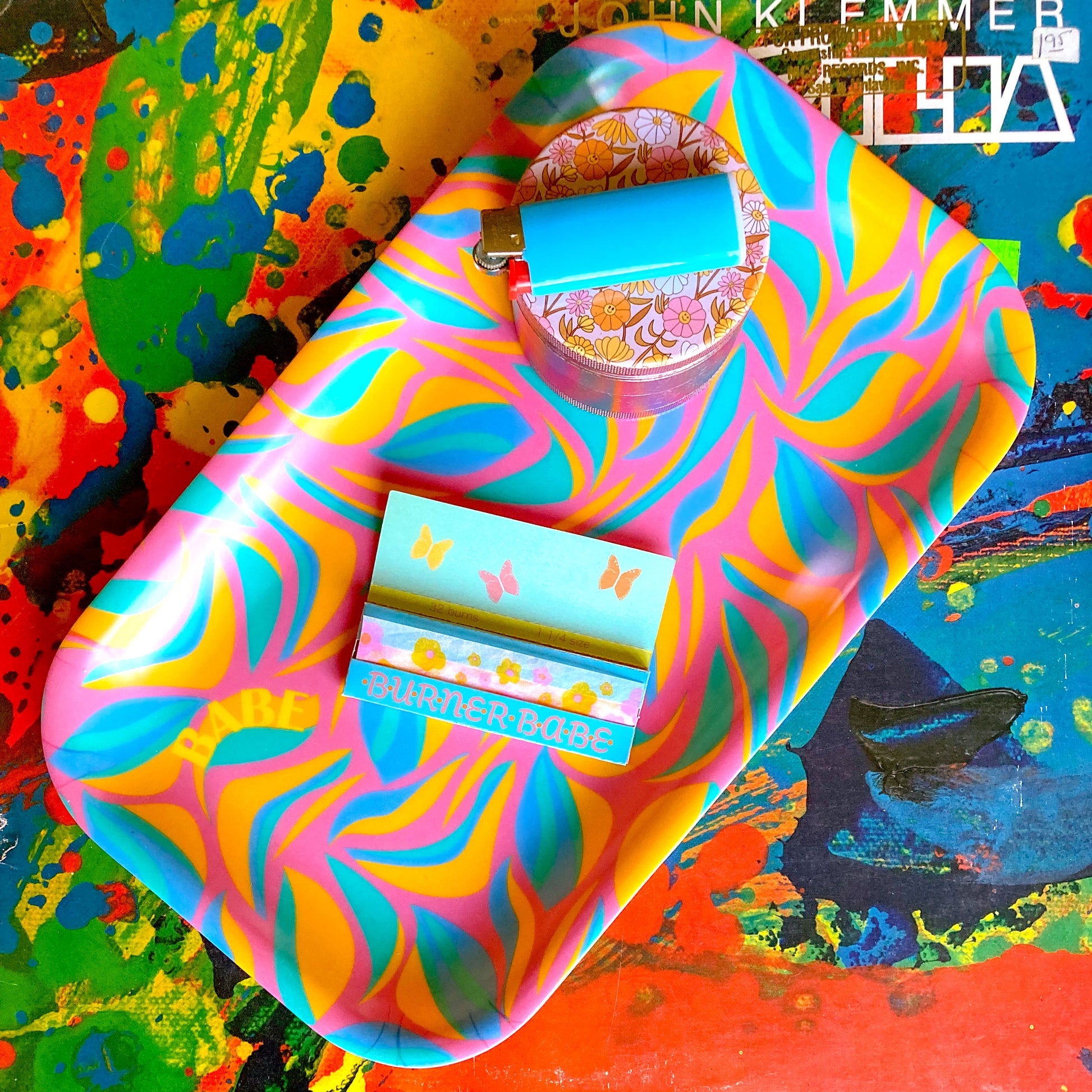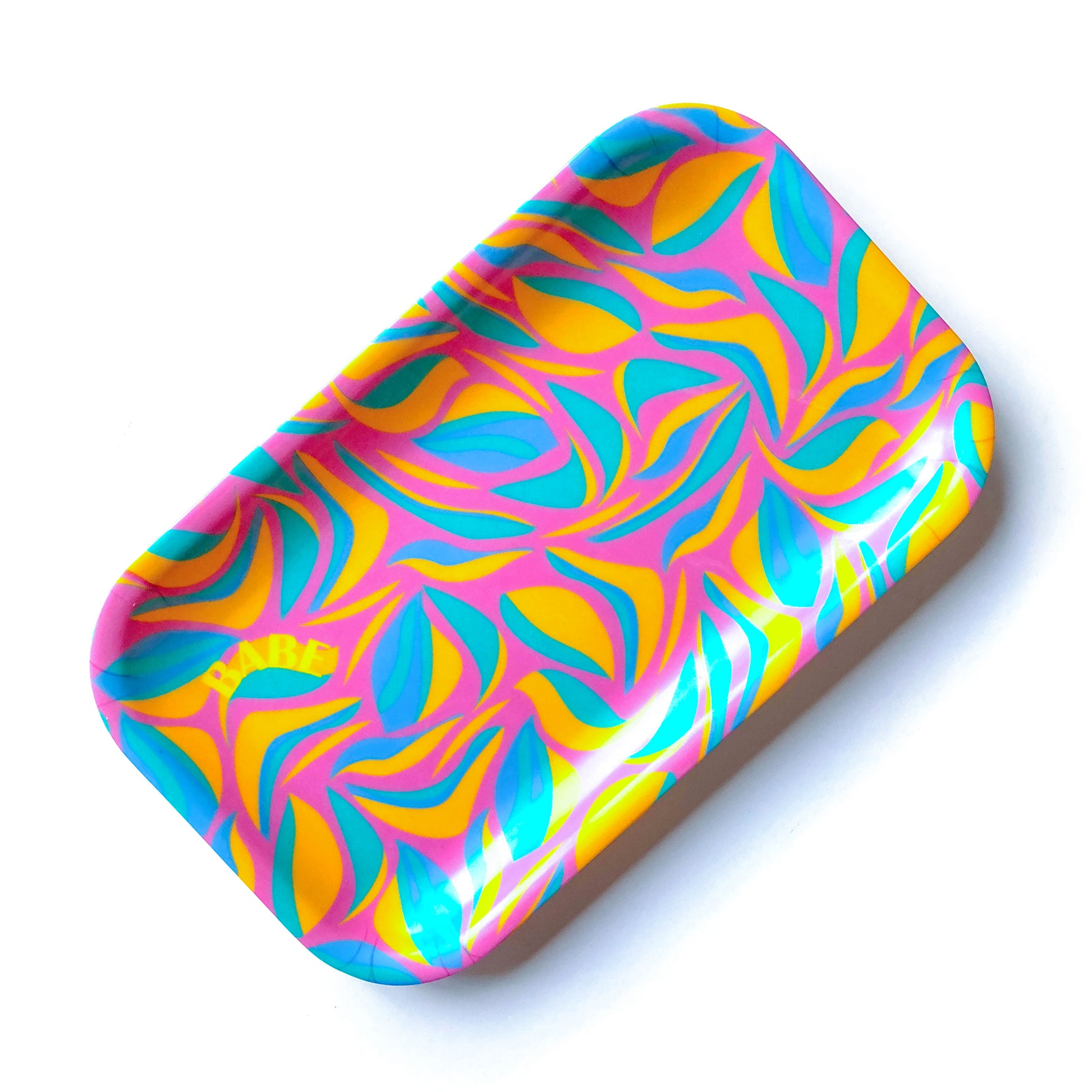 Dashes of blue, green, and orange decorate this 10 x 6 inch tray. Although these trays are perfect for rolling up some flower, they also make super cute catch-alls or jewelry dishes 💕