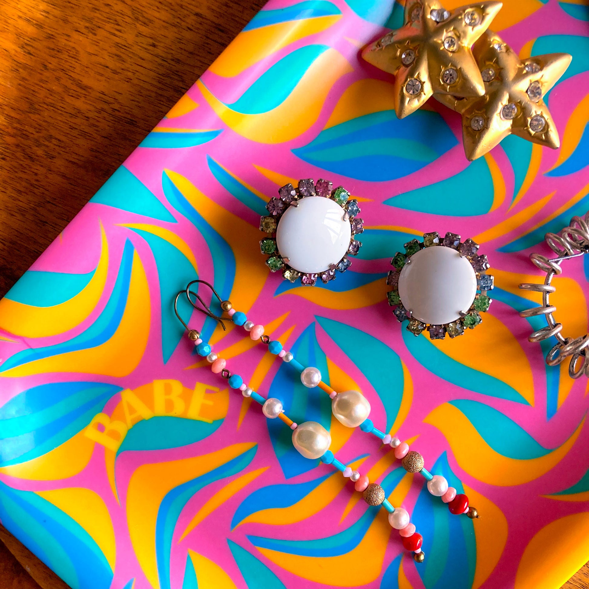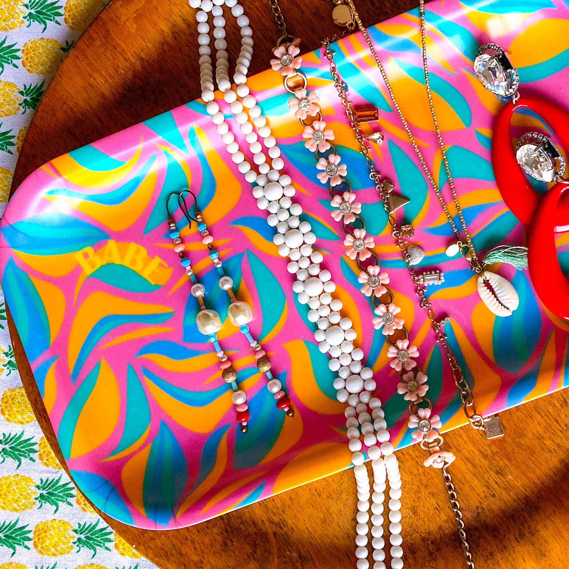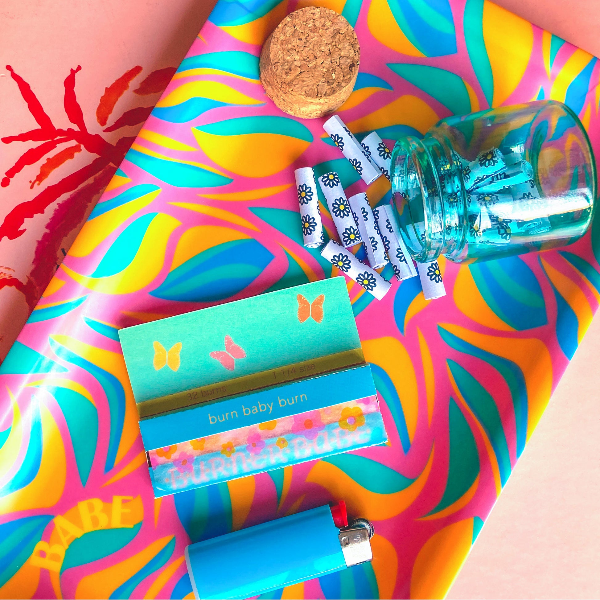 Dashes of blue, green, and orange decorate this 10 x 6 inch tray. Although these trays are perfect for rolling up some flower, they also make super cute catch-alls or jewelry dishes 💕