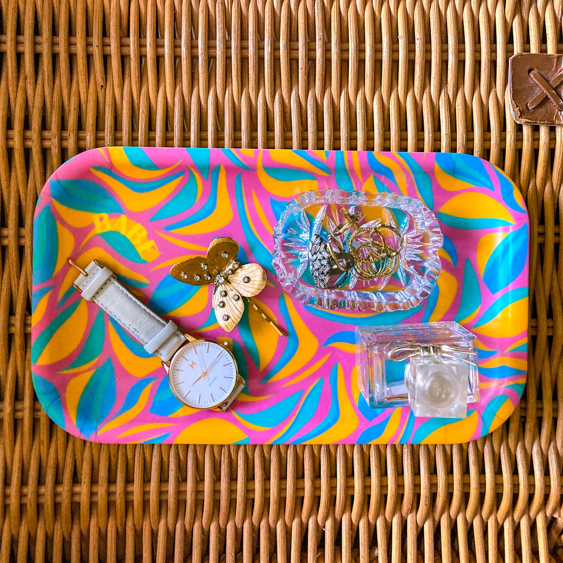 The Flamingo Tray's bright pattern is inspired by the colorful plumes on tropical birds.