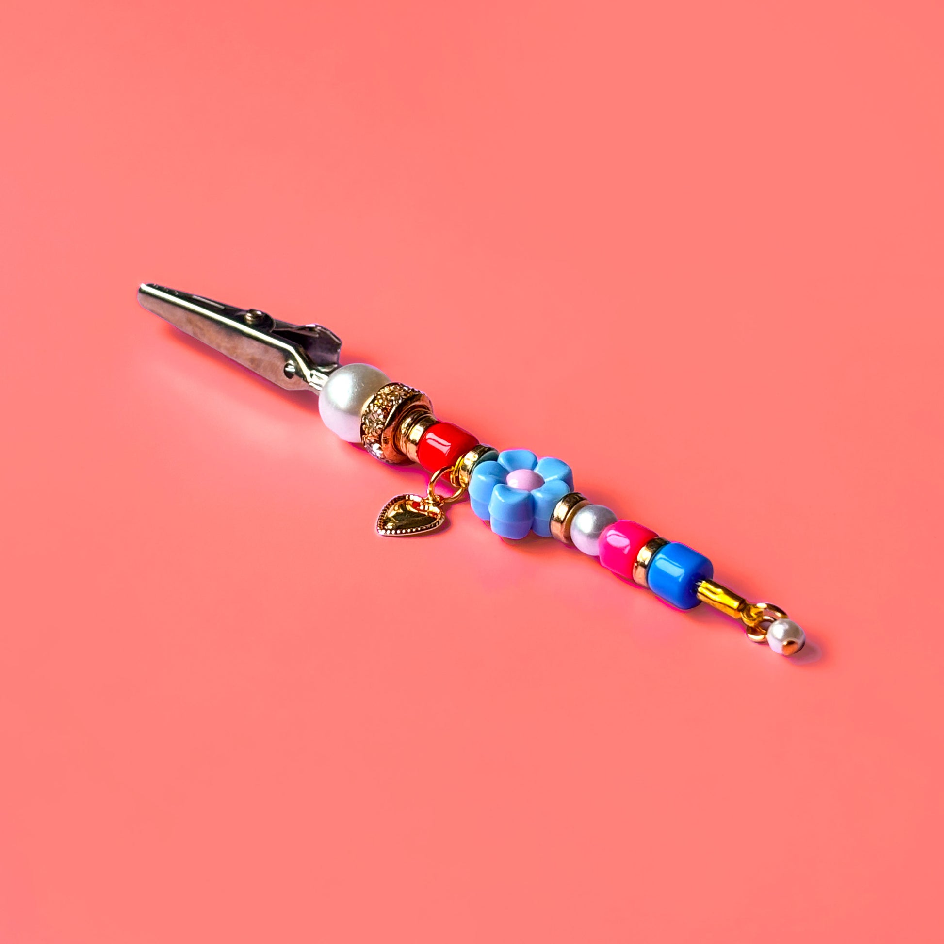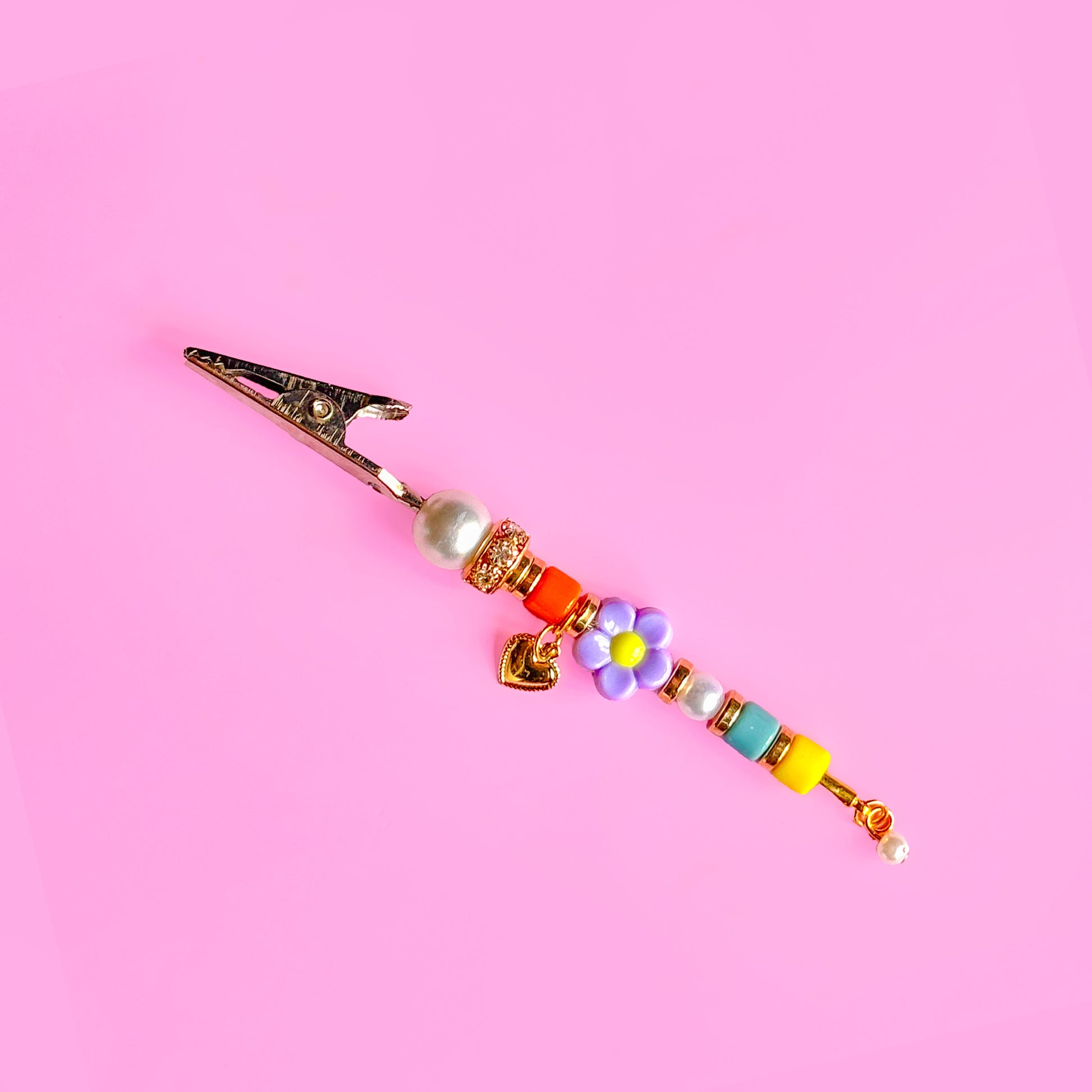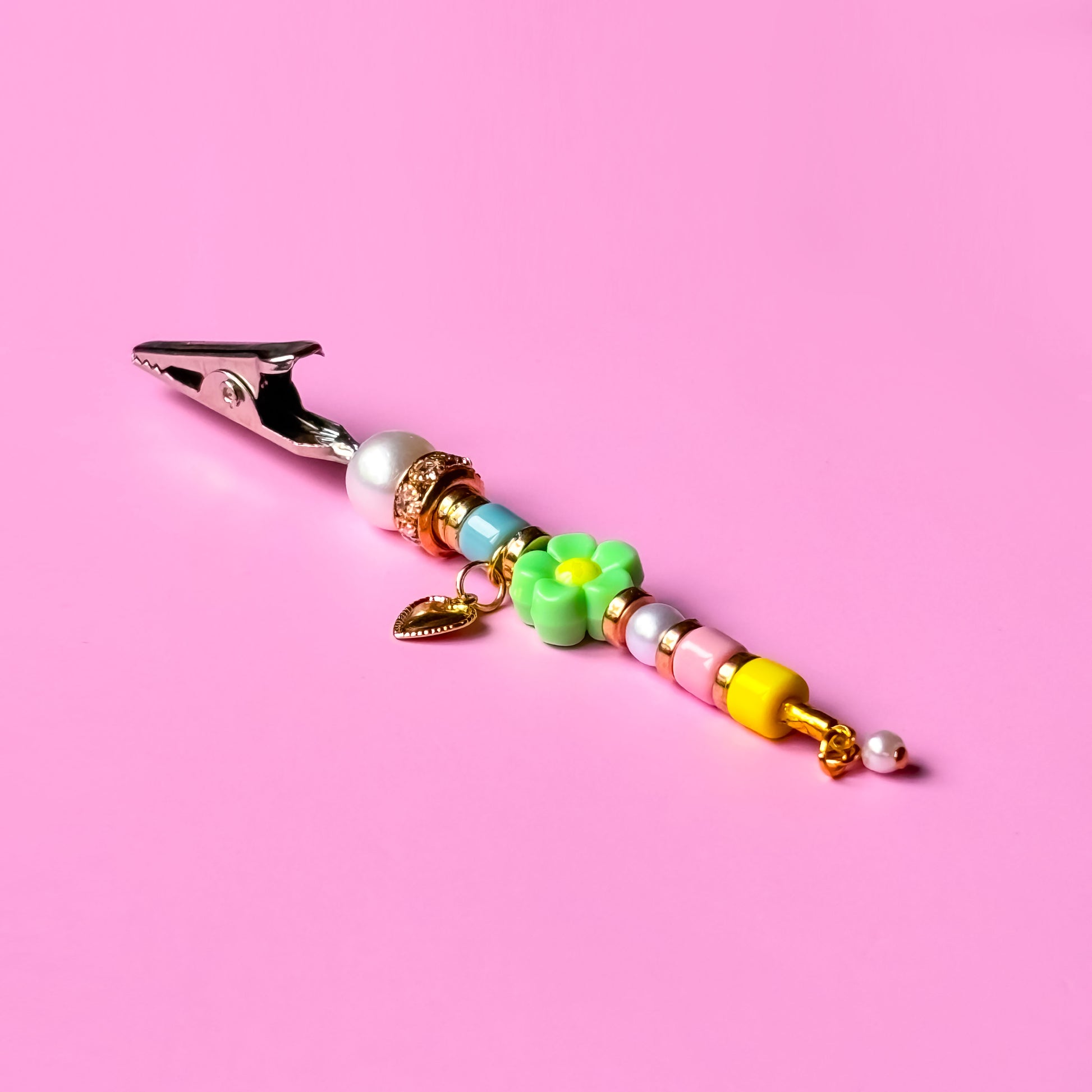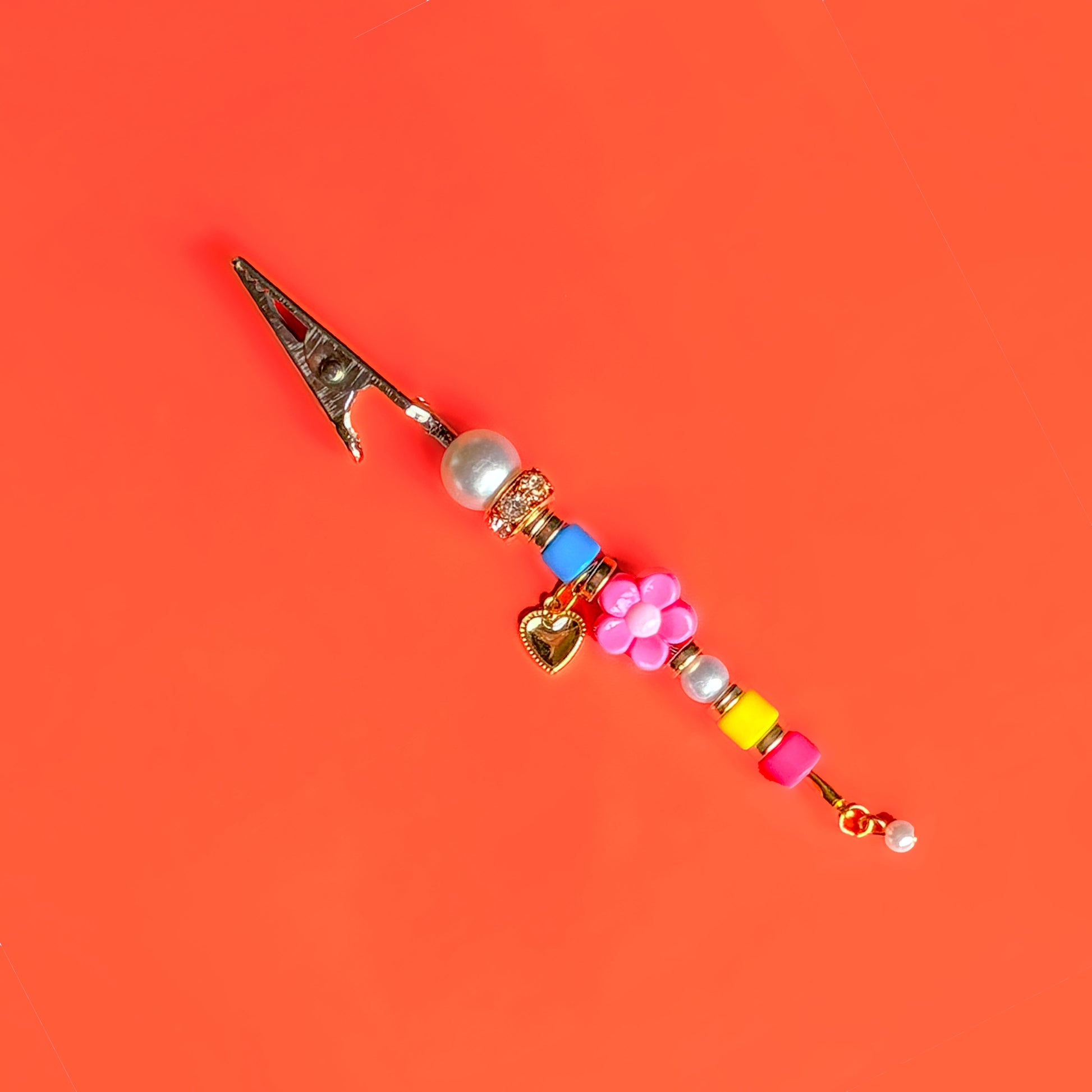 Stacked with colorful beads, crystals, pearls and playful charms, this J clip is handmade in NYC. Available in five colorways: pink, blue, green, purple and yellow. Made with lightweight glass, brass, ceramic and acrylic beads. Finished with gold-tone plated charms, brass findings and a small pearl drop.