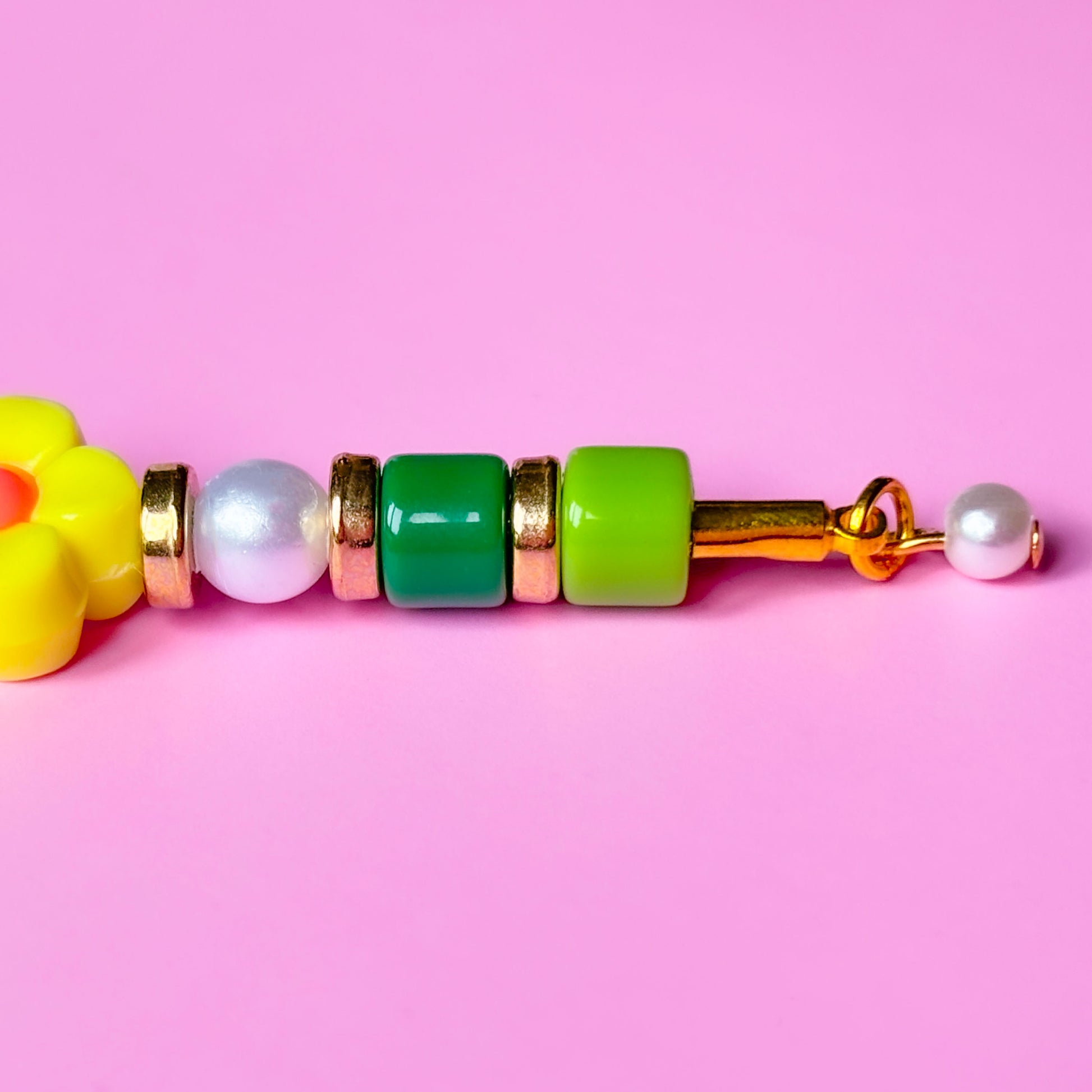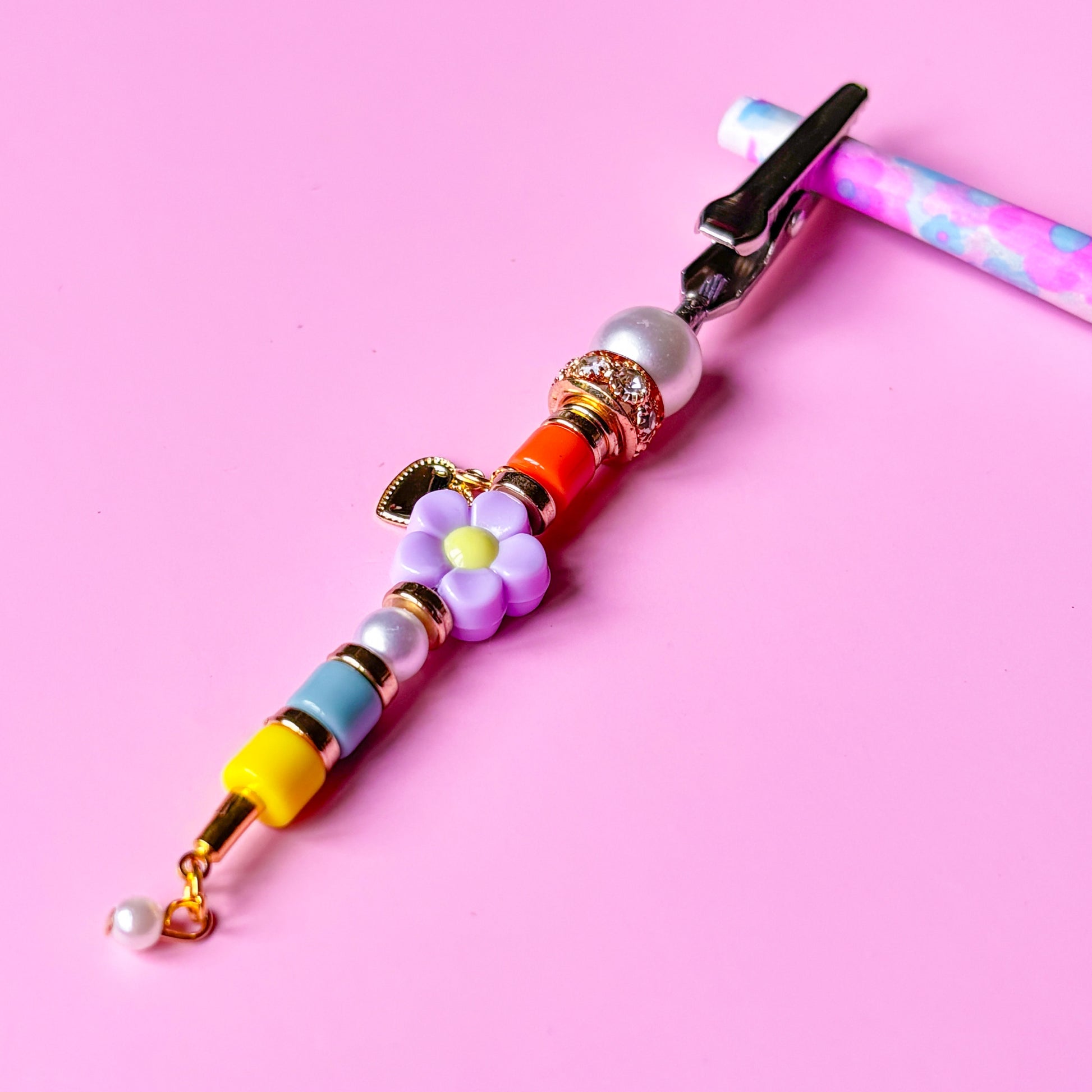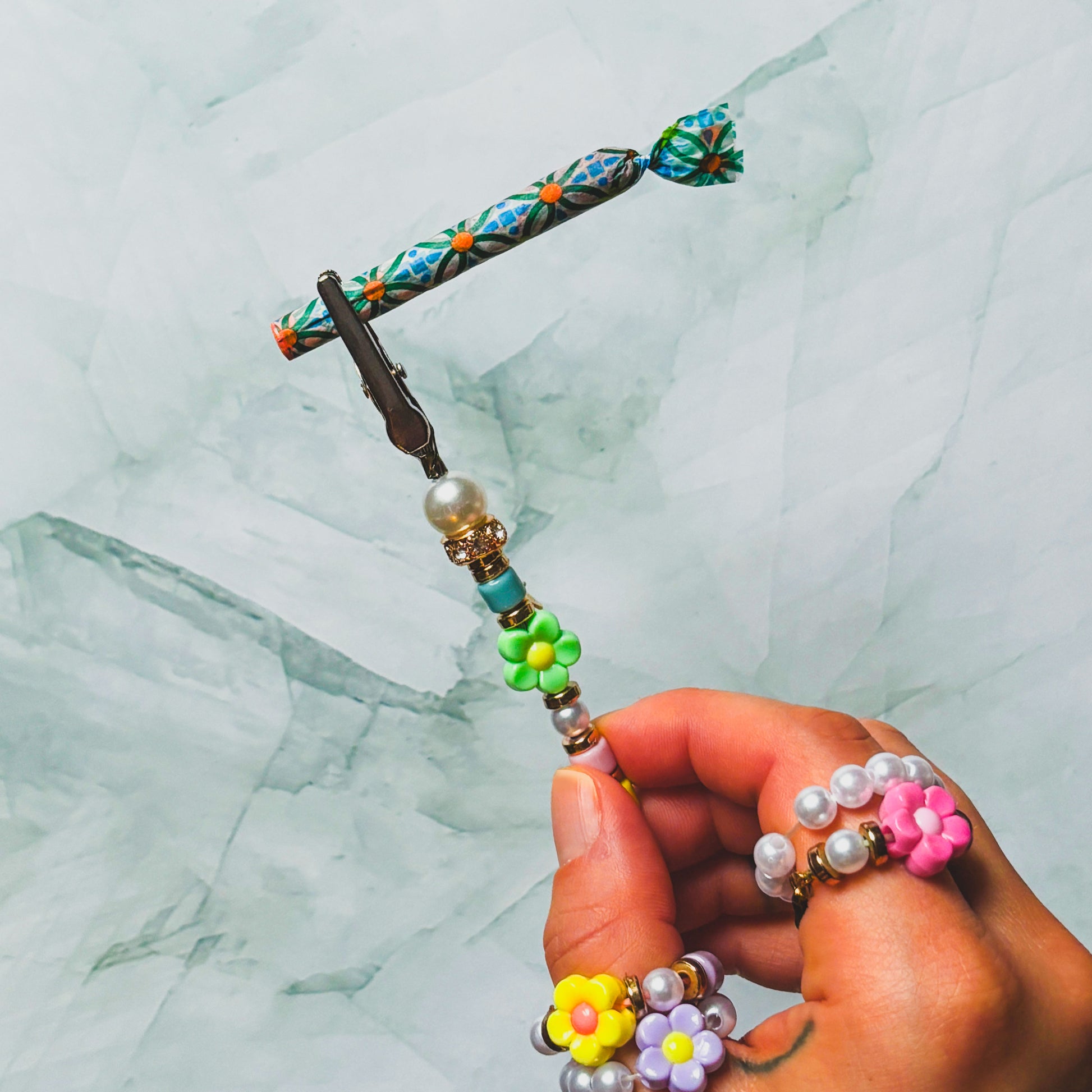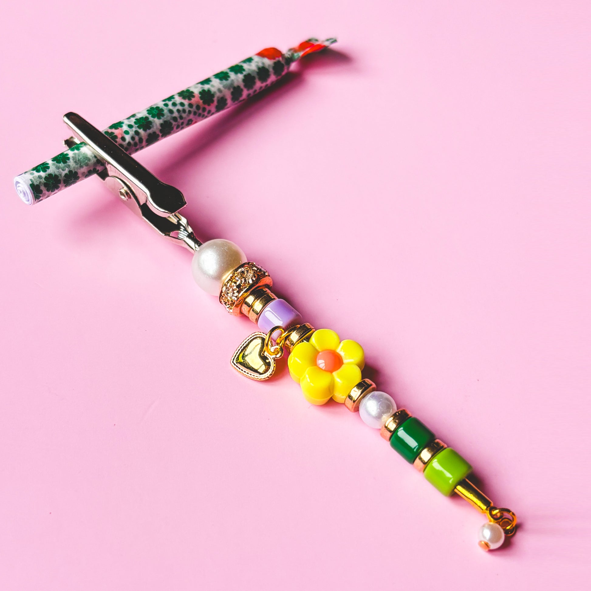 Stacked with colorful beads, crystals, pearls and playful charms, this J clip is handmade in NYC. Available in five colorways: pink, blue, green, purple and yellow. Made with lightweight glass, brass, ceramic and acrylic beads. Finished with gold-tone plated charms, brass findings and a small pearl drop.