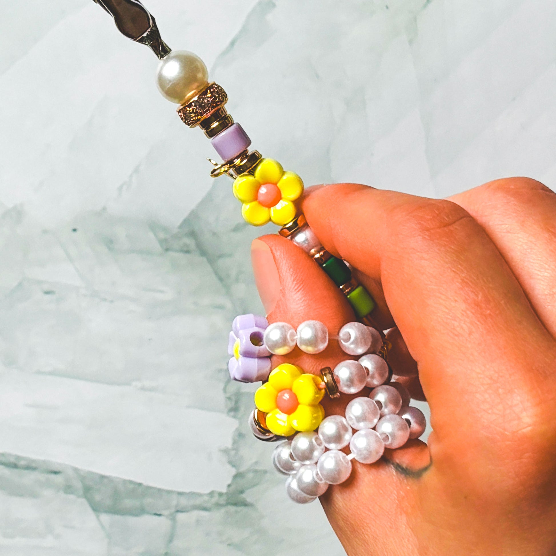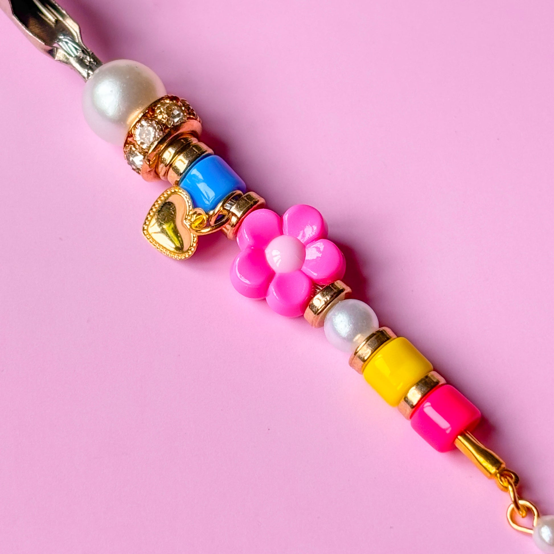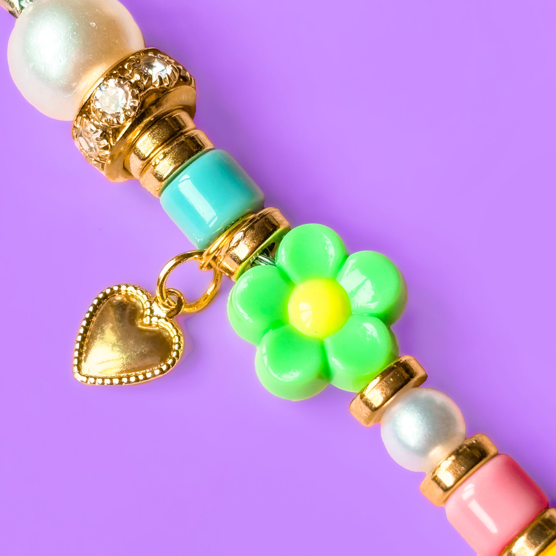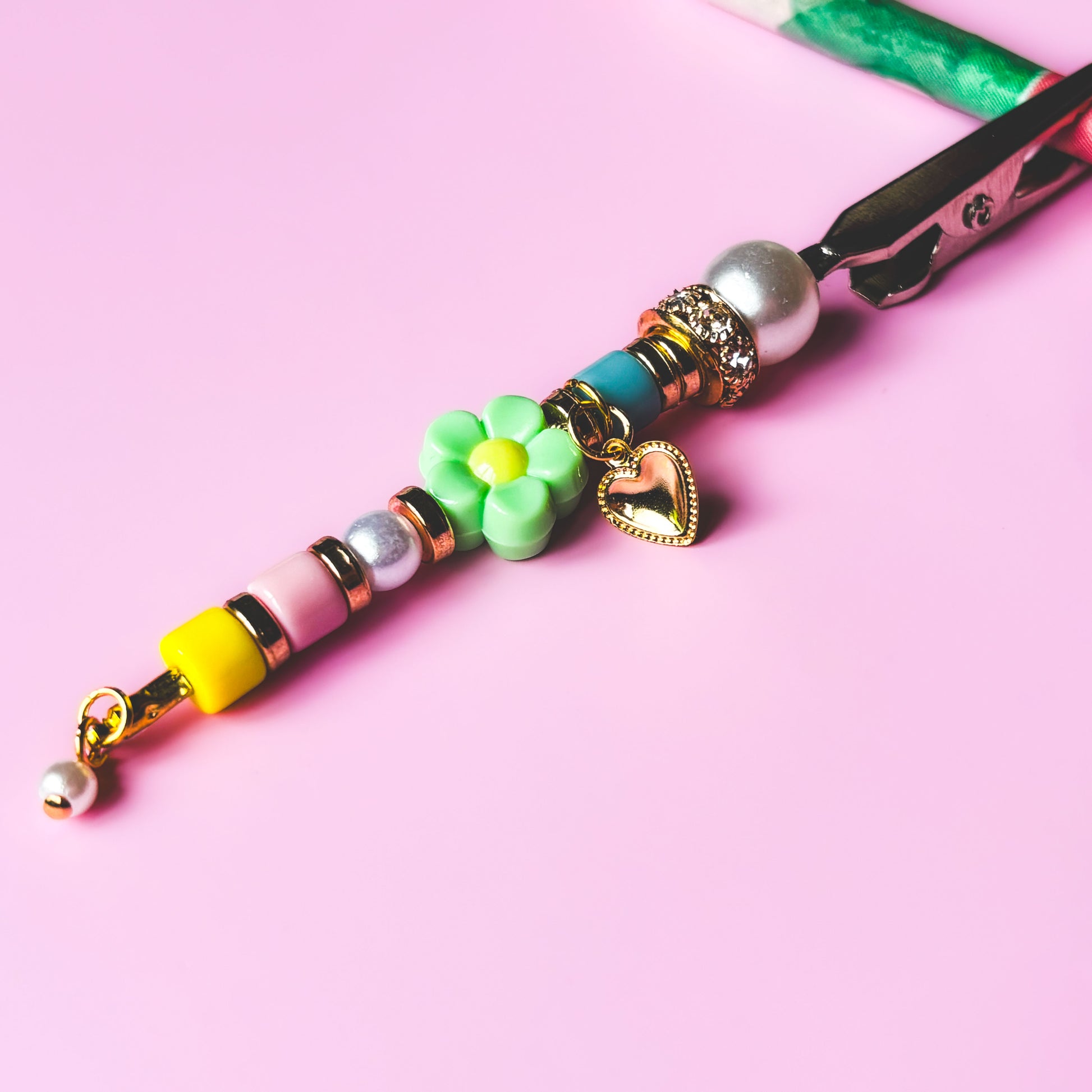 Stacked with colorful beads, crystals, pearls and playful charms, this J clip is handmade in NYC. Available in five colorways: pink, blue, green, purple and yellow. Made with lightweight glass, brass, ceramic and acrylic beads. Finished with gold-tone plated charms, brass findings and a small pearl drop.