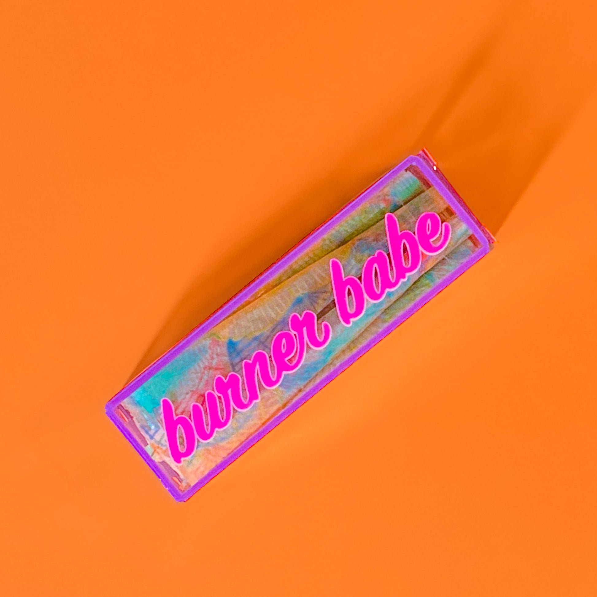 A bright spiral pattern swirls around The Heartbreaker Cones. Flecks of bright yellow, blue, turquoise and coral overlap to create a mosaic of color. Each pack consists of 8 patterned cones and a tamping tool for packing. The Heartbreaker Cones are vegan and made from rice paper.