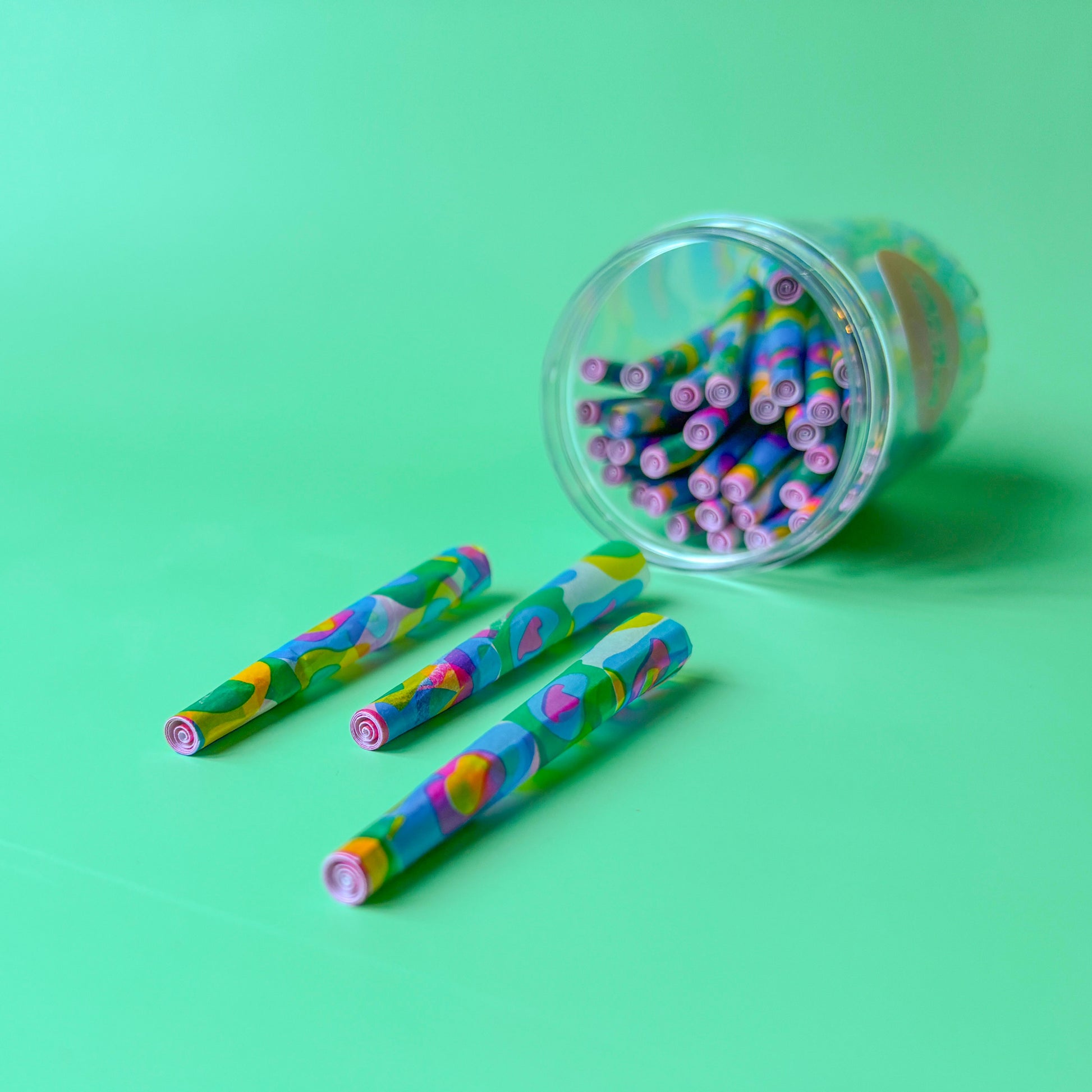 Set of 35 lava lamp inspired cones. All of our cones are hand rolled and printed with vegan, food-grade inks. Each pack consists of 35 colorful cones with color-coordinated filters.