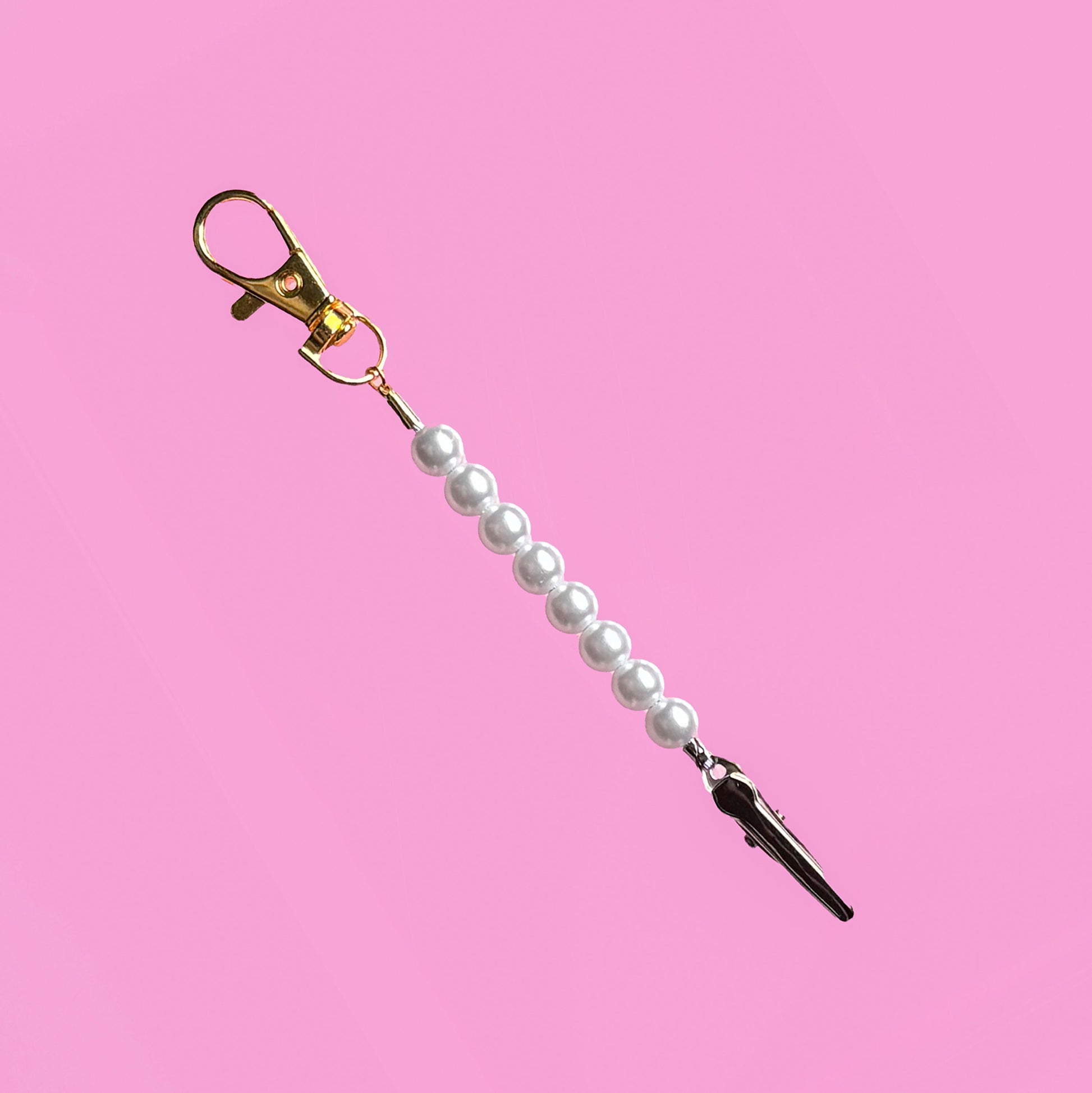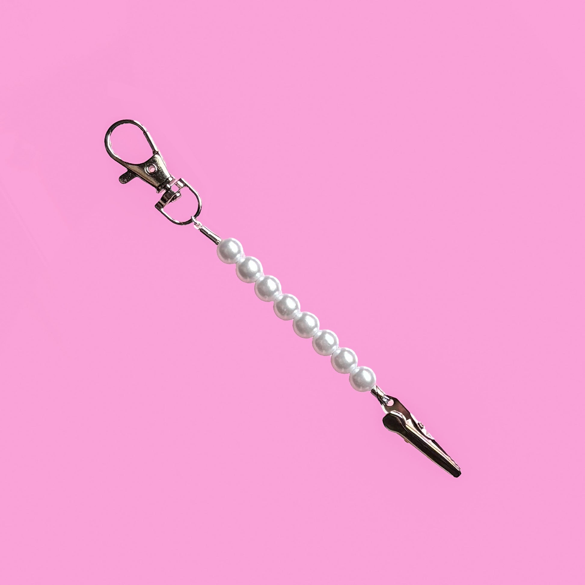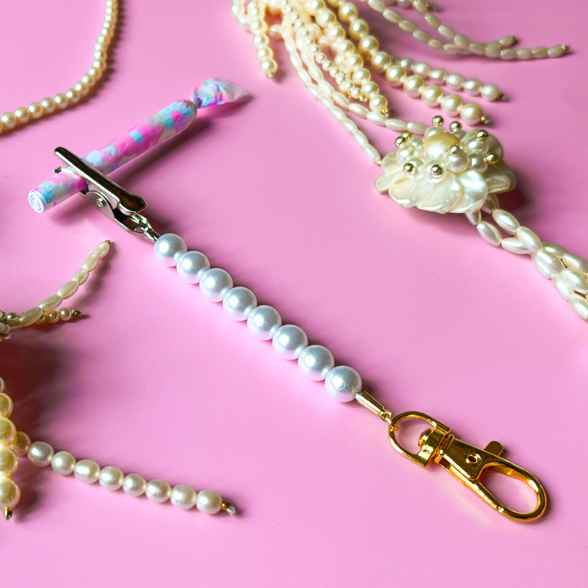 A variation of our bestselling Little Pearl J Clip, this j holder is attached to a swivel clip so you can take it on the go! Attach it to your belt loop, bag or keys to instantly elevate your look 🩷 Handmade with lightweight imitation pearl and the option of gold or silver-plated swivel clip.