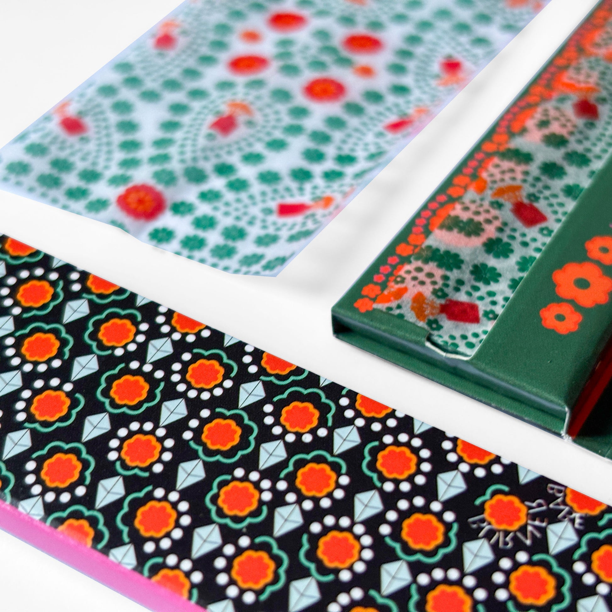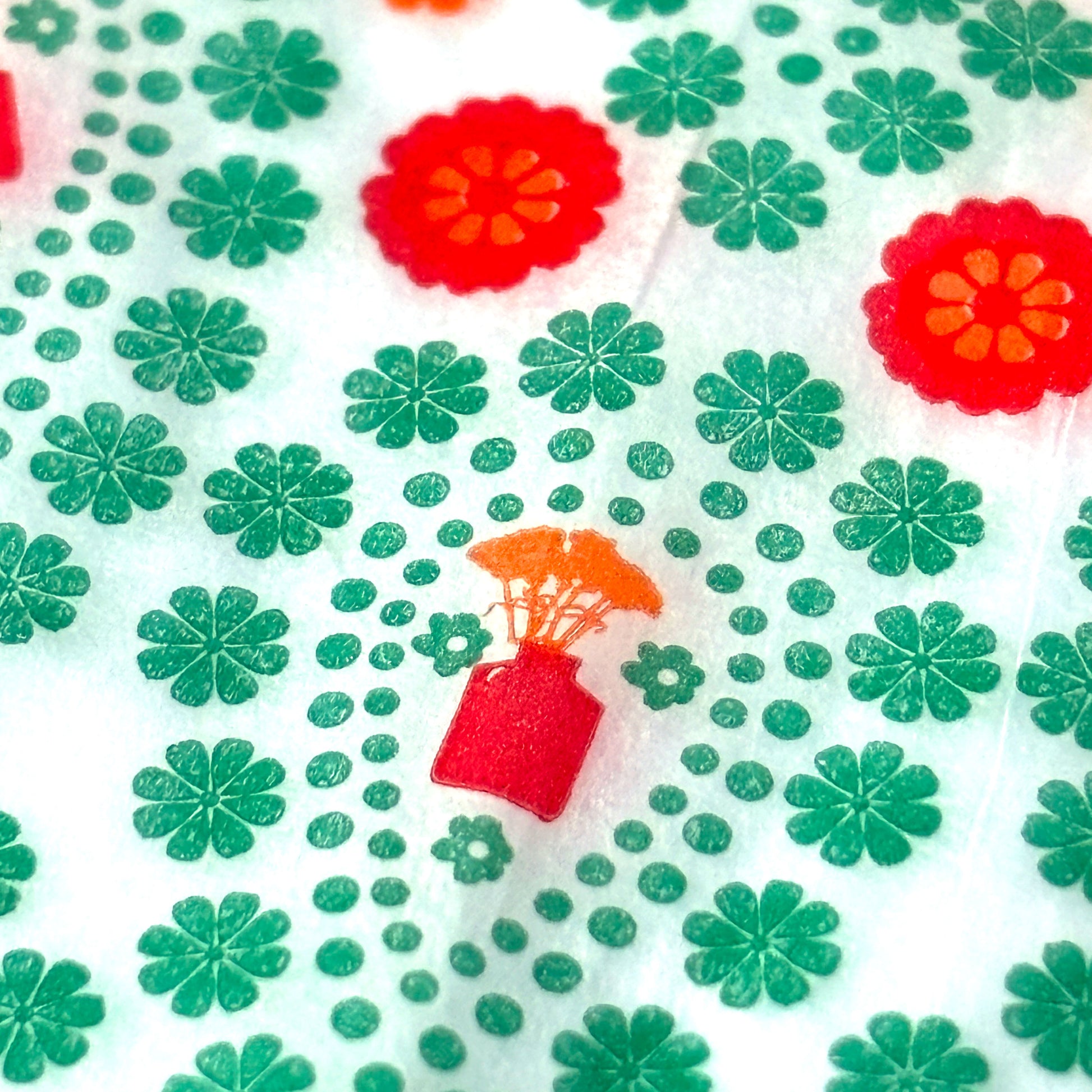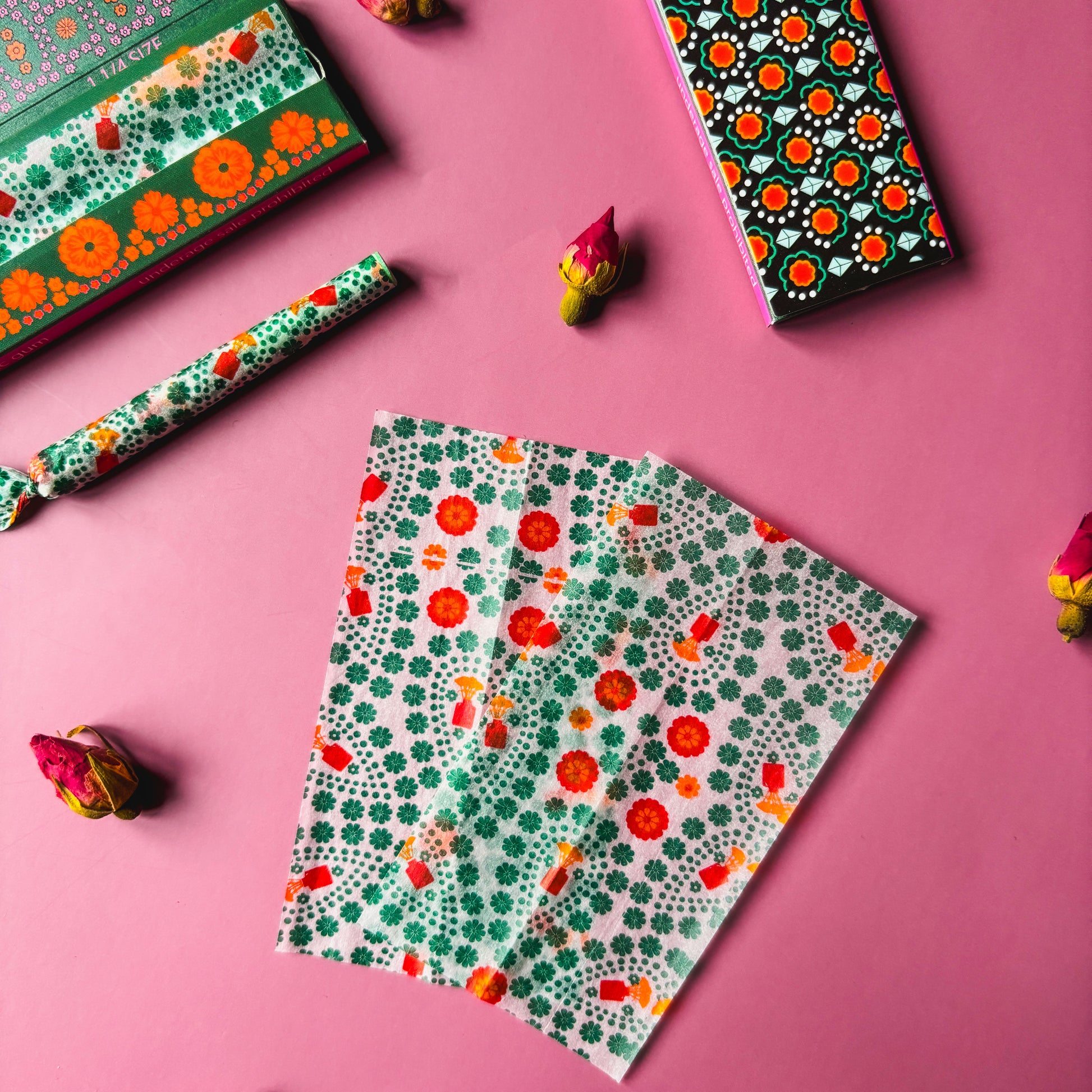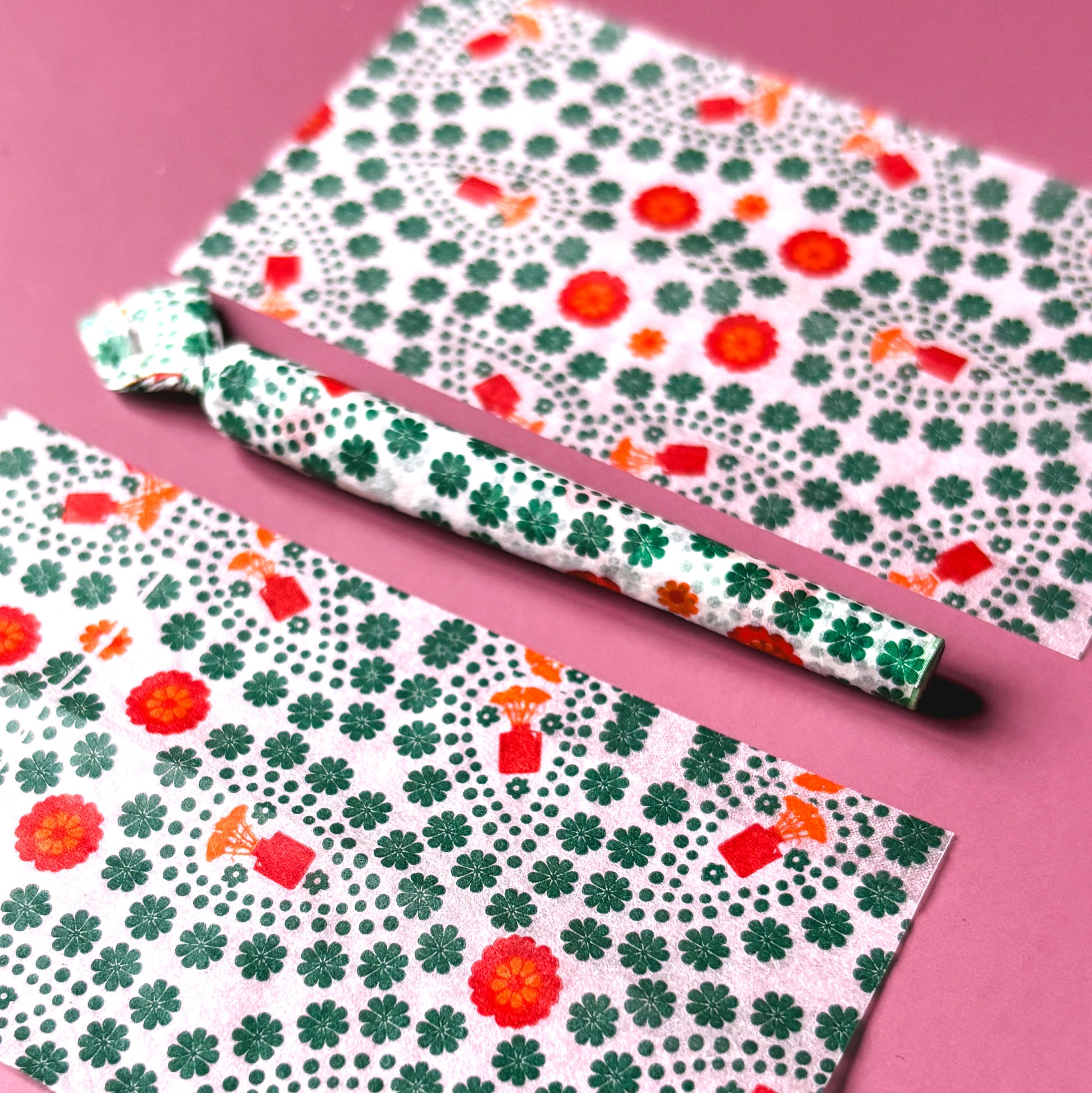 The Secret Garden Papers are decorated in an ornate green and red floral pattern. Printed on rice paper with plant-based inks.