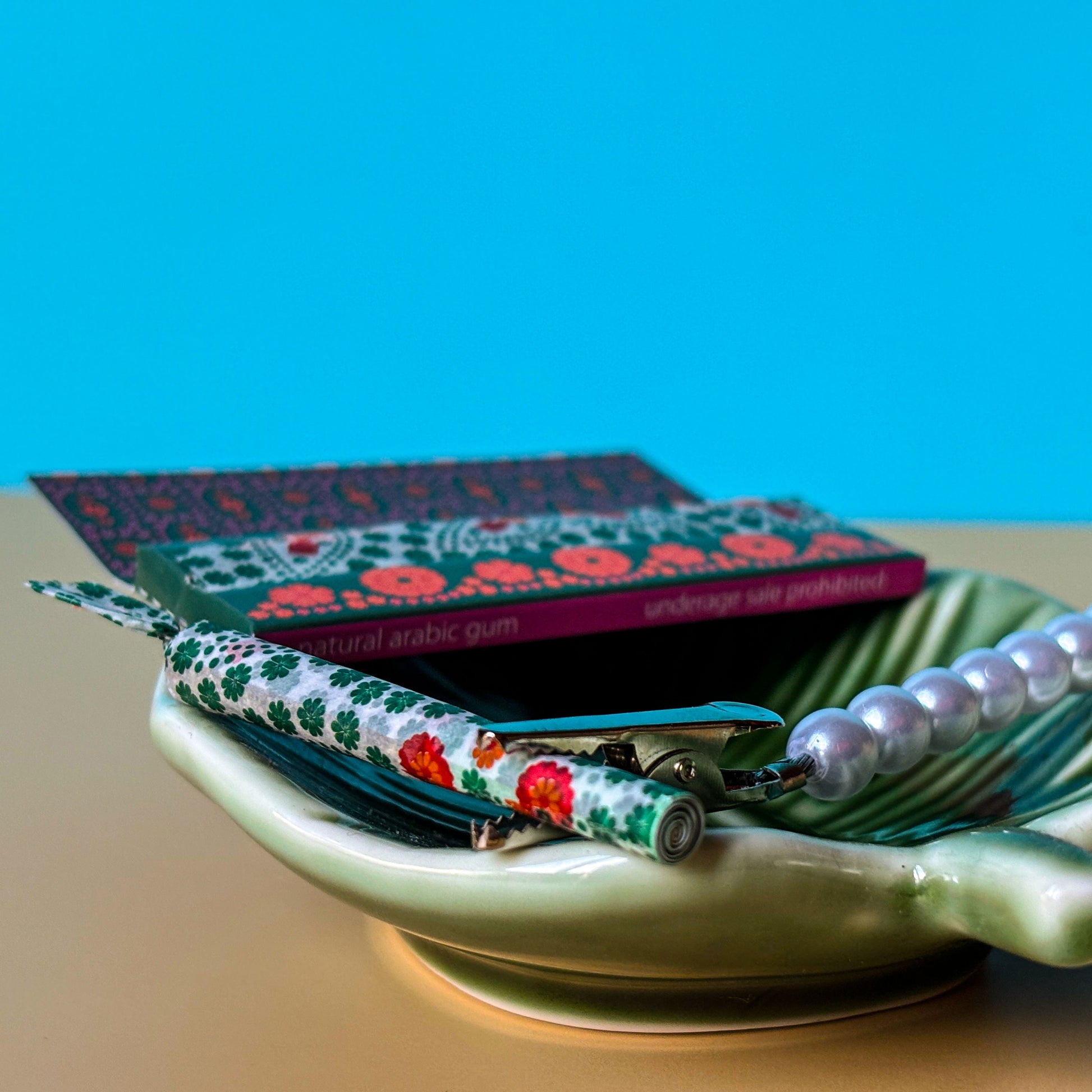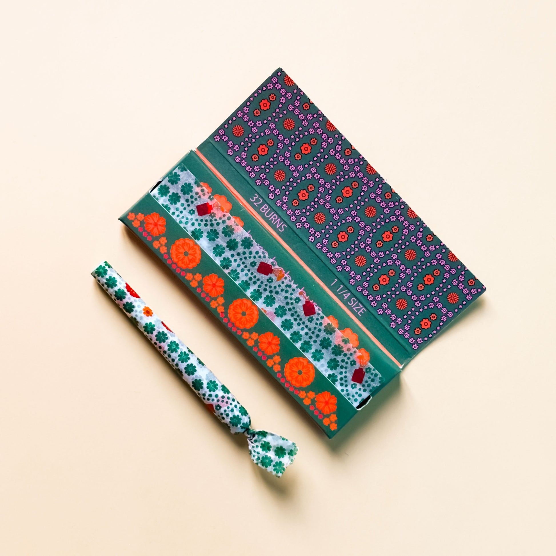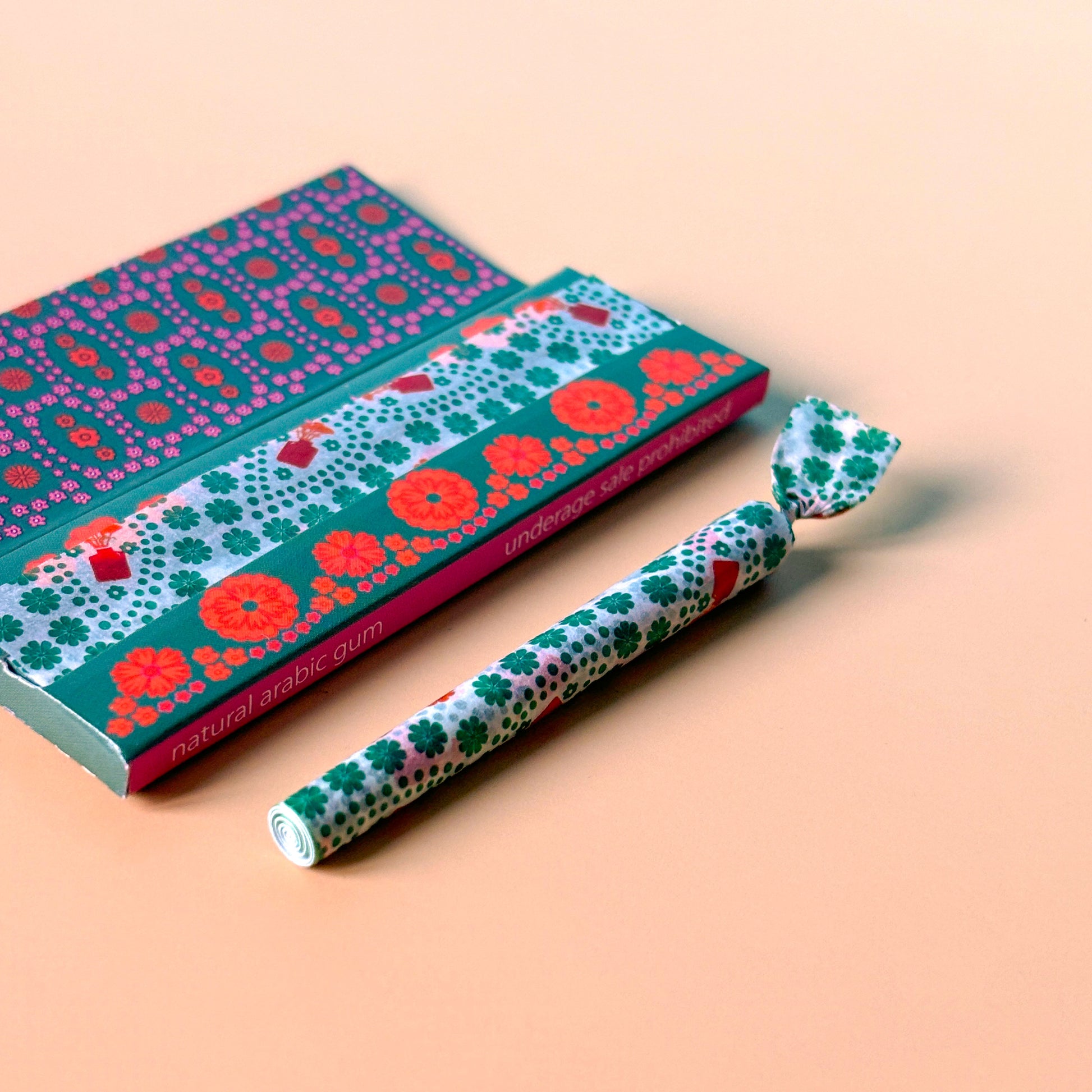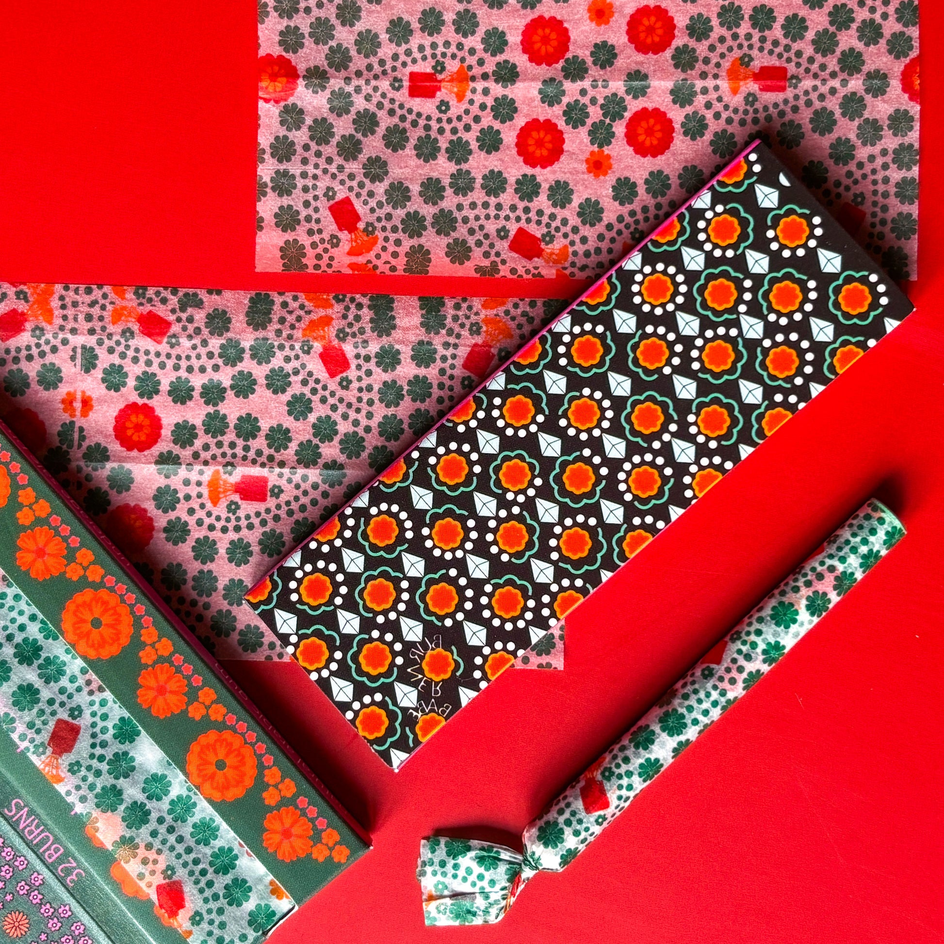 The Secret Garden Papers are decorated in an ornate green and red floral pattern. Printed on rice paper with plant-based inks.