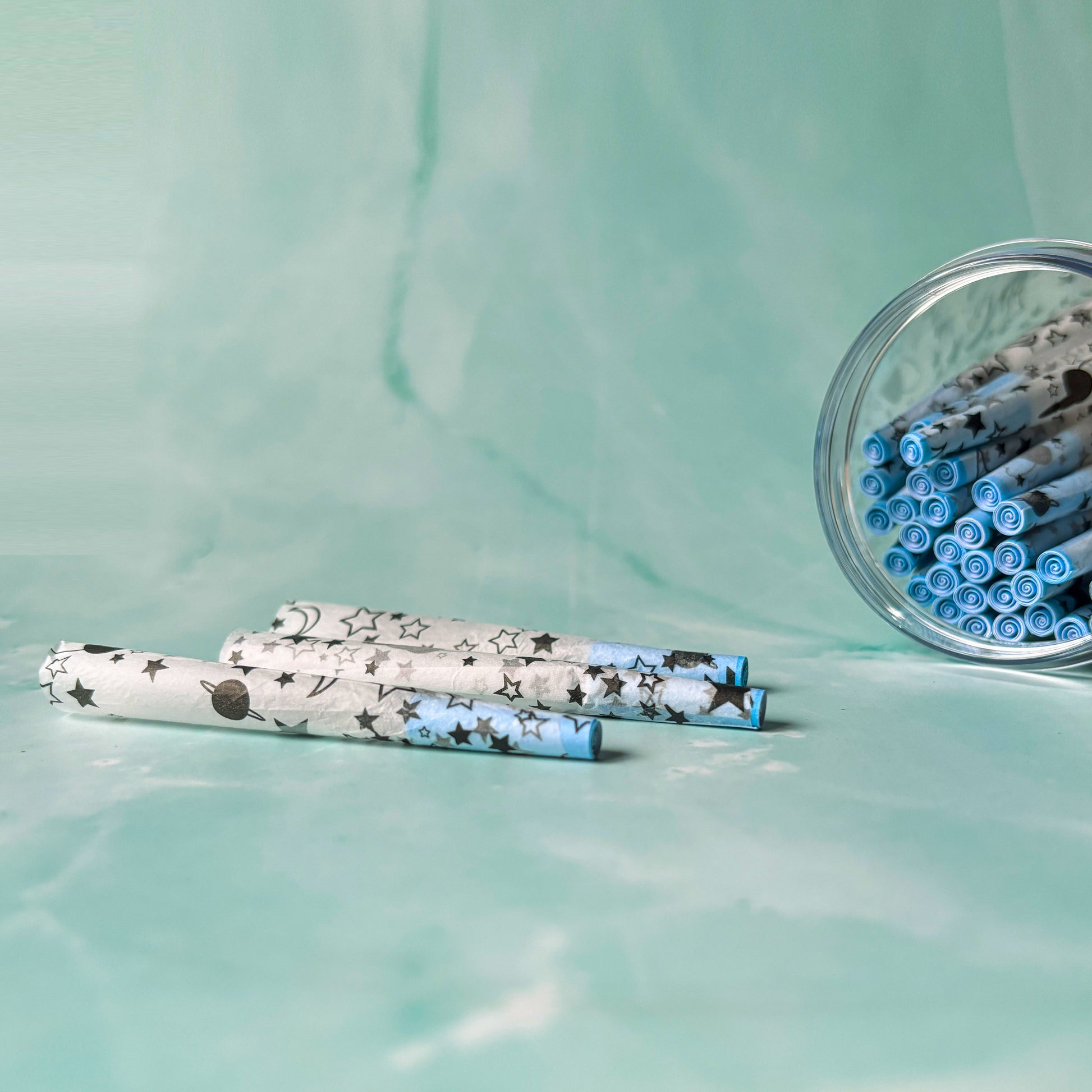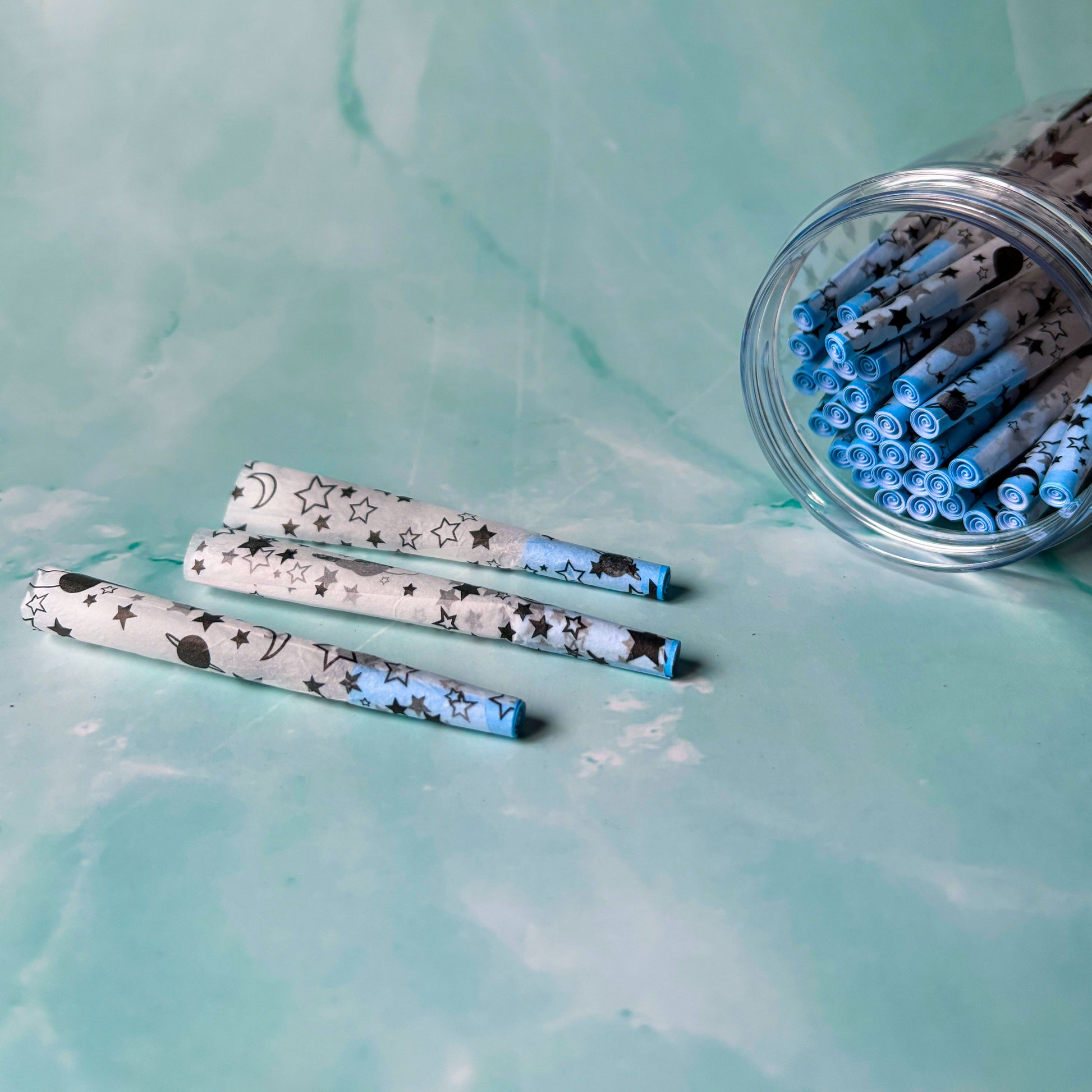 Set of 35 star-spangled cones. All of our cones are hand rolled and printed with vegan, food-grade inks. Each pack consists of 35 galaxy-patterned cones with color-coordinated filters.
