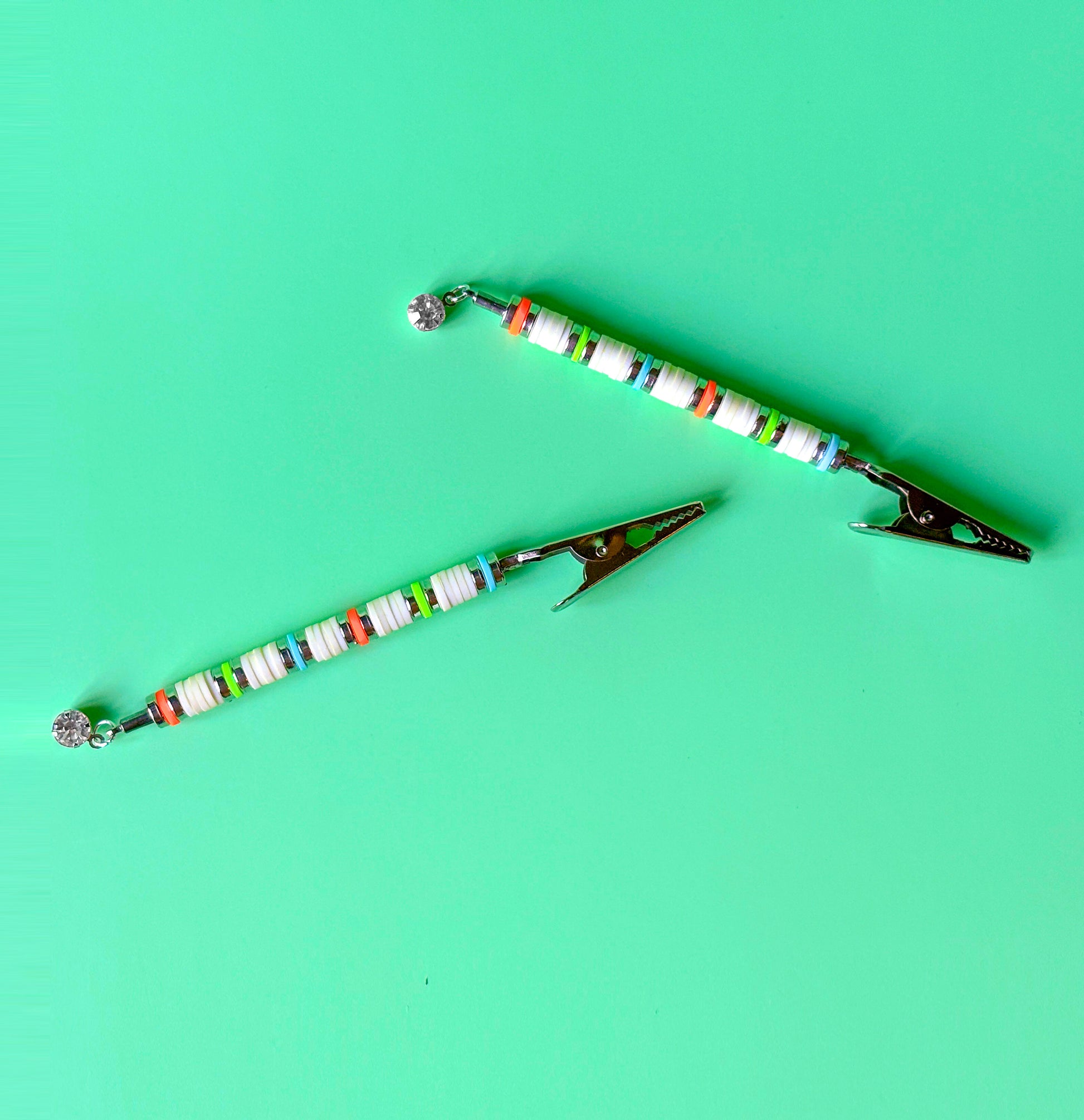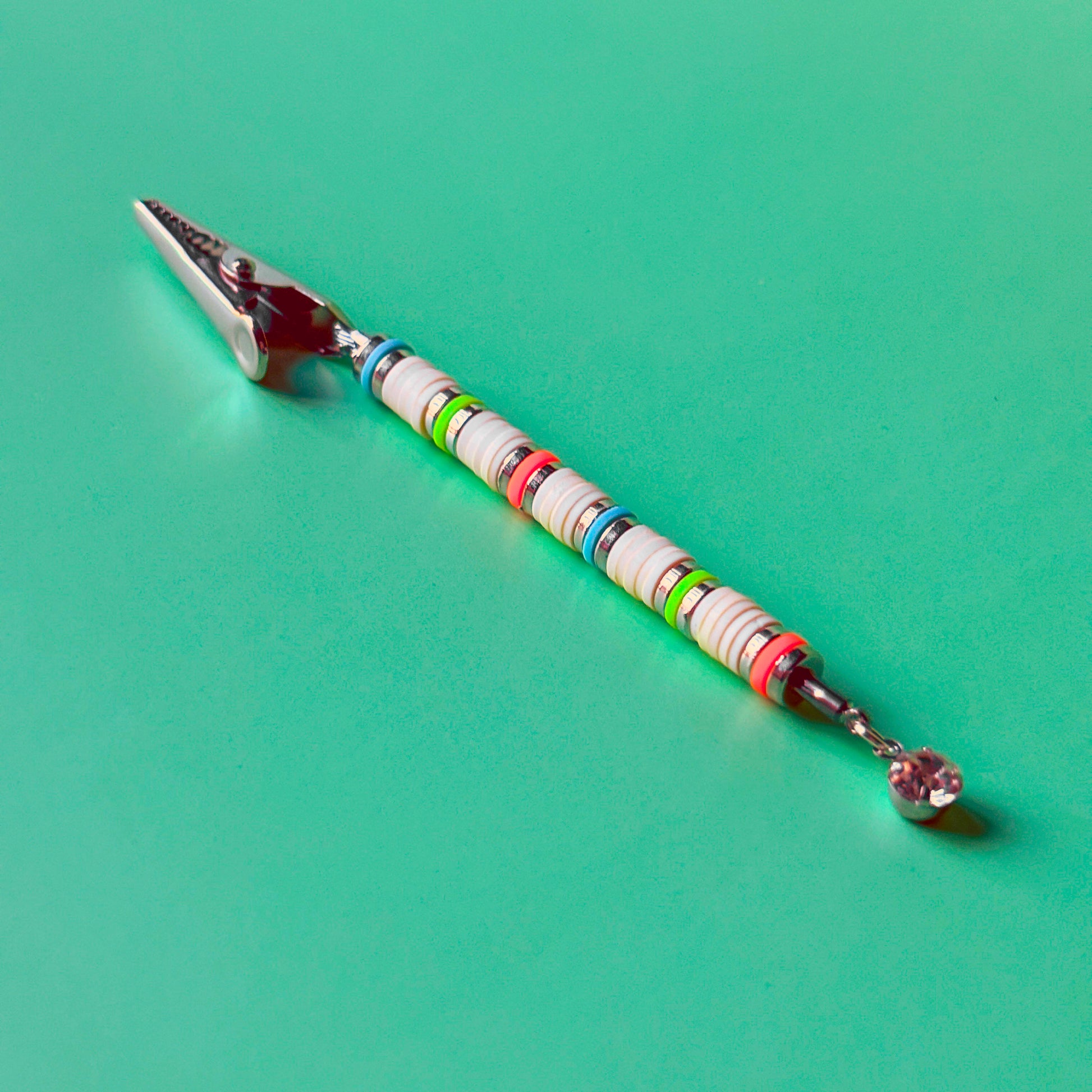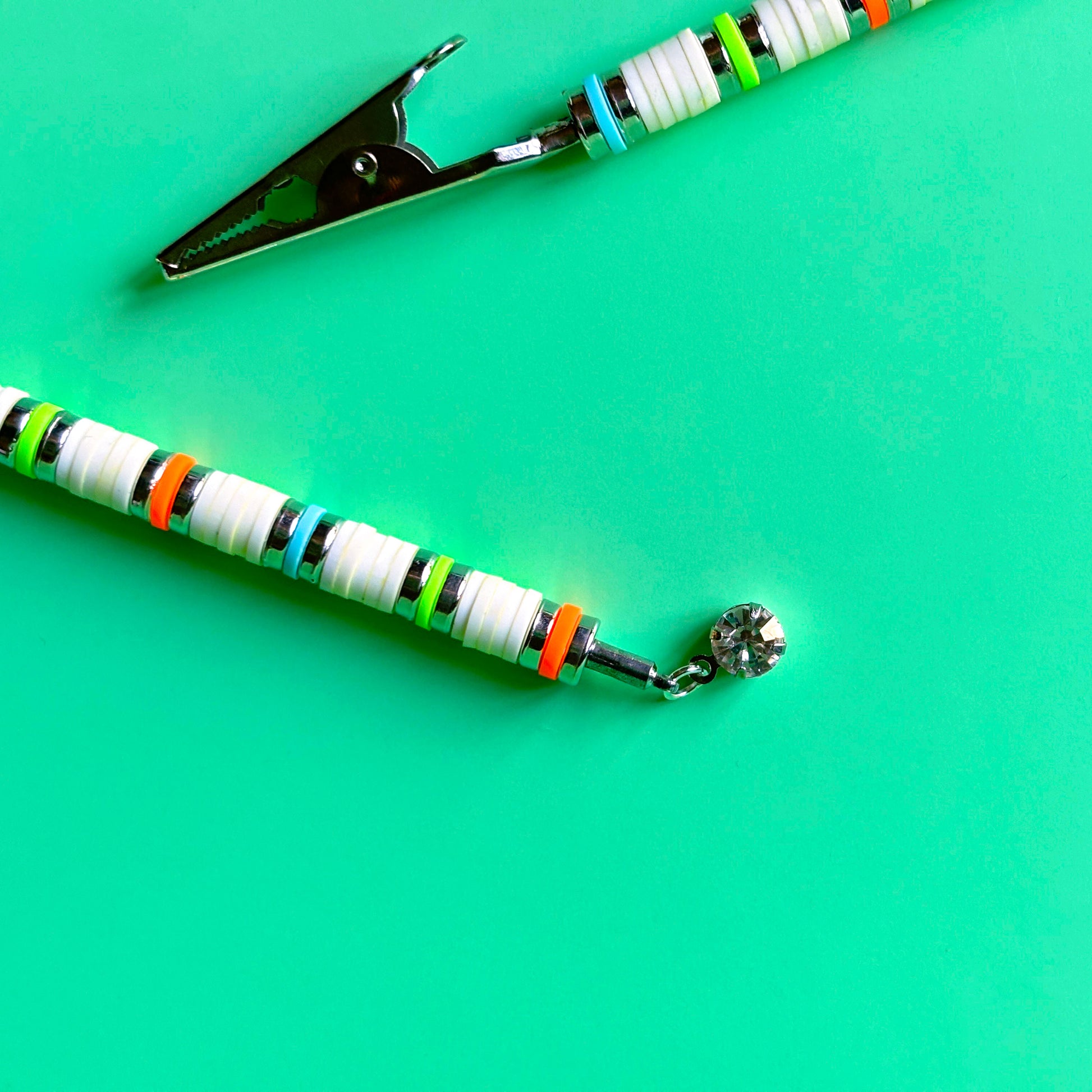 This beachy J Clip is made from white heishi beads accented with silver, blue, orange and green. Finished with a glass crystal dangle. Handmade in NYC.