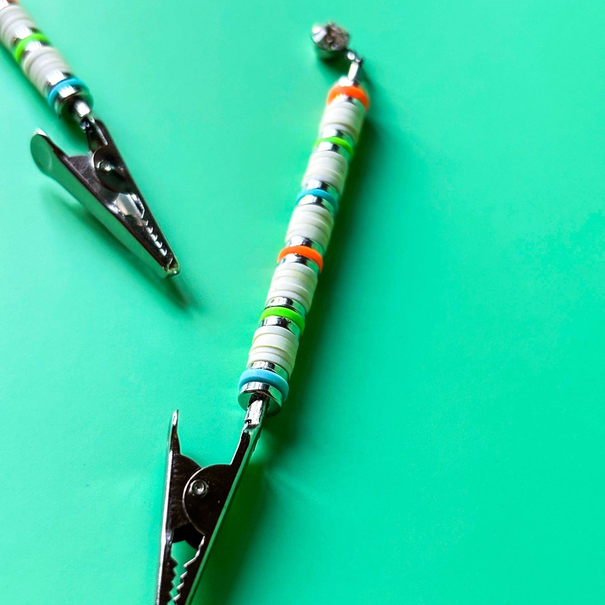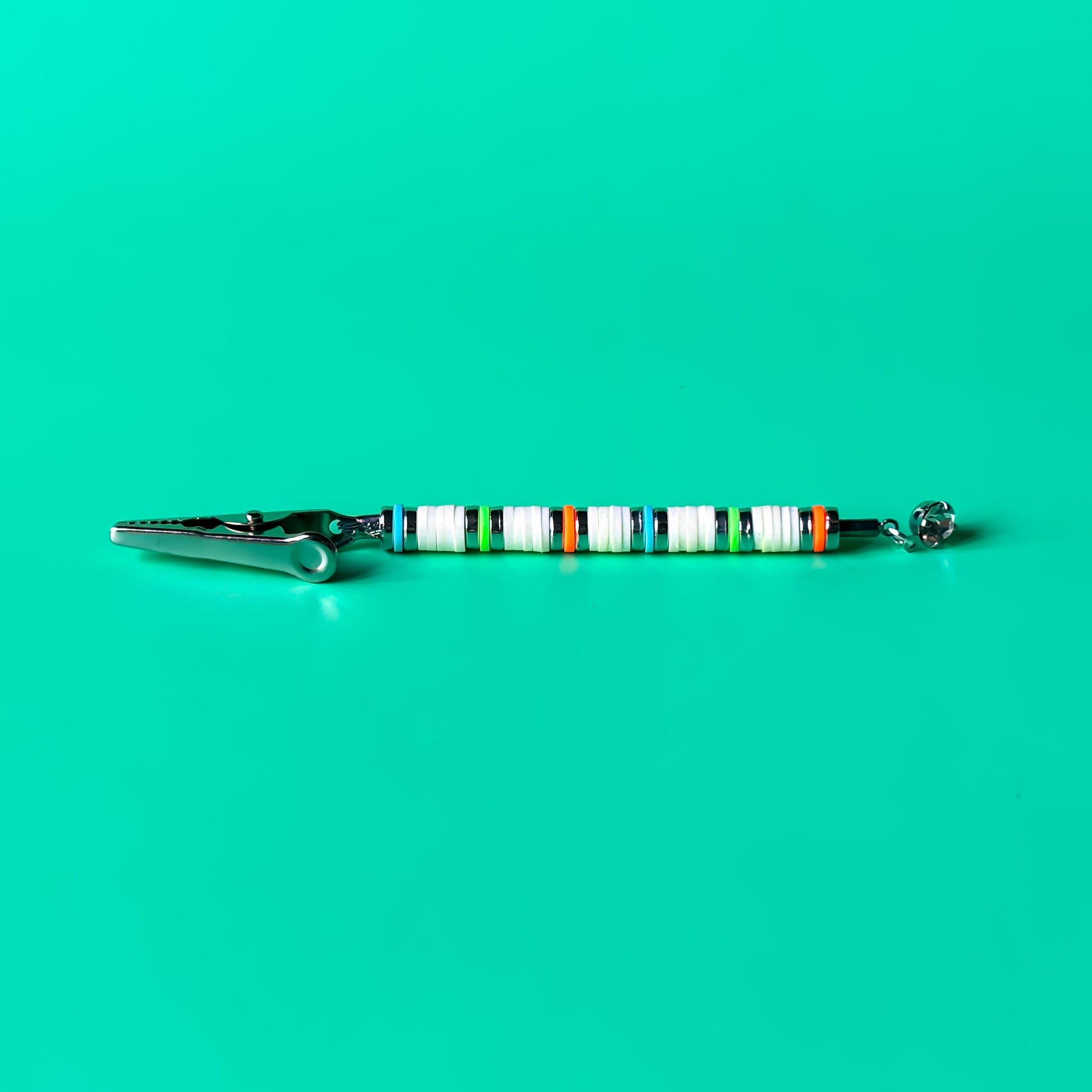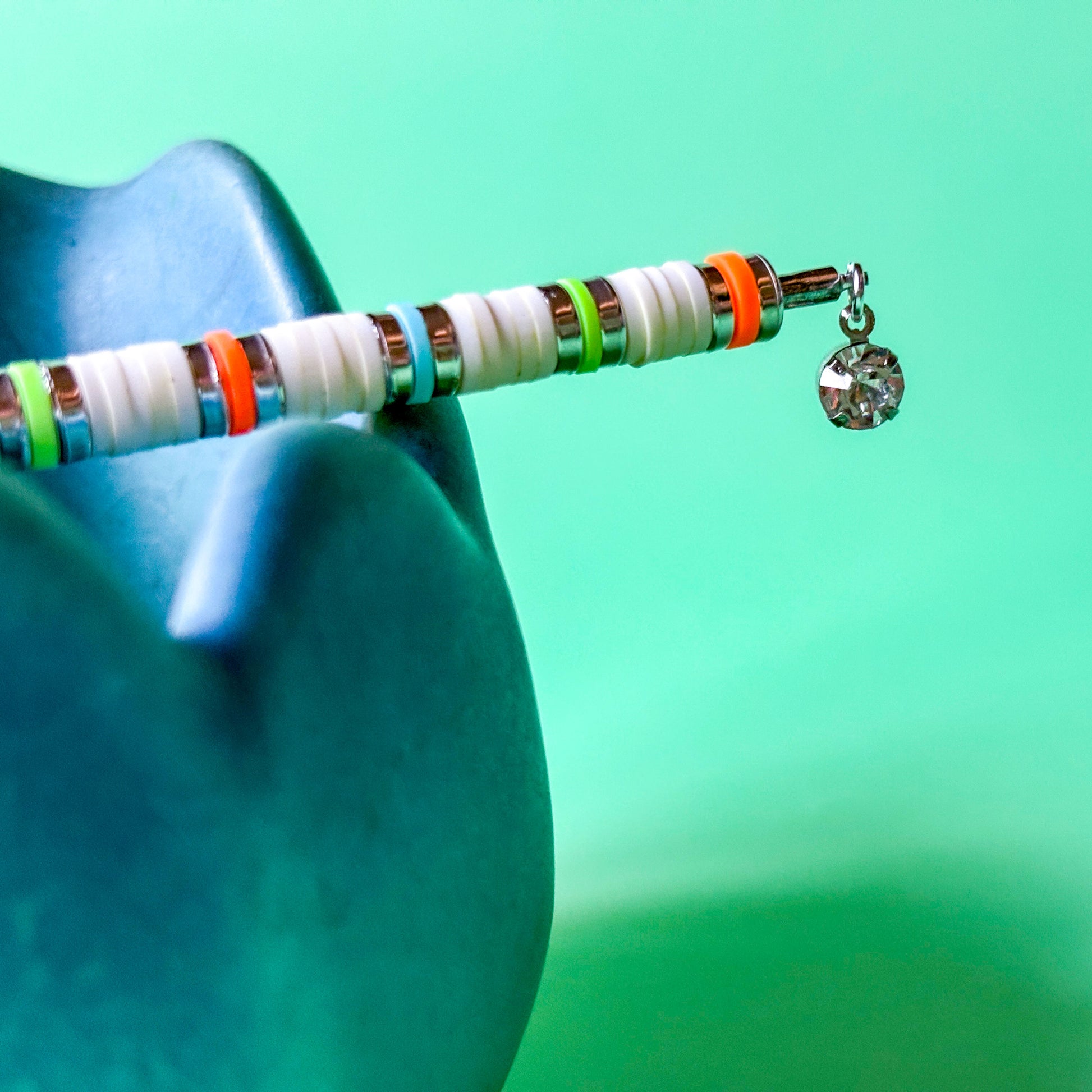 This beachy J Clip is made from white heishi beads accented with silver, blue, orange and green. Finished with a glass crystal dangle. Handmade in NYC.