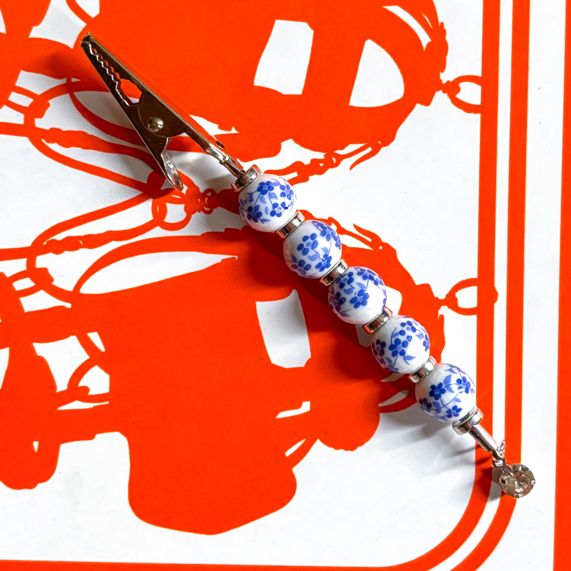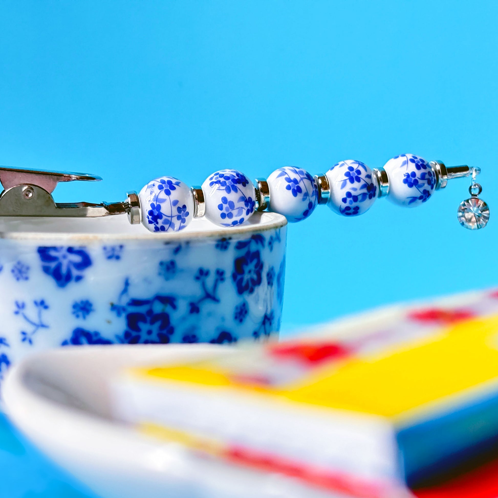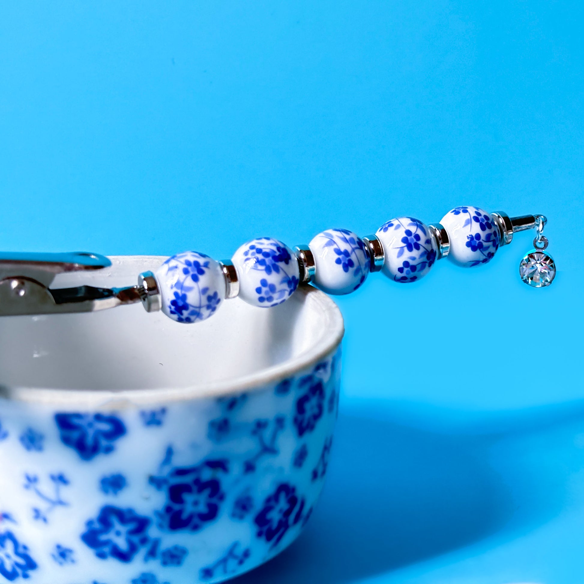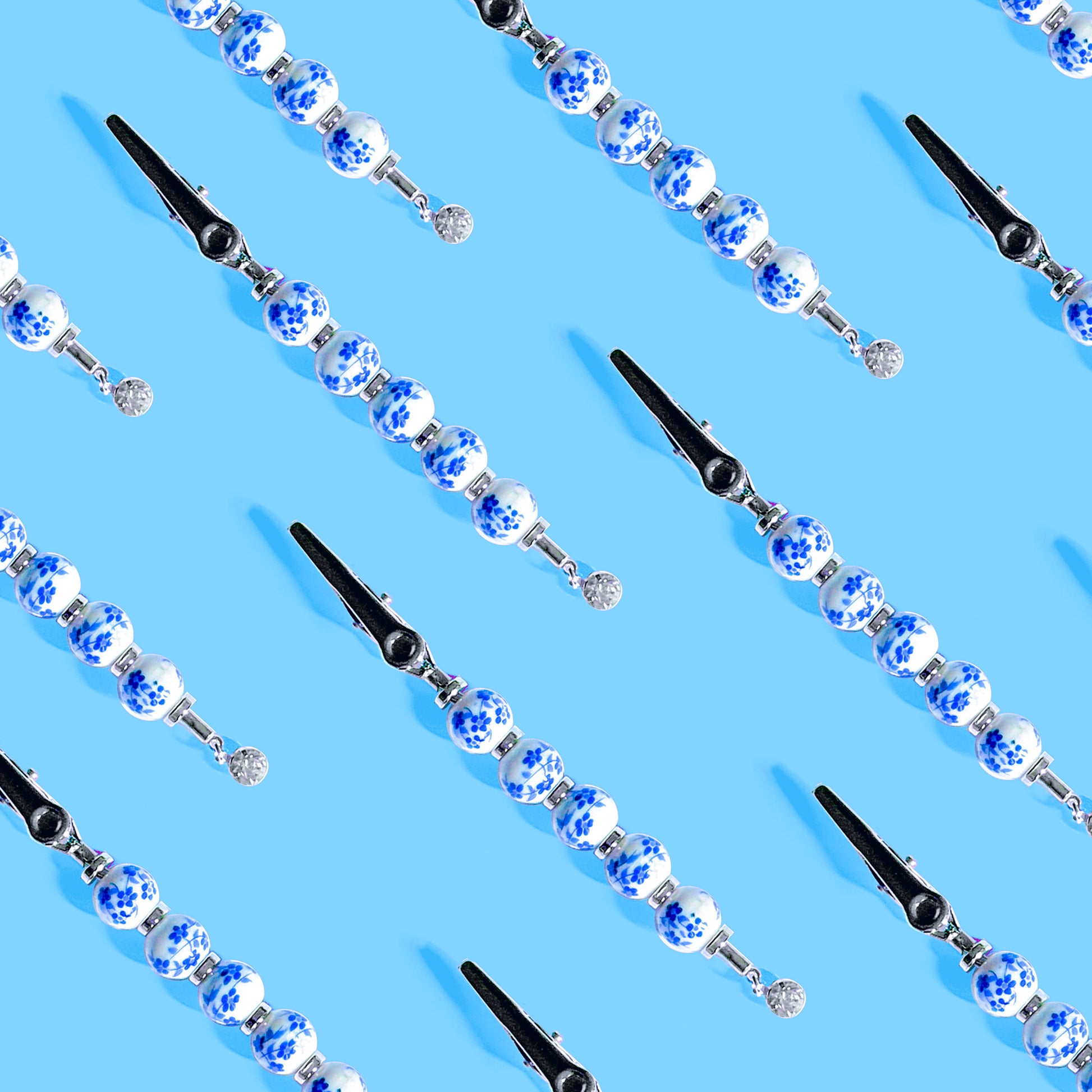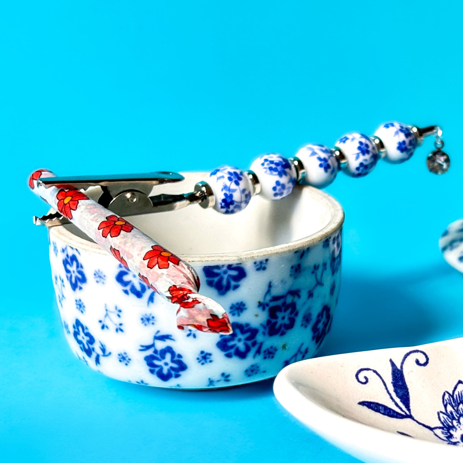 Upgrade your sesh with this chinoiserie-inspired J holder 💙 Adorned with blue and white floral beads, this J clip is handmade in NYC. Made with lightweight ceramic beads and silver-plated brass findings, the Toile J Clip is finished with a small crystal drop.
