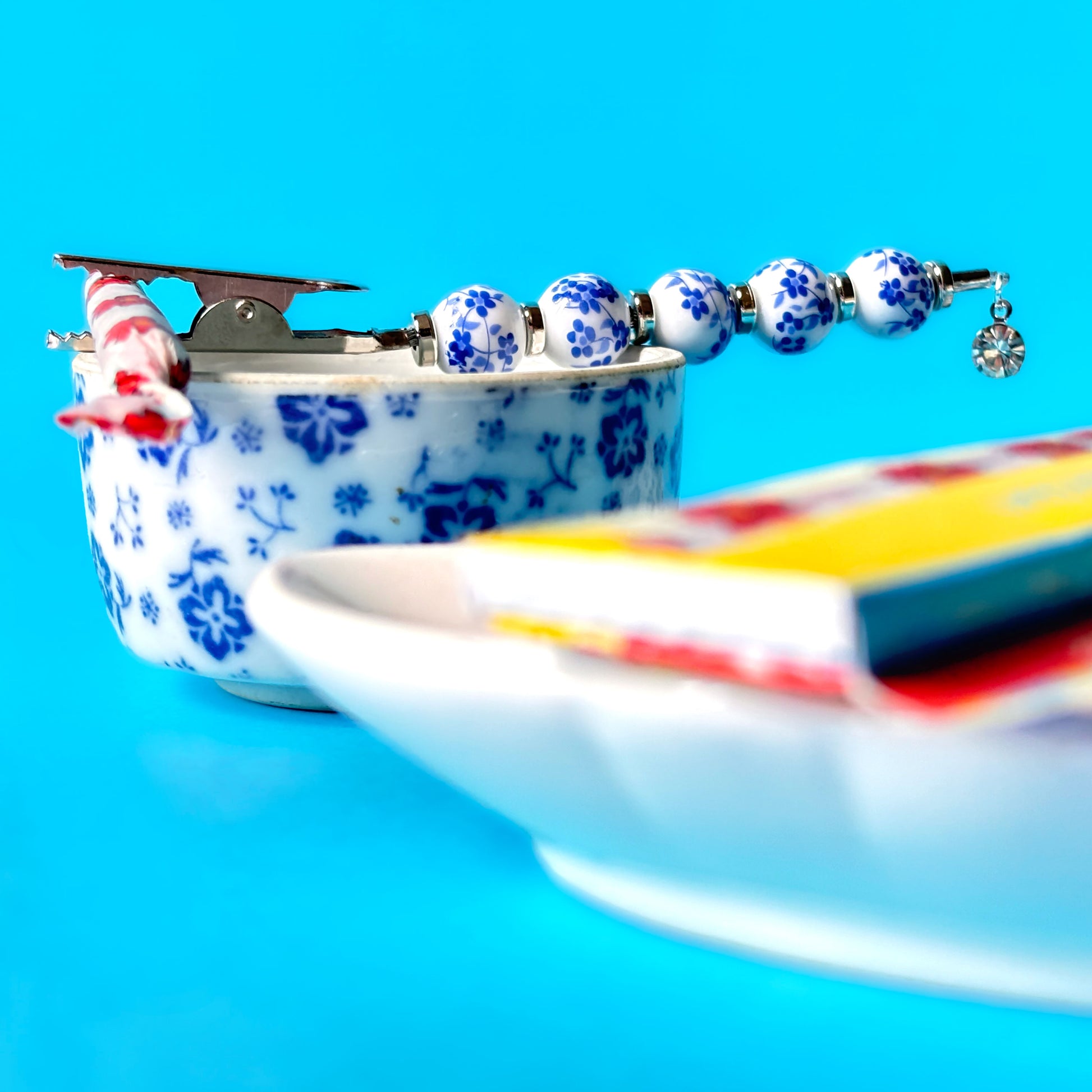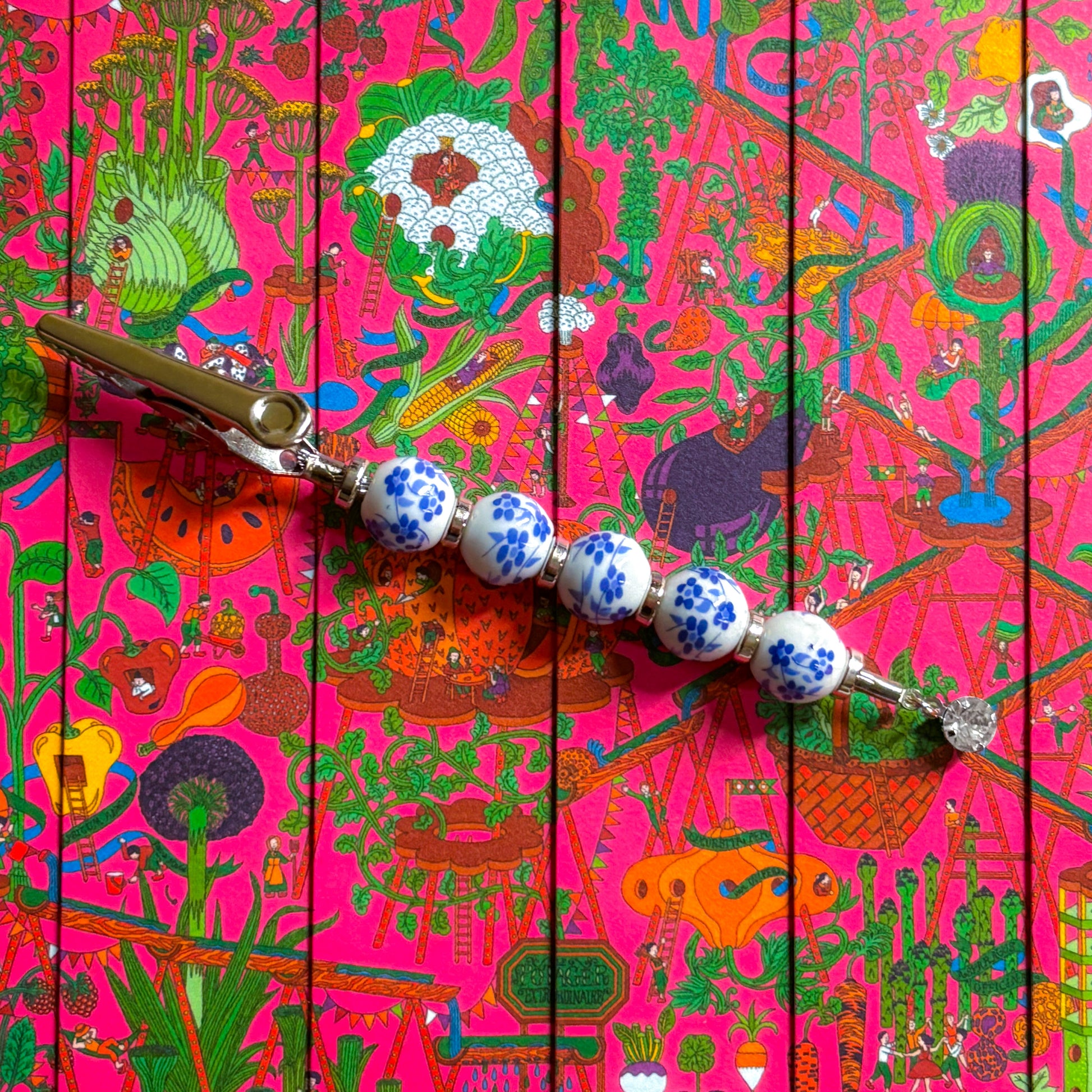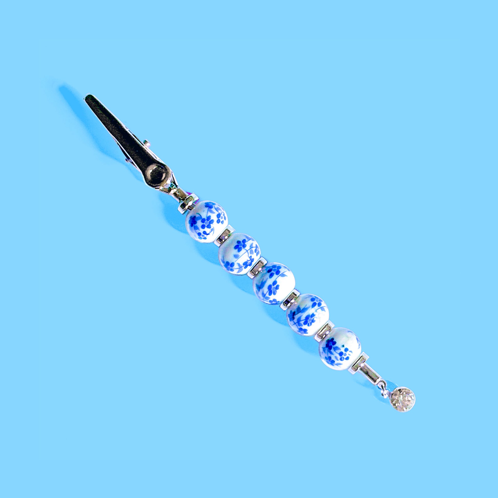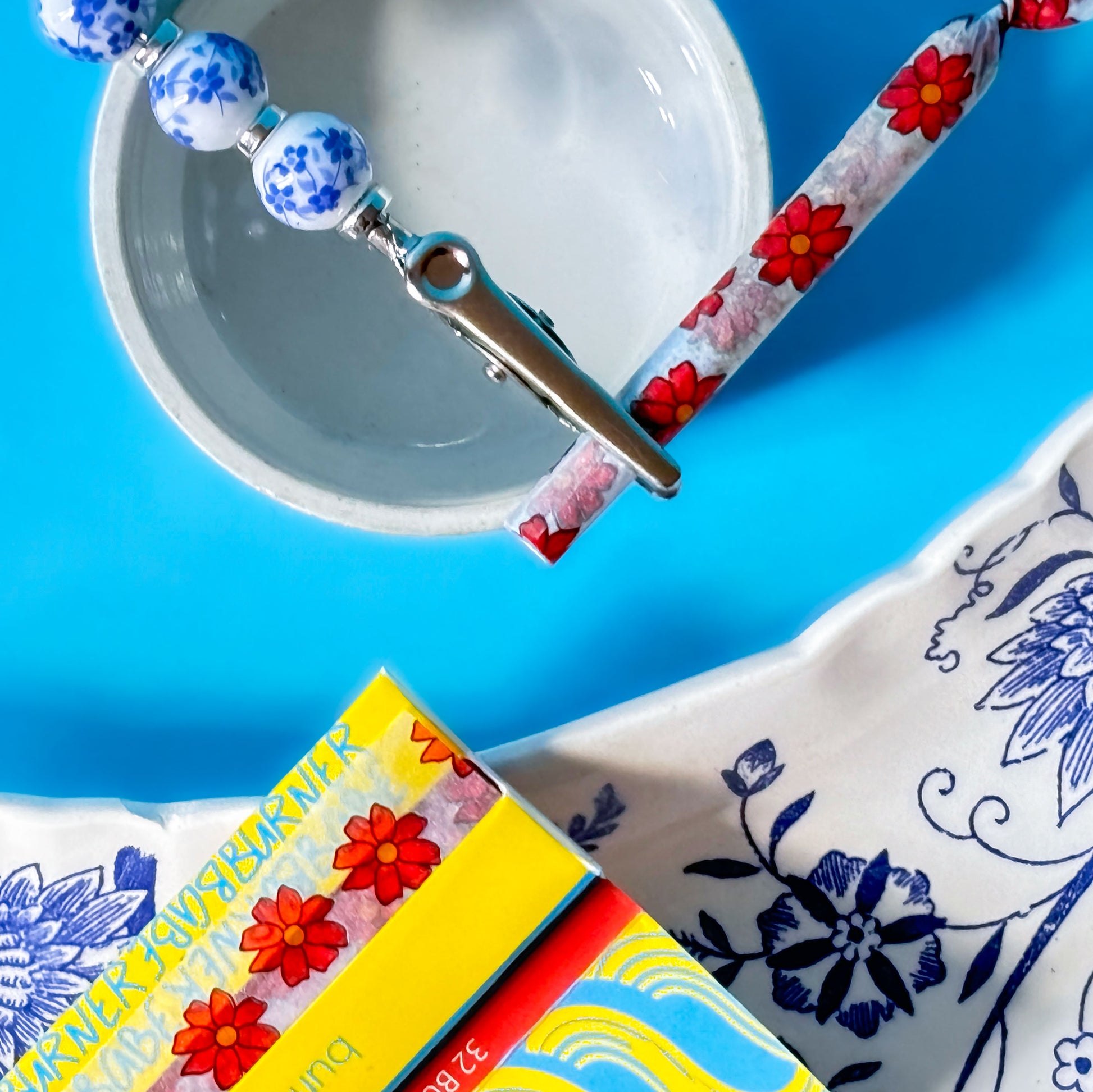 Upgrade your sesh with this chinoiserie-inspired J holder 💙 Adorned with blue and white floral beads, this J clip is handmade in NYC. Made with lightweight ceramic beads and silver-plated brass findings, the Toile J Clip is finished with a small crystal drop.