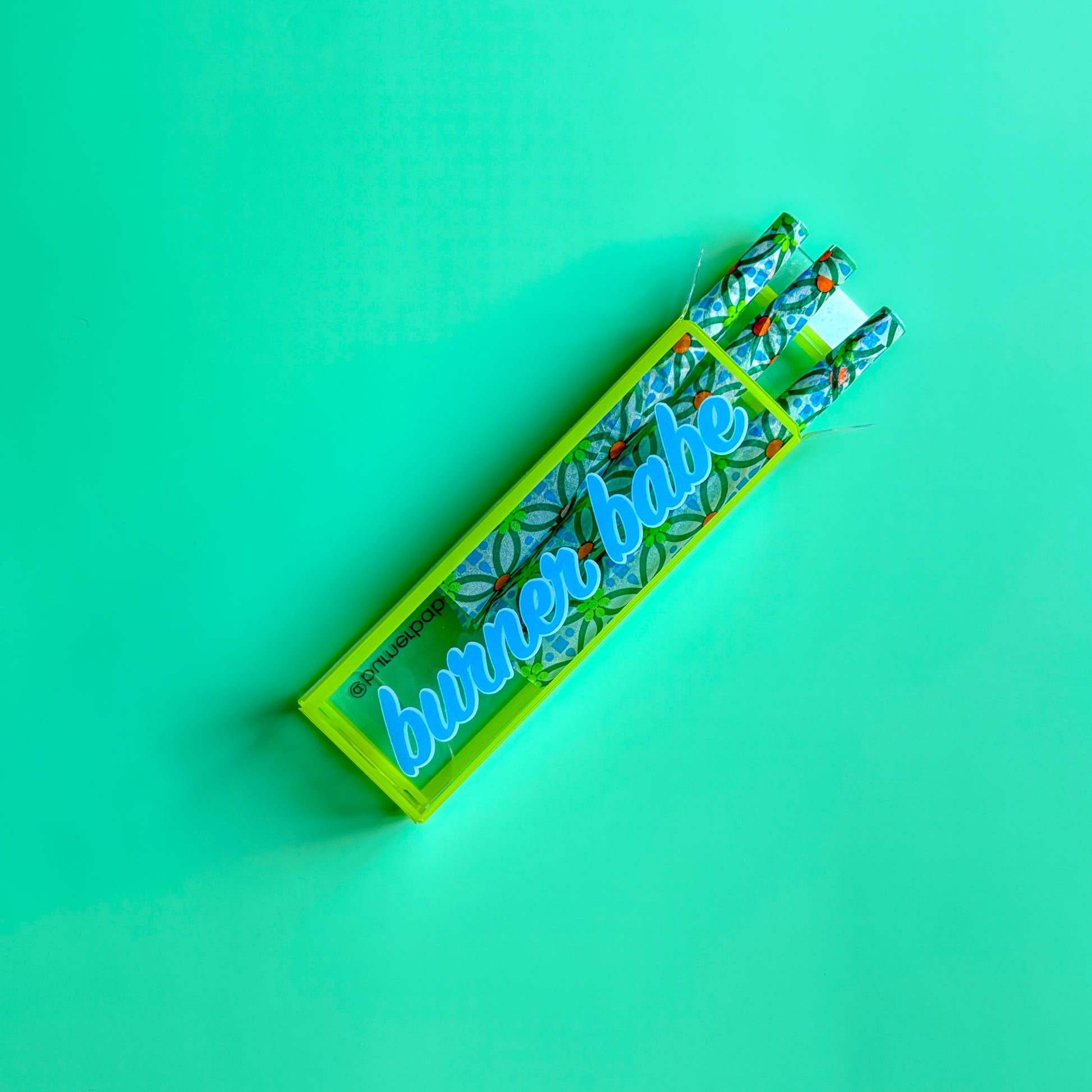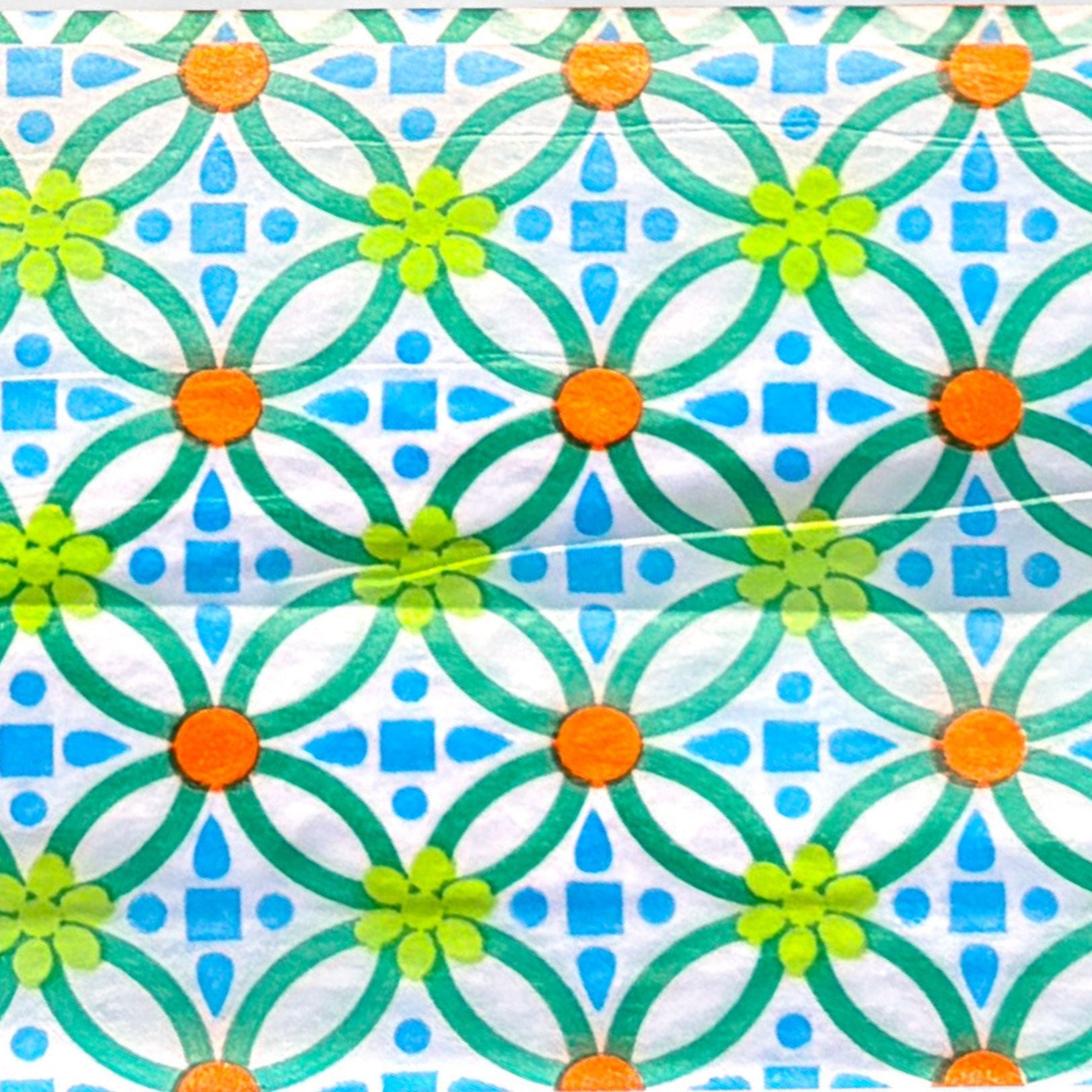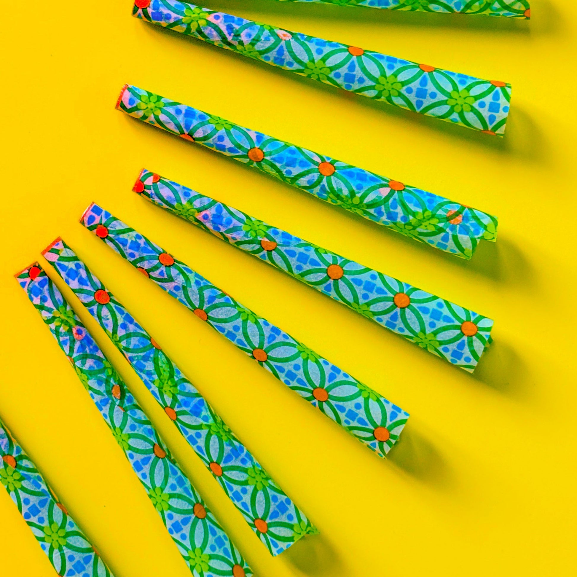 The Trellis Cones Cones are decorated in a geometric blue, green and orange pattern. Printed with plant-based inks. Each pack consists of 3 patterned cones.