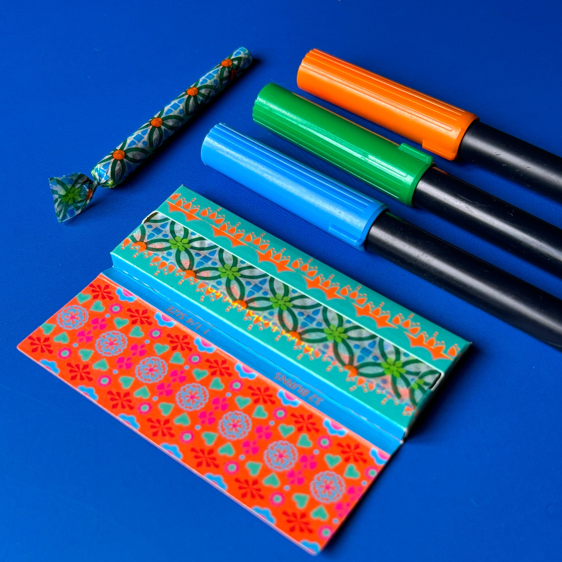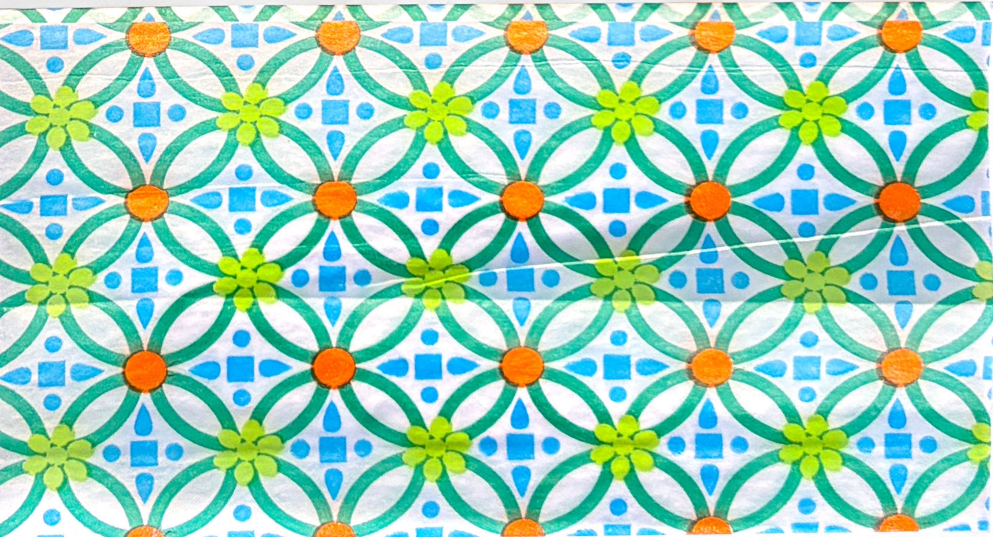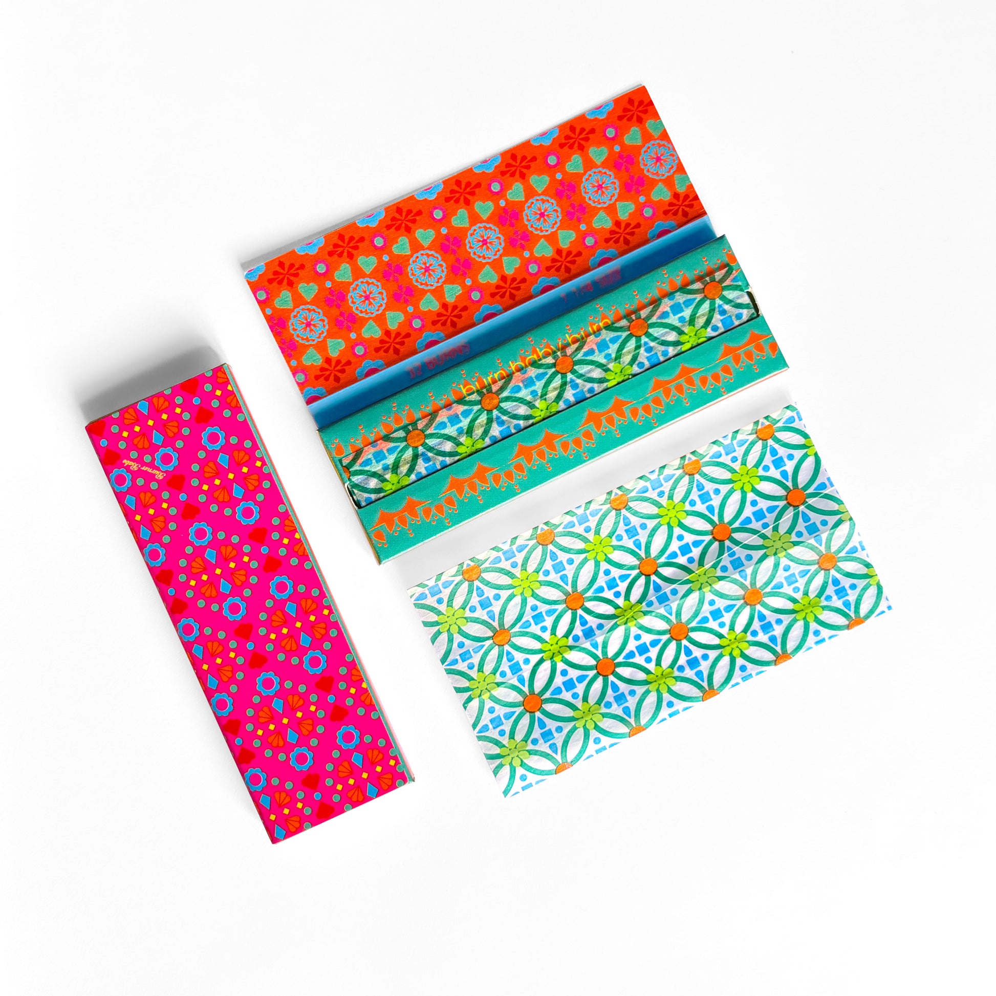 The Trellis Papers are decorated in a geometric blue, green and orange pattern. Printed on rice paper with plant-based inks.
