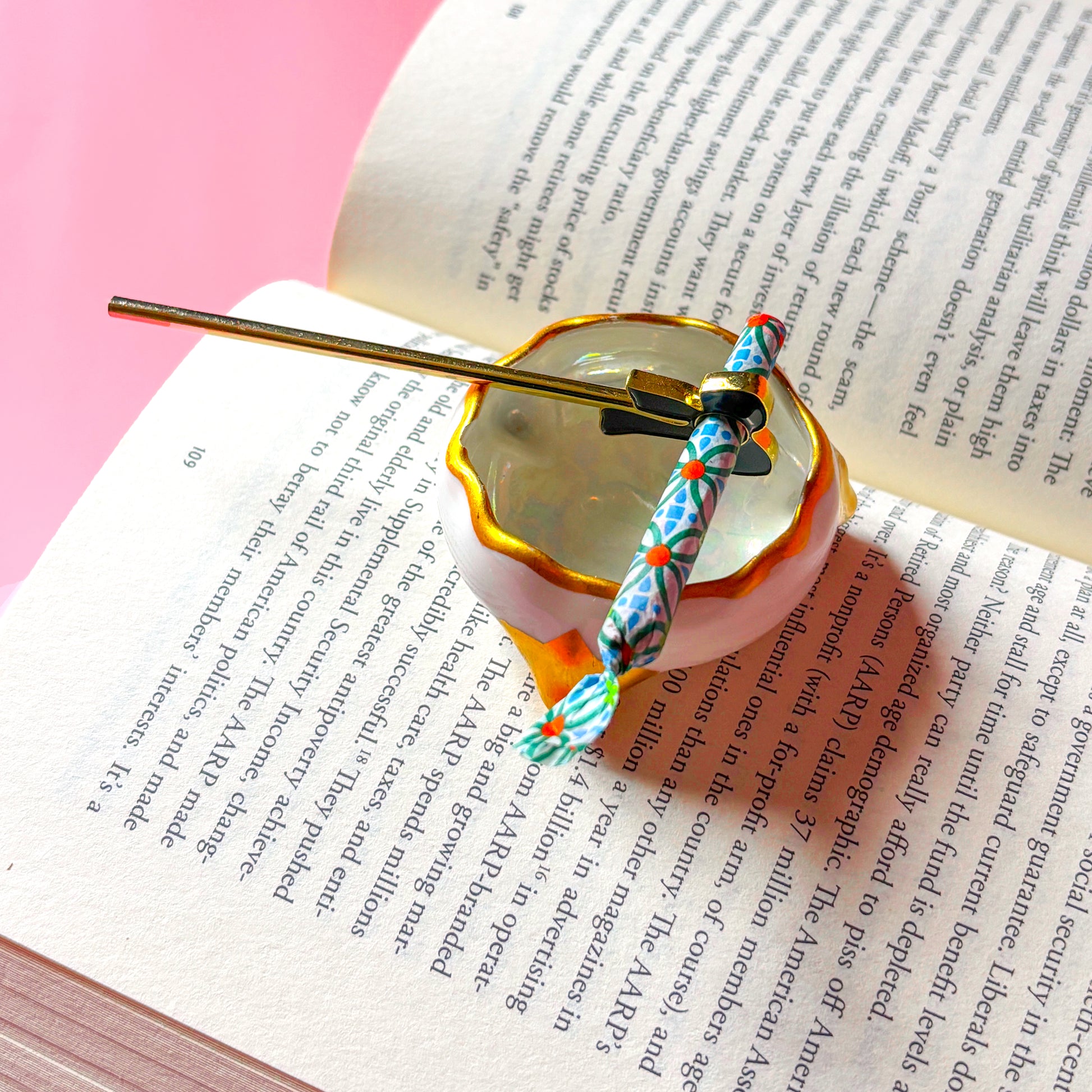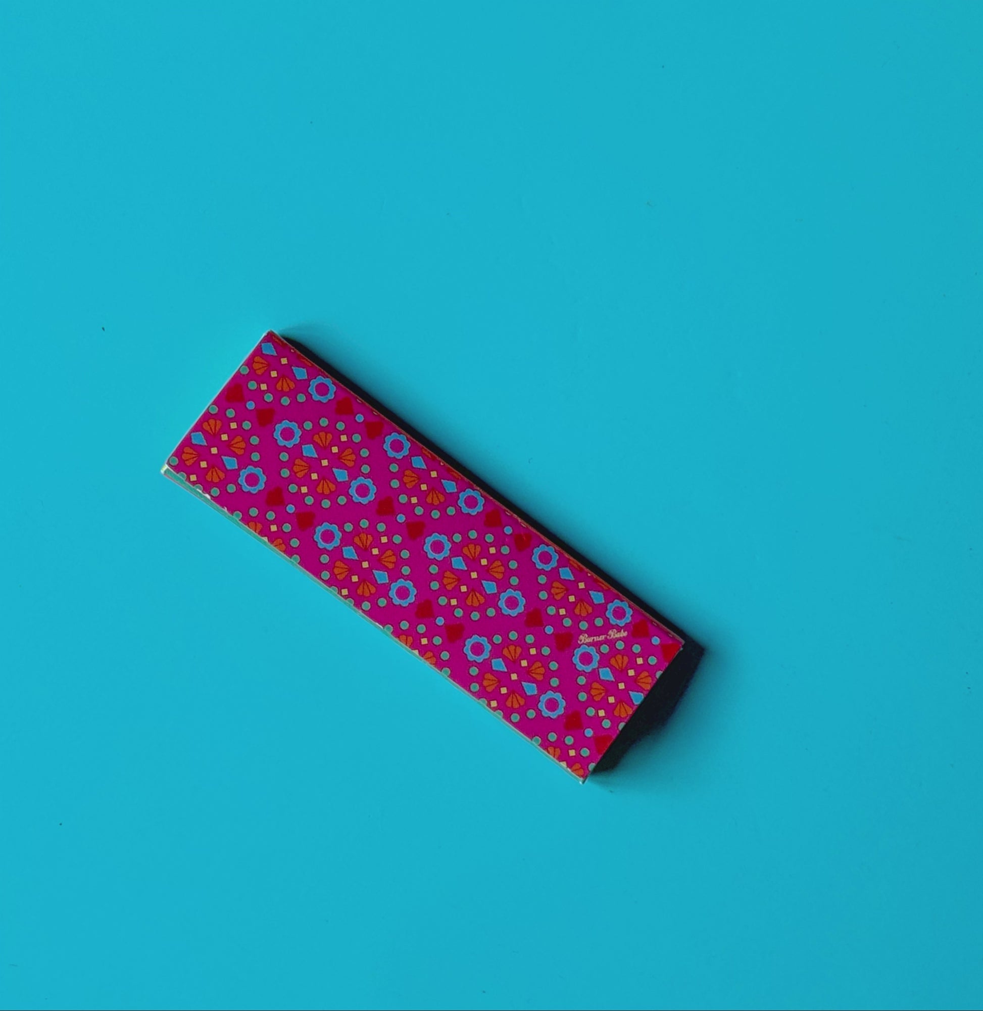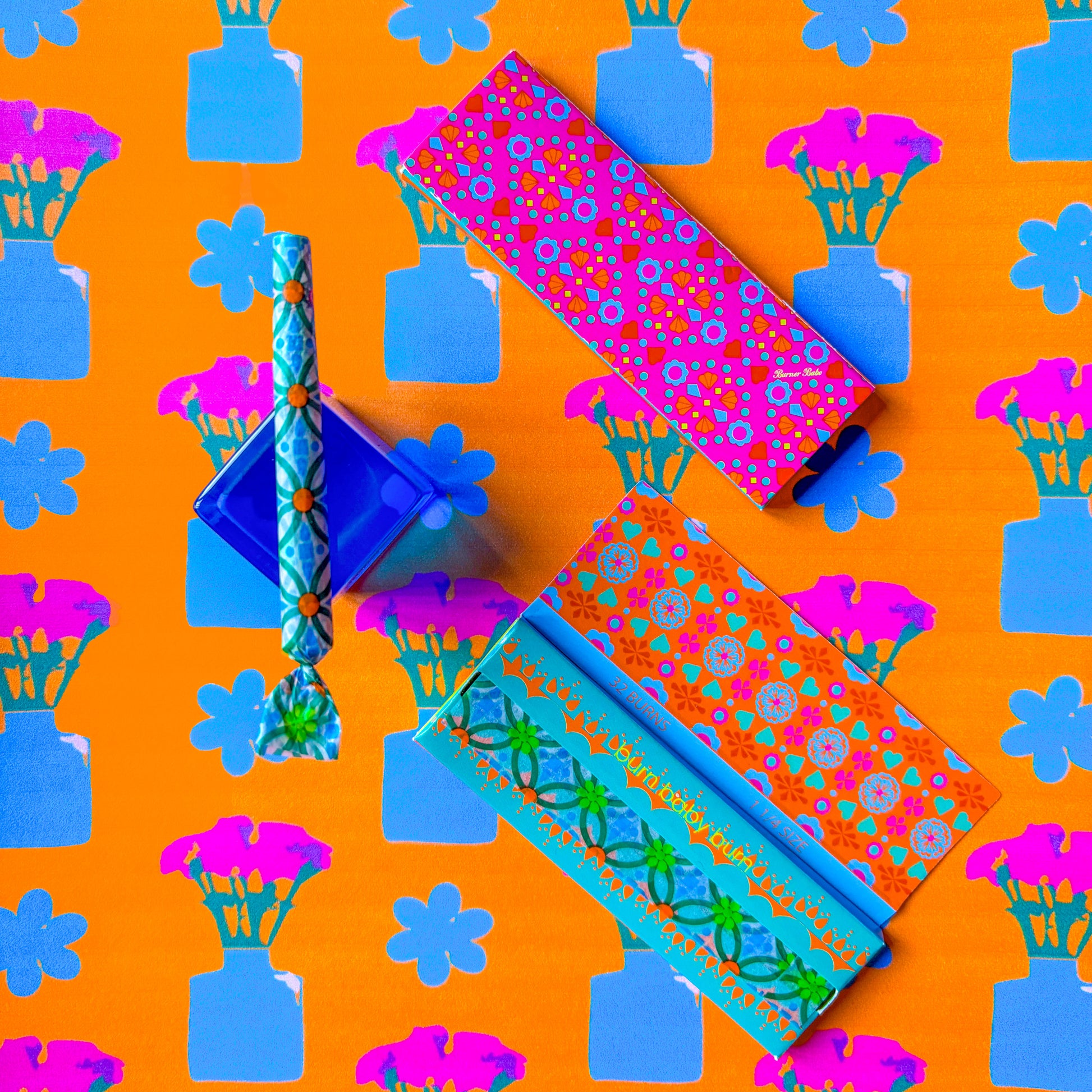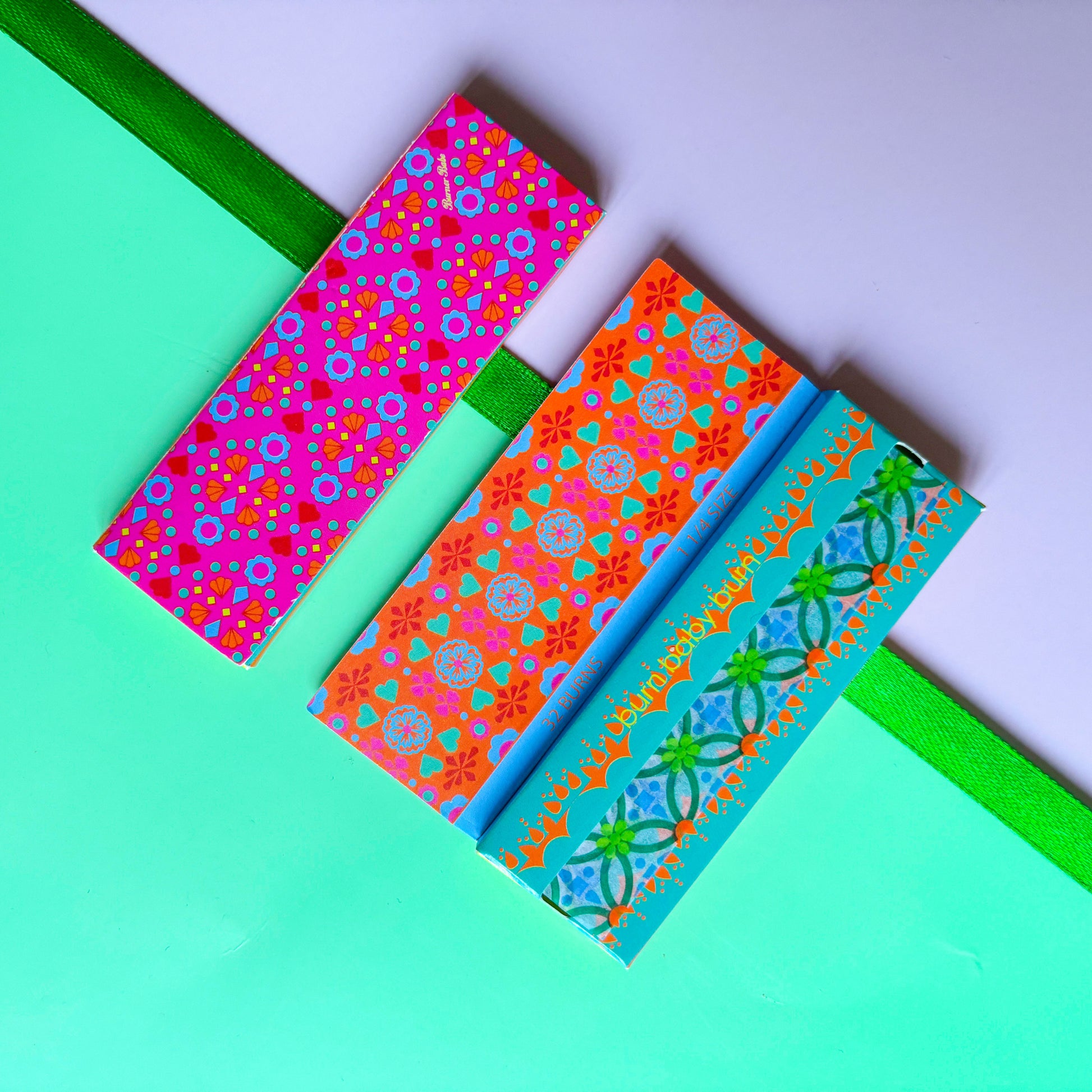 The Trellis Papers are decorated in a geometric blue, green and orange pattern. Printed on rice paper with plant-based inks.