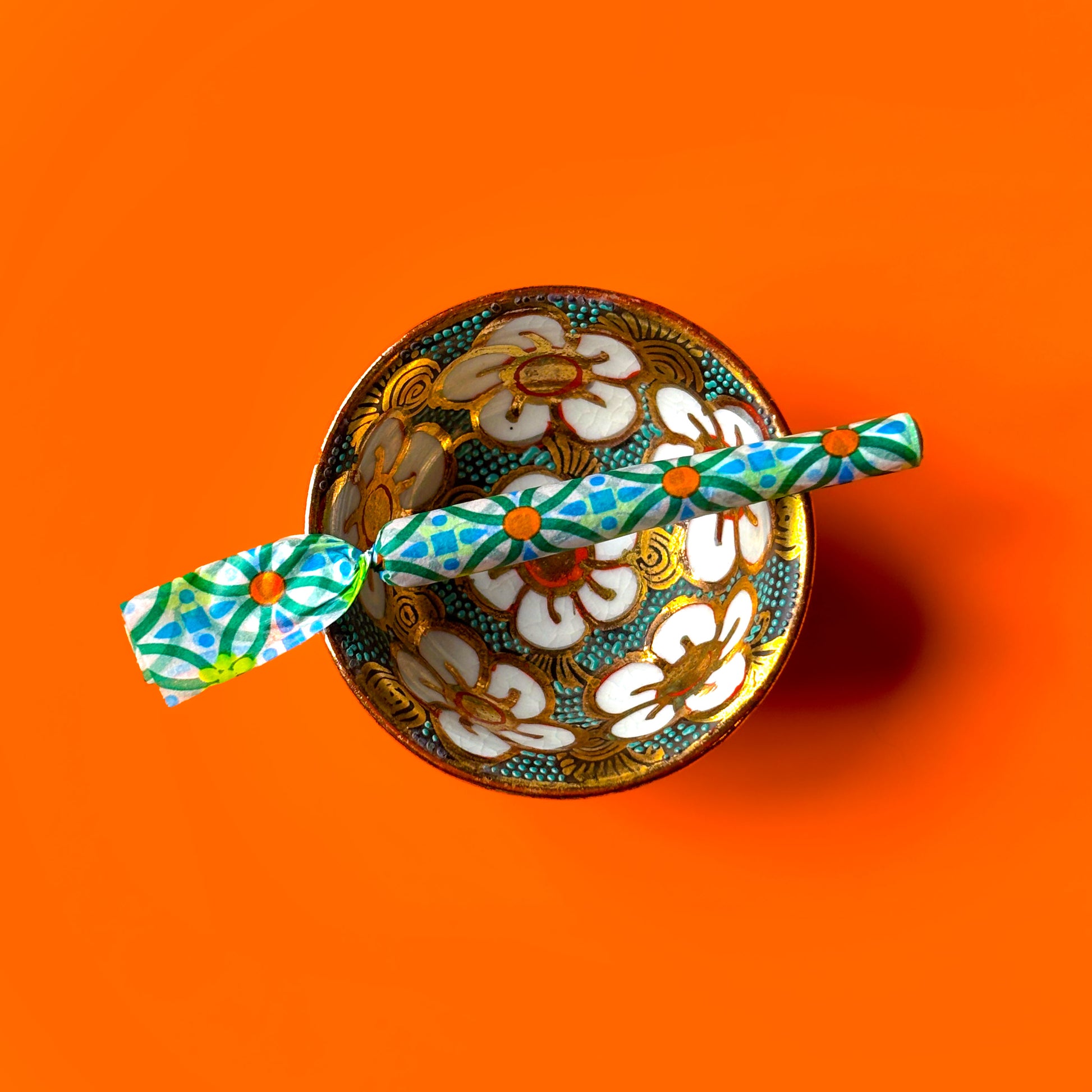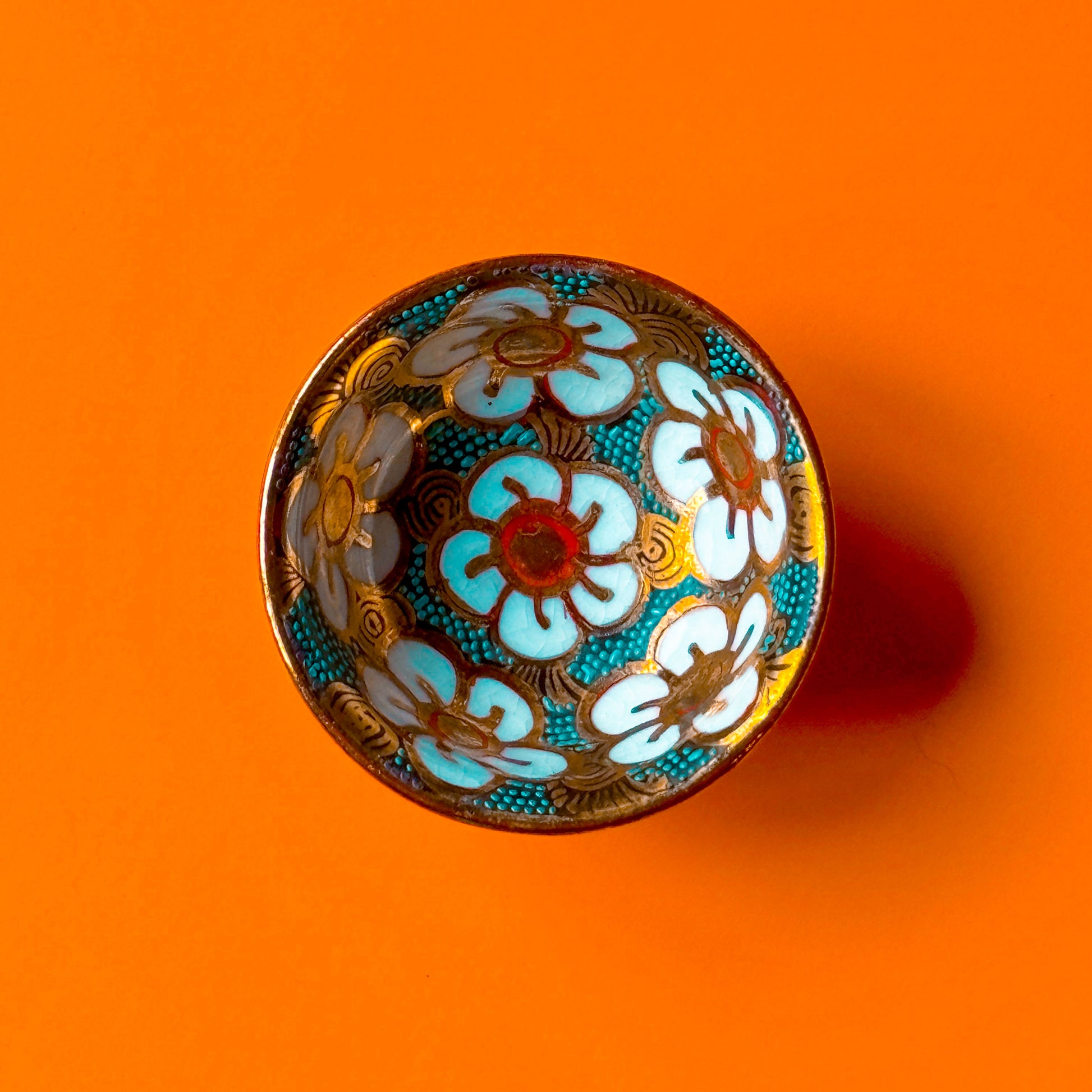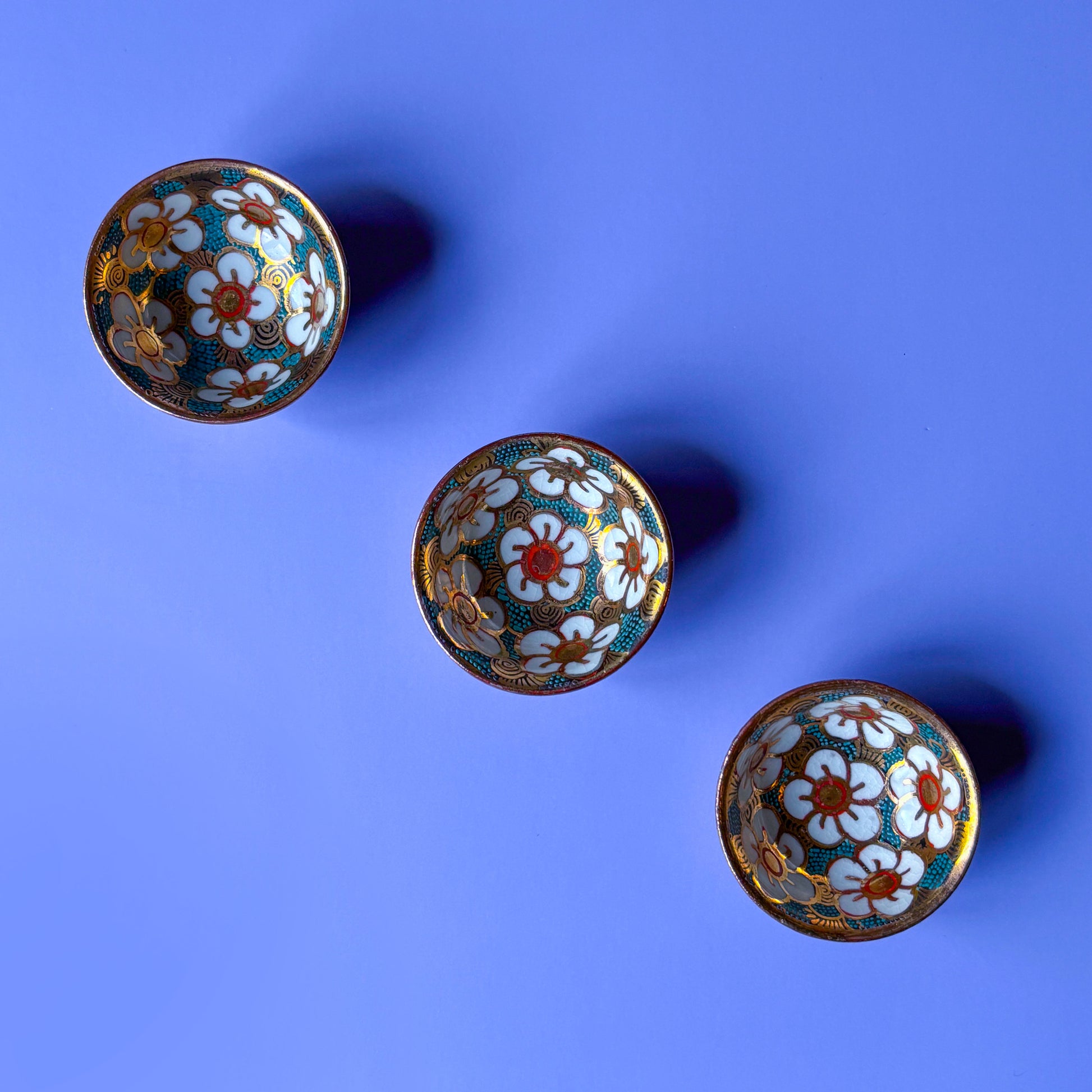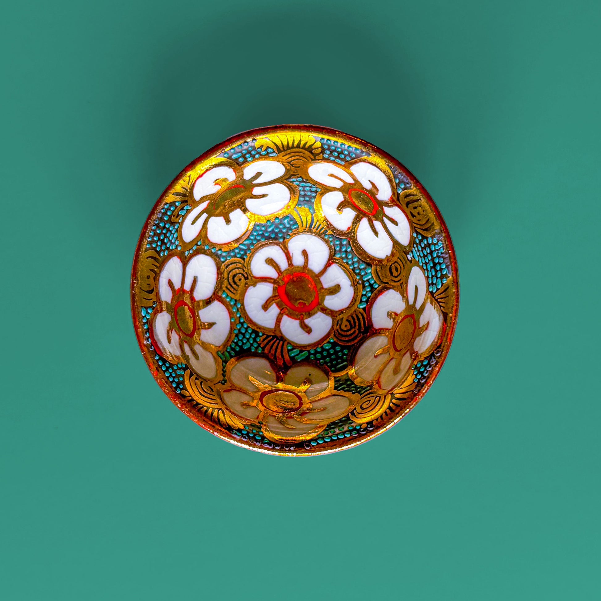 These ashtrays are decorated with bright white cherry blossoms on a teal, red and gold background. At under two inches wide and one inch tall, this petite ashtray is suitable for the deck, the desk or the bedside table. Originally intended as salt cellars, these porcelain pieces are hand-painted in Japan.