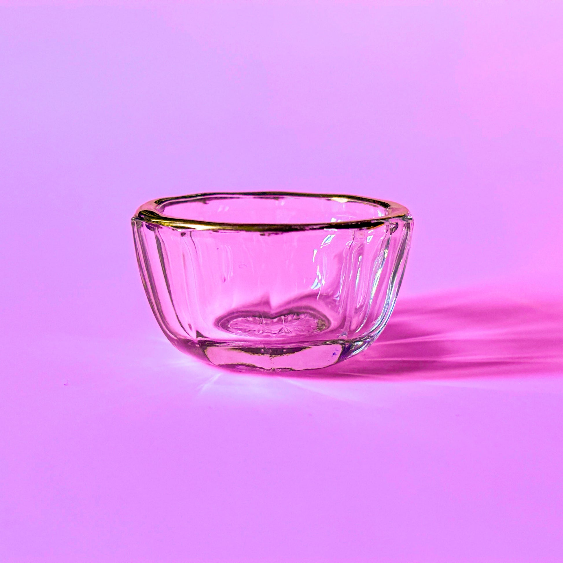 At under 2 inches wide, these small ashtrays are perfect for the vanity, the desk or the bedside table. Originally intended as salt cellars, these cut glass pieces are finished with gold detailing at the rim.