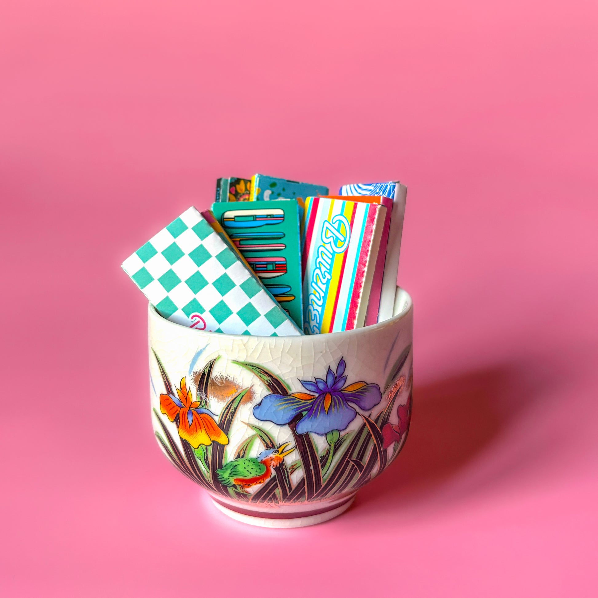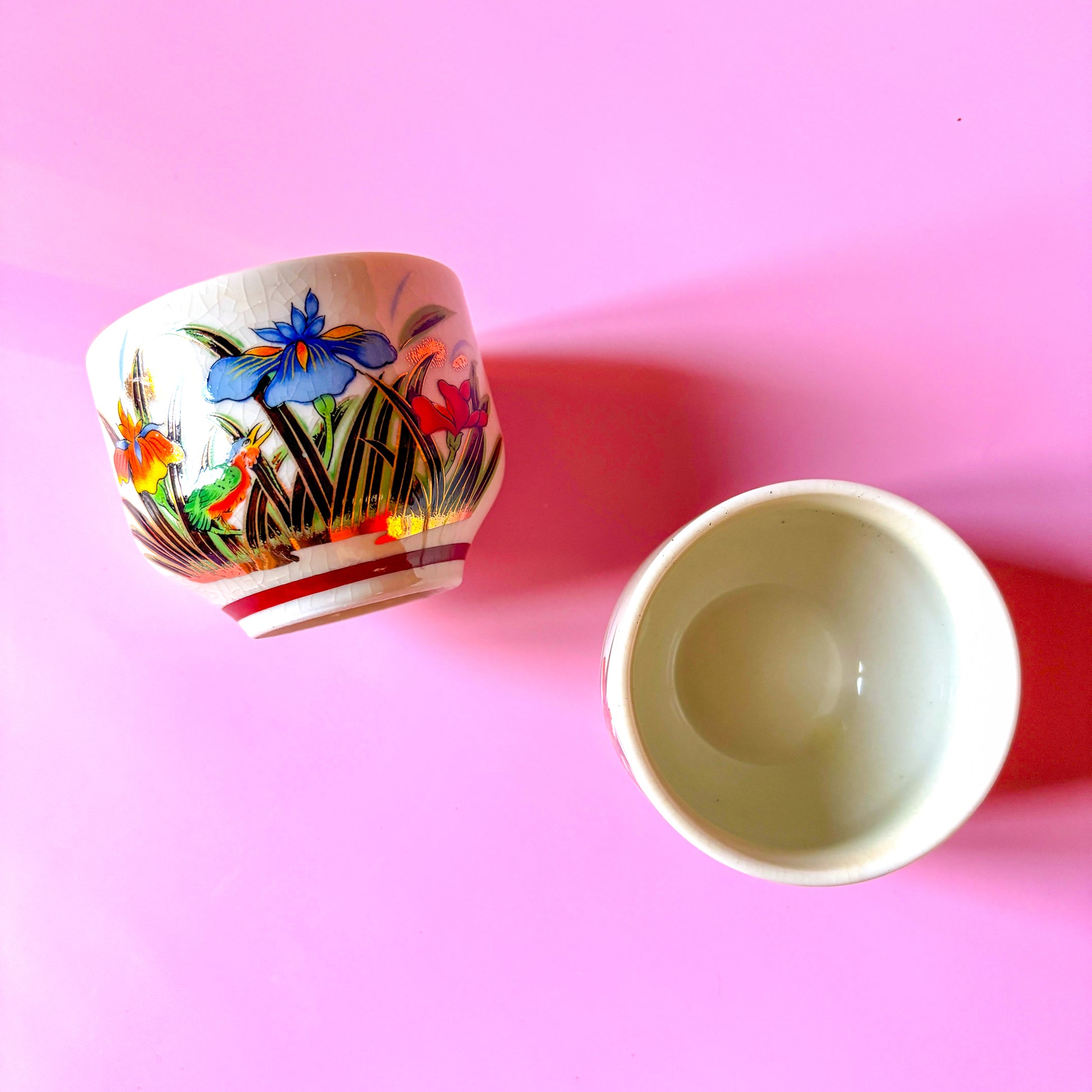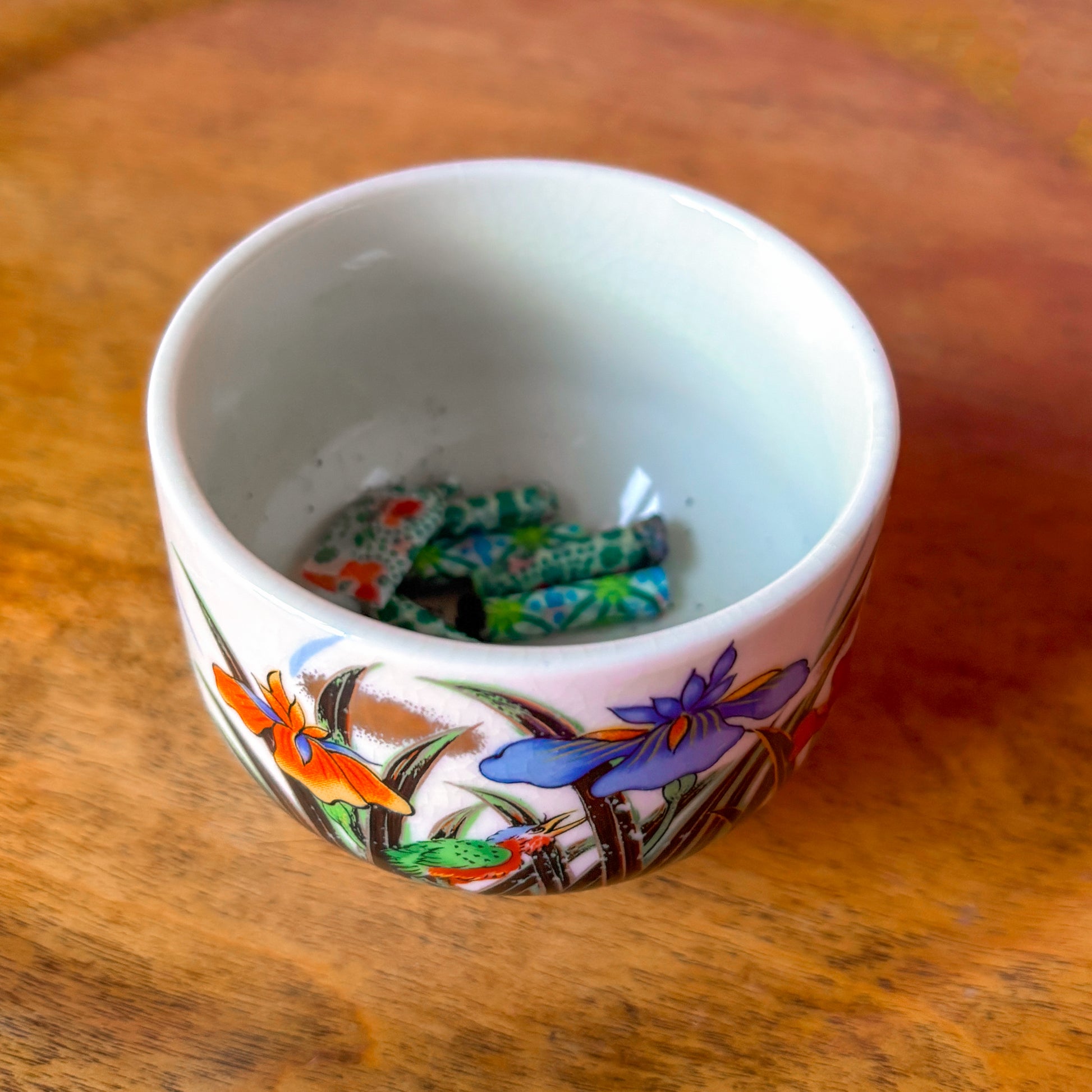 At just under 2.5 inches tall and 3 inches wide, these colorful ashtrays are perfect for your bedside, mantel or poolside. Originally intended as sake cups, these porcelain pieces are hand painted in Japan.Β