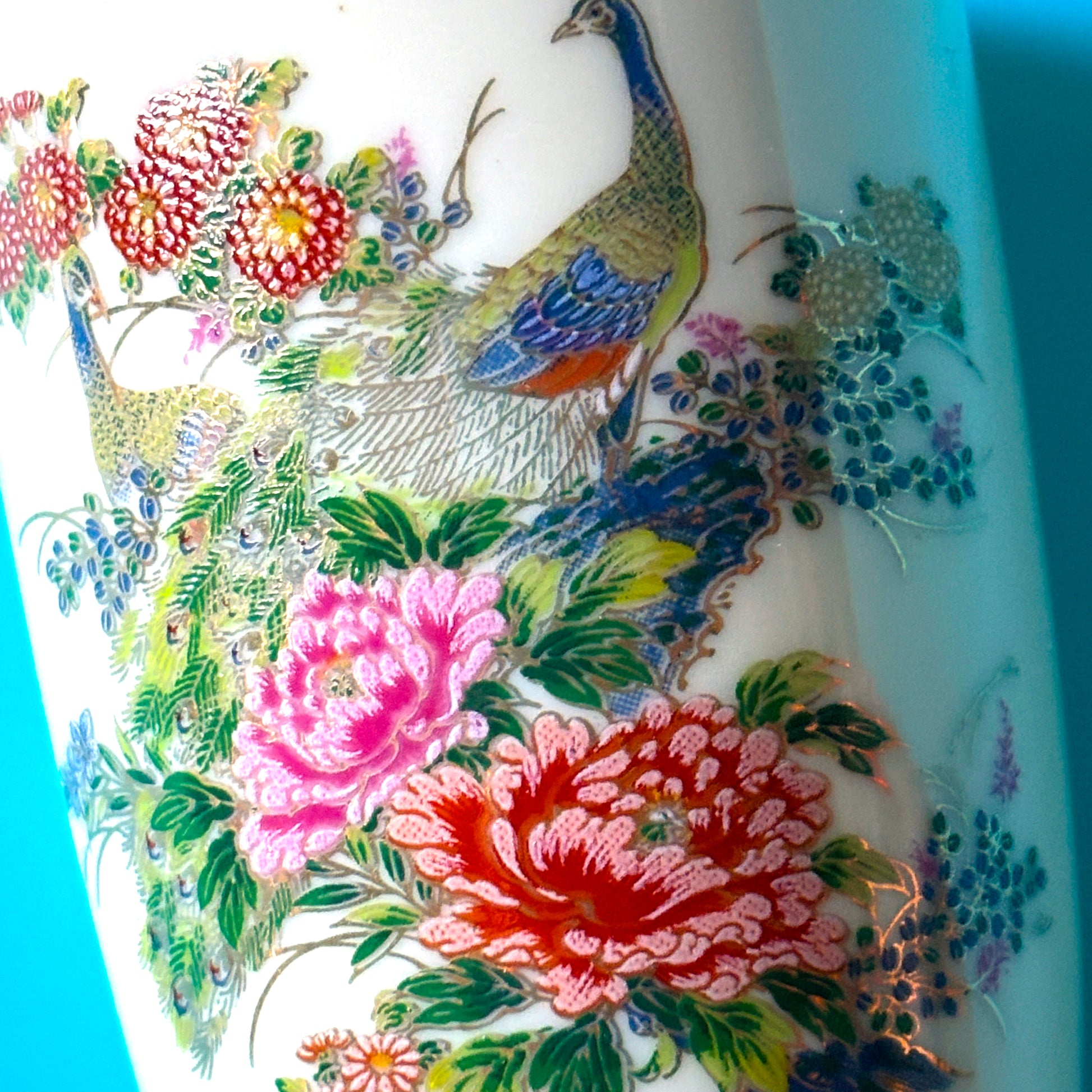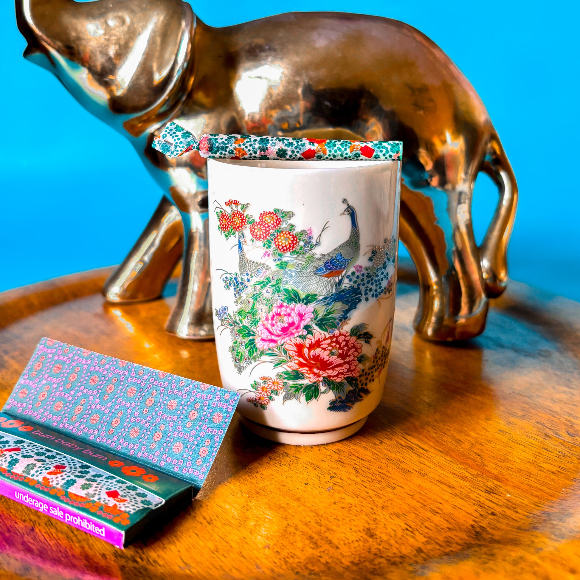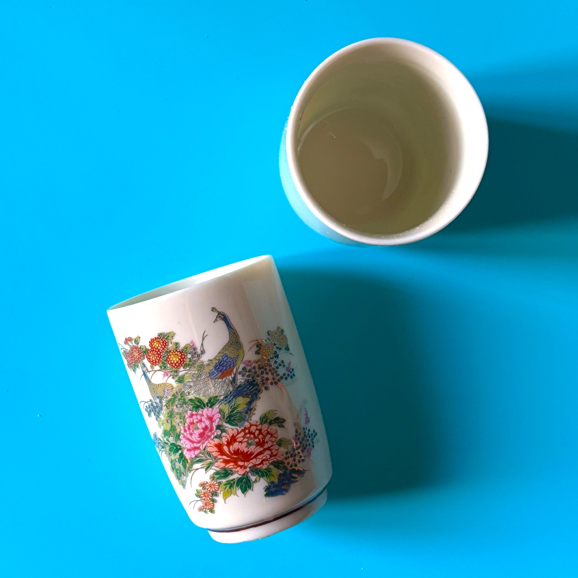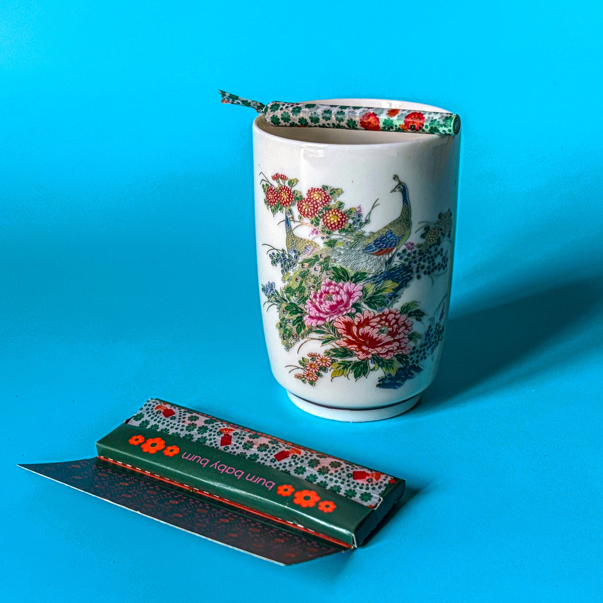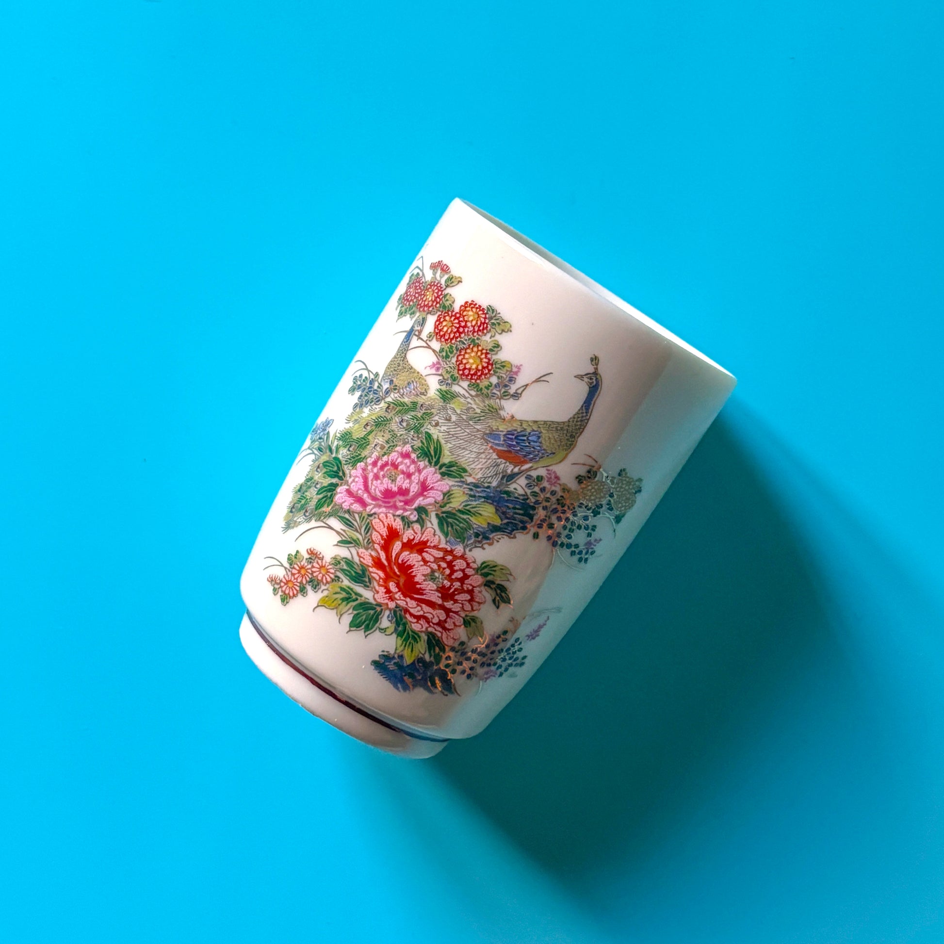 The perfect vessel to collect your ash, tools or jewels. These porcelain pieces are decorated with peacocks, flowers and other greenery. Hand painted in blue, black, red and pink.