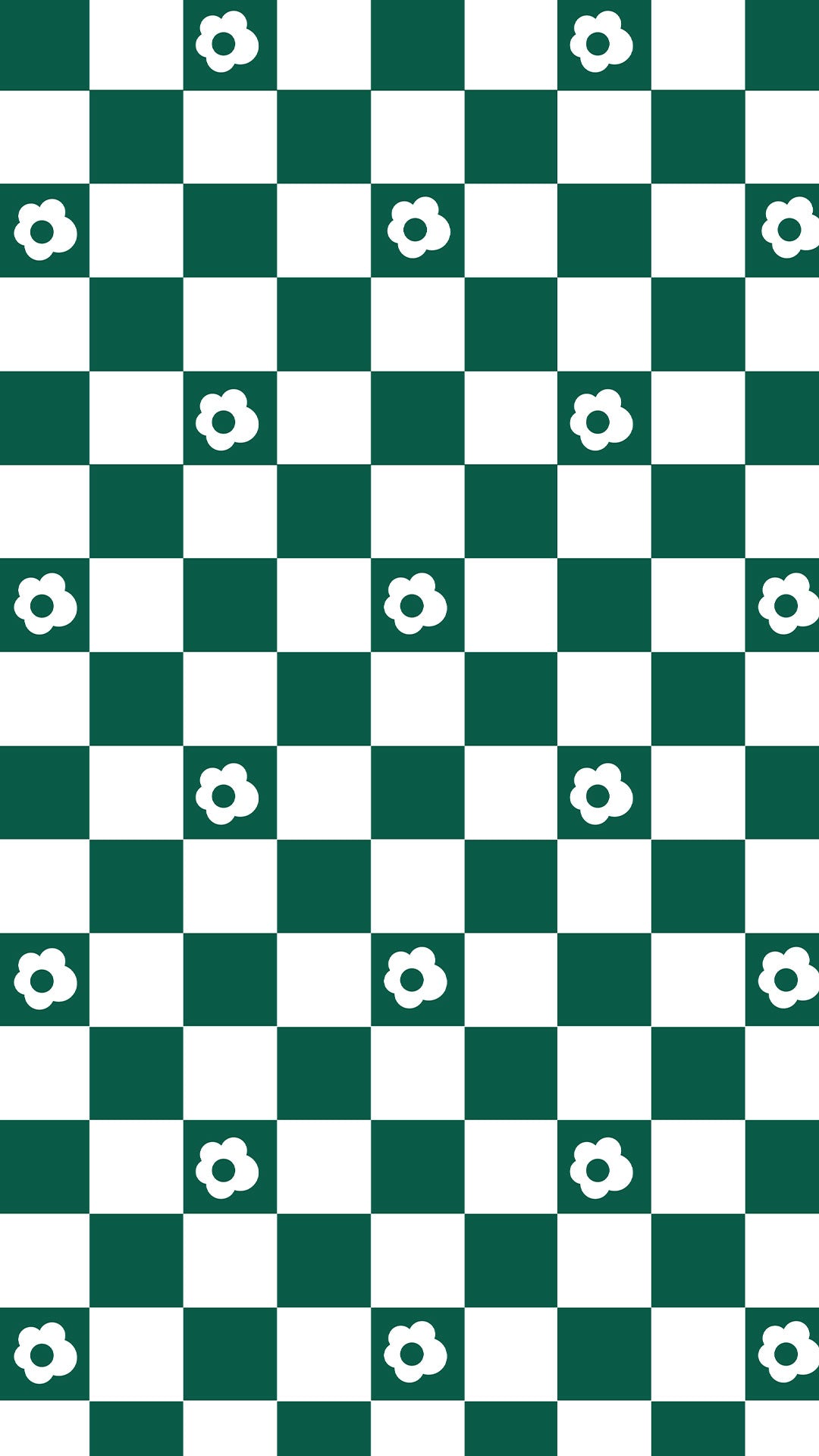 Downloadable wallpaper featuring a hunter green and white checkerboard pattern with white flowers 🫶