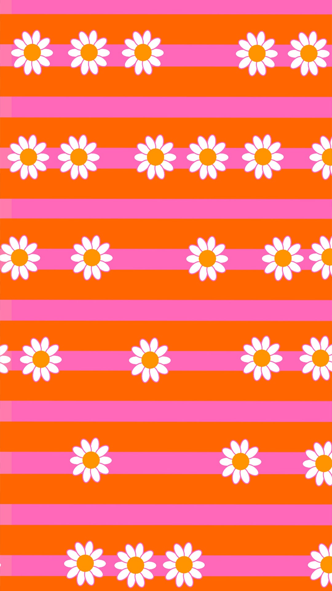 Downloadable wallpaper featuring white daisies on an orange and pink striped background.