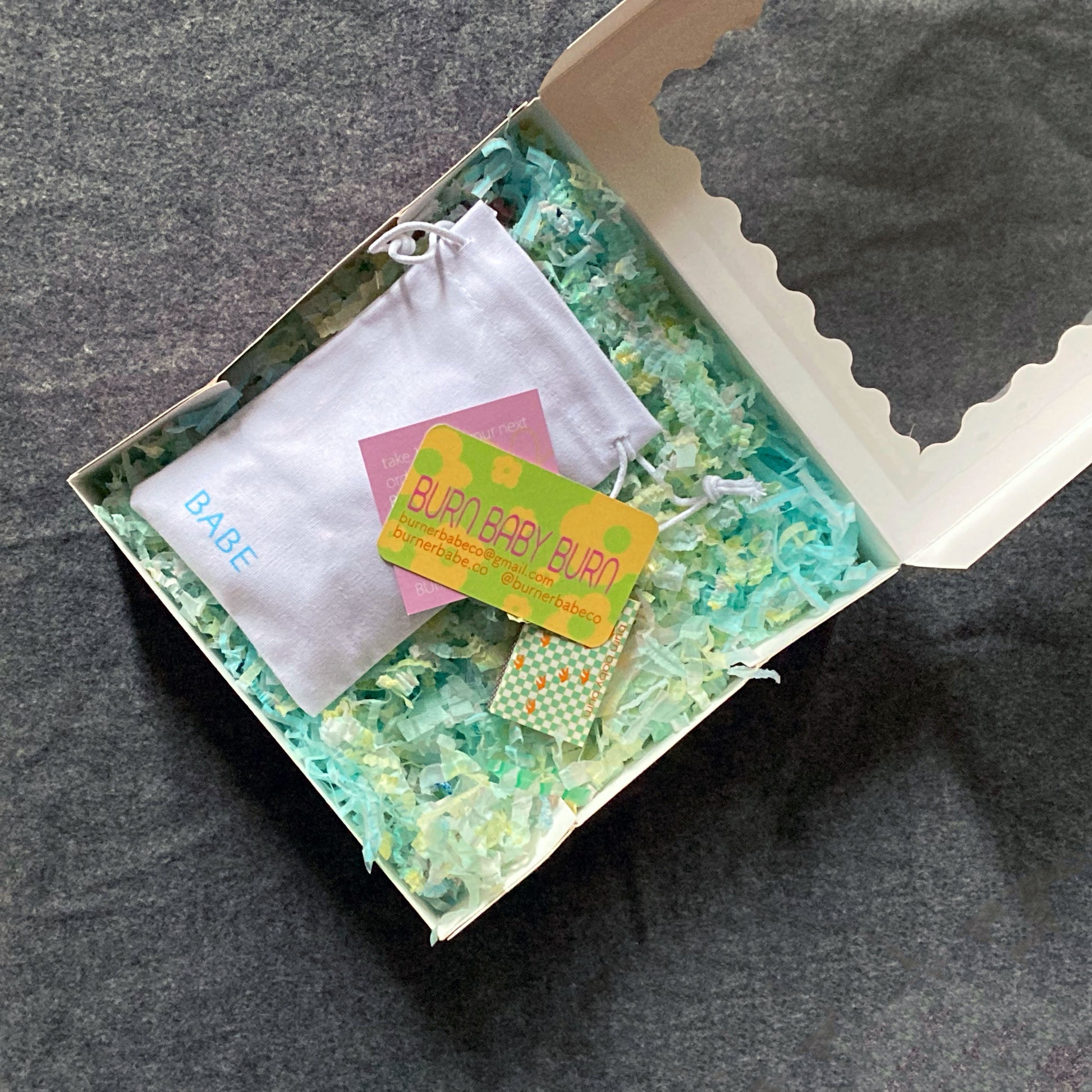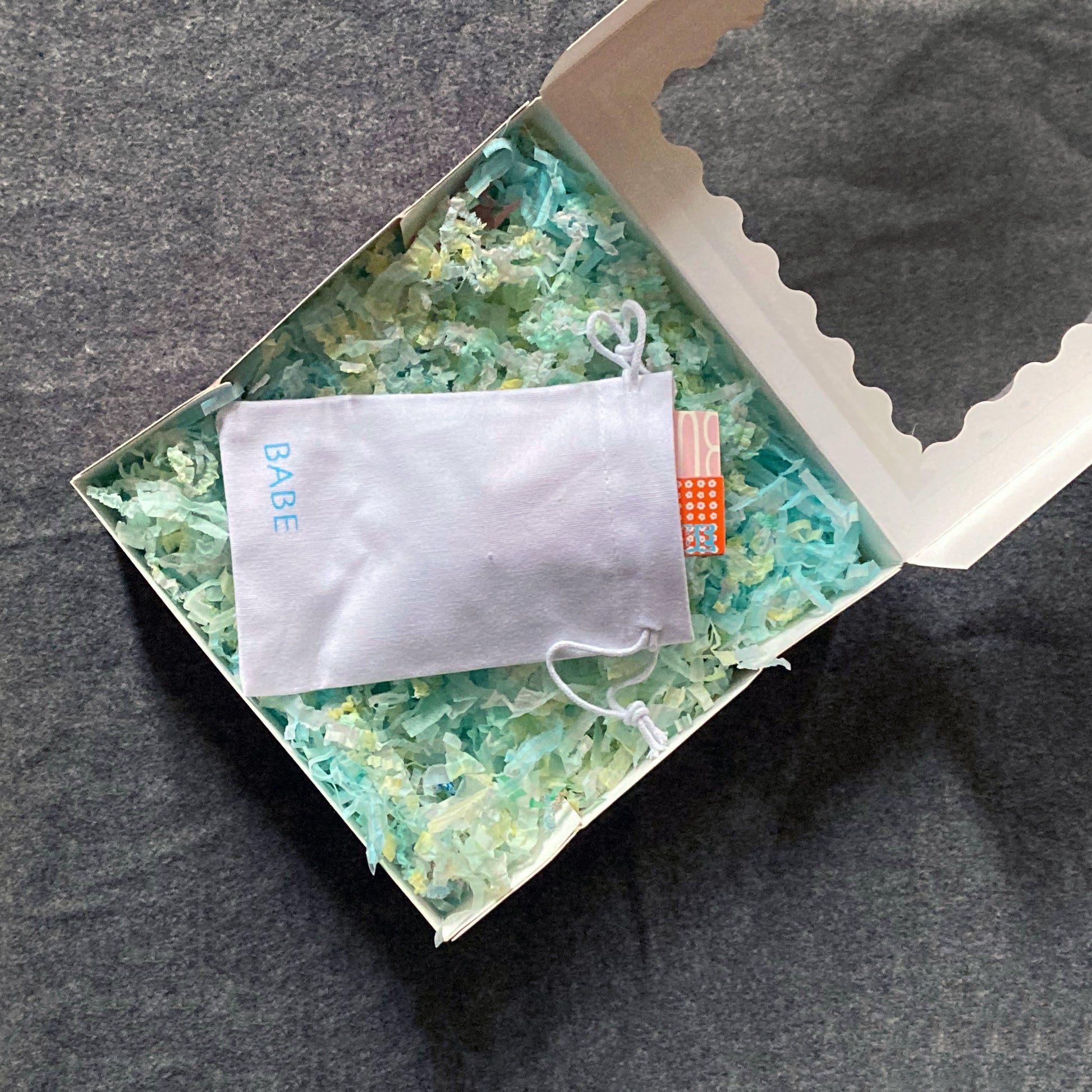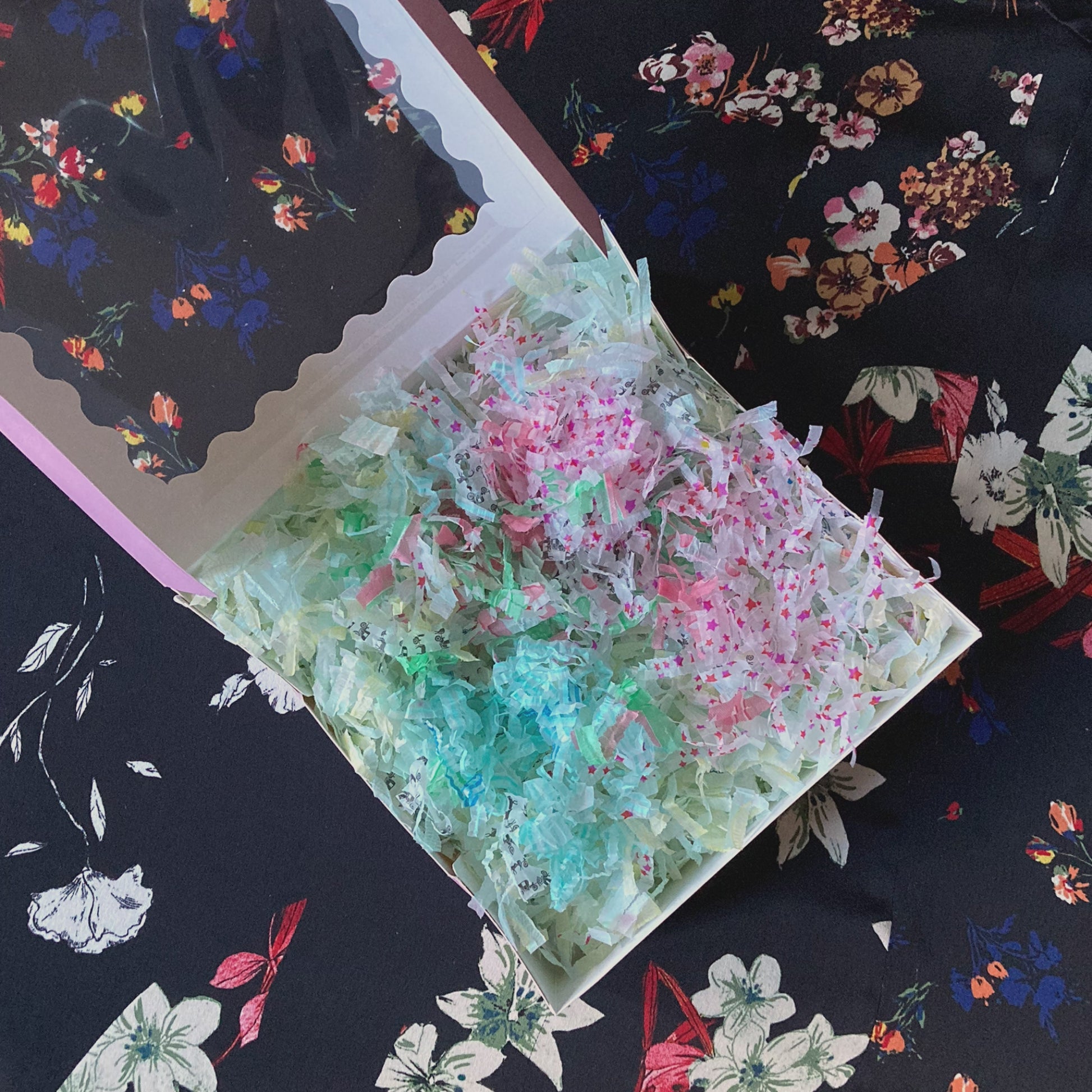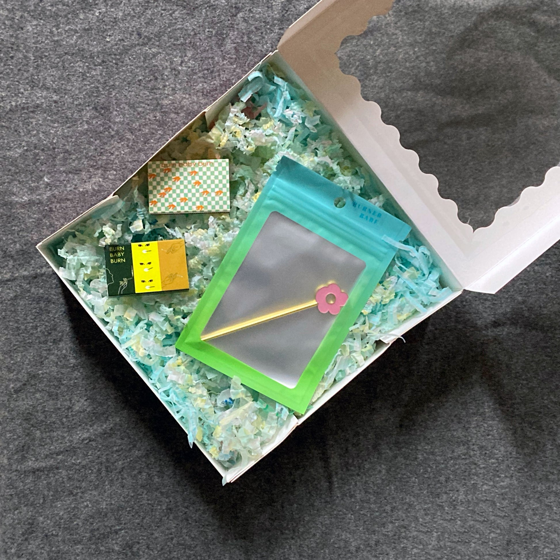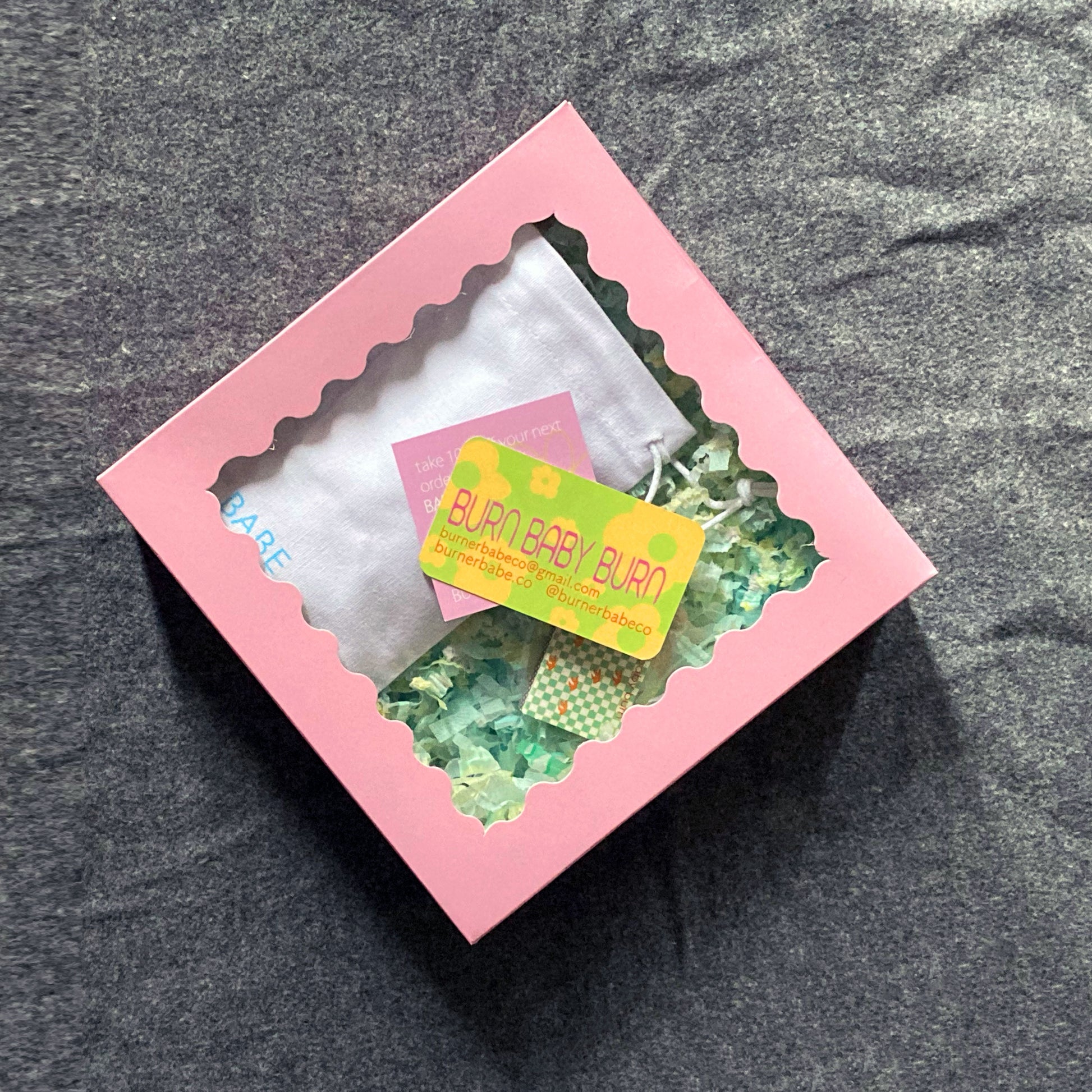 Gifts arrive cushioned on a bed of shredded paper, and are packaged in a pink scalloped-edge box with a viewing window 🩷